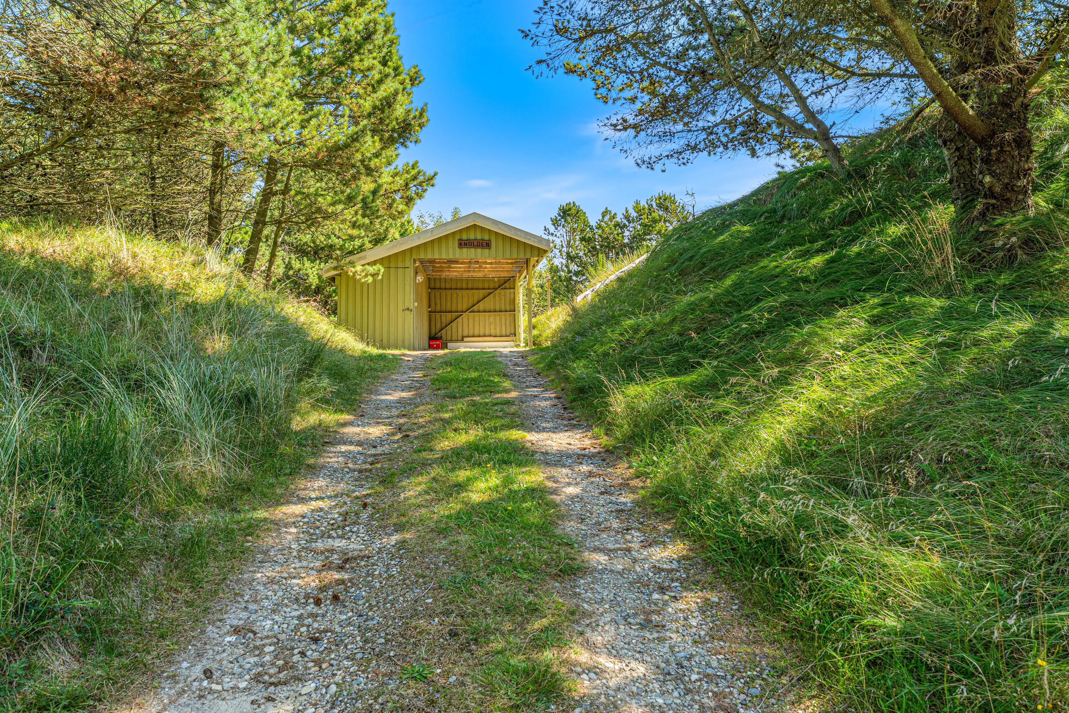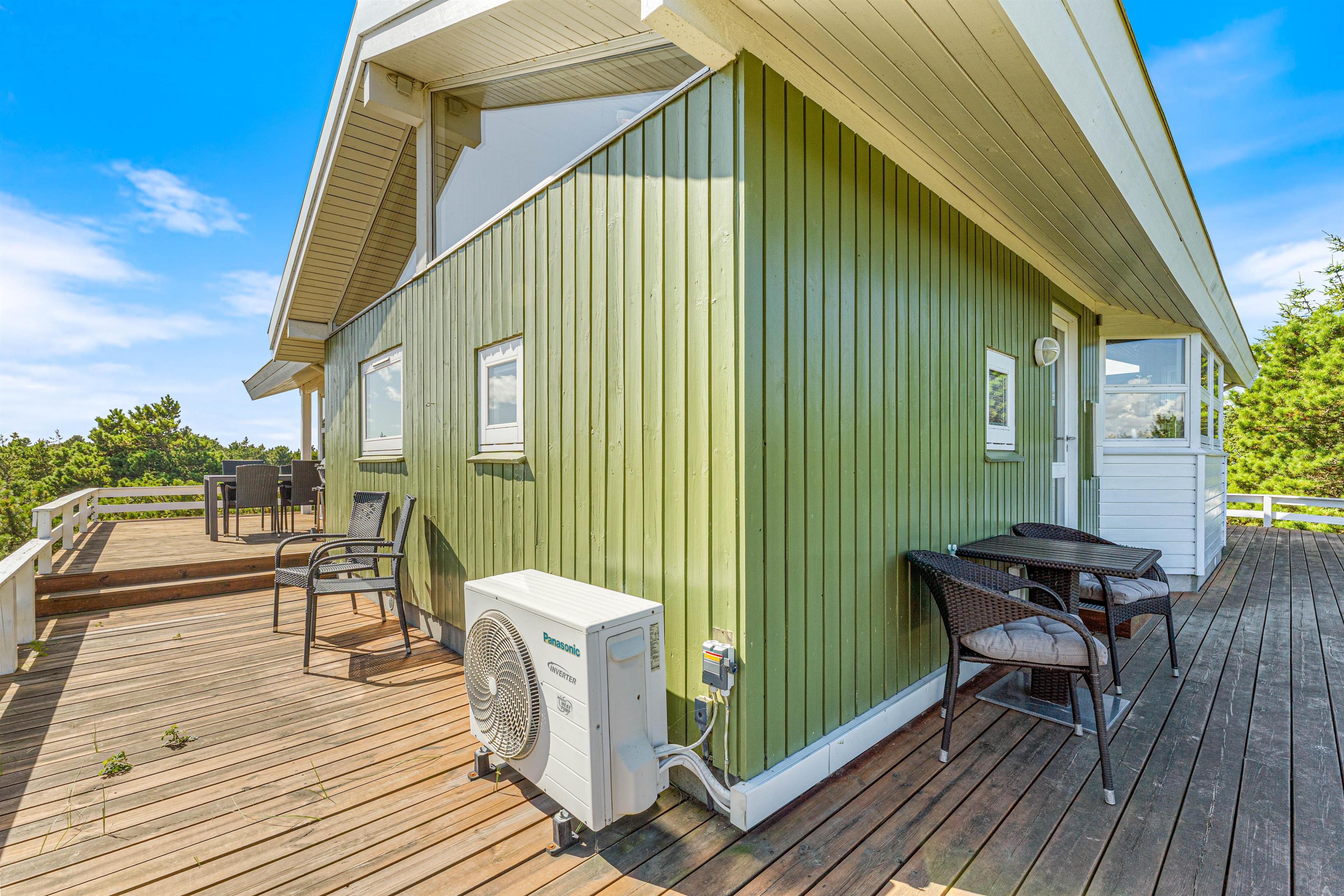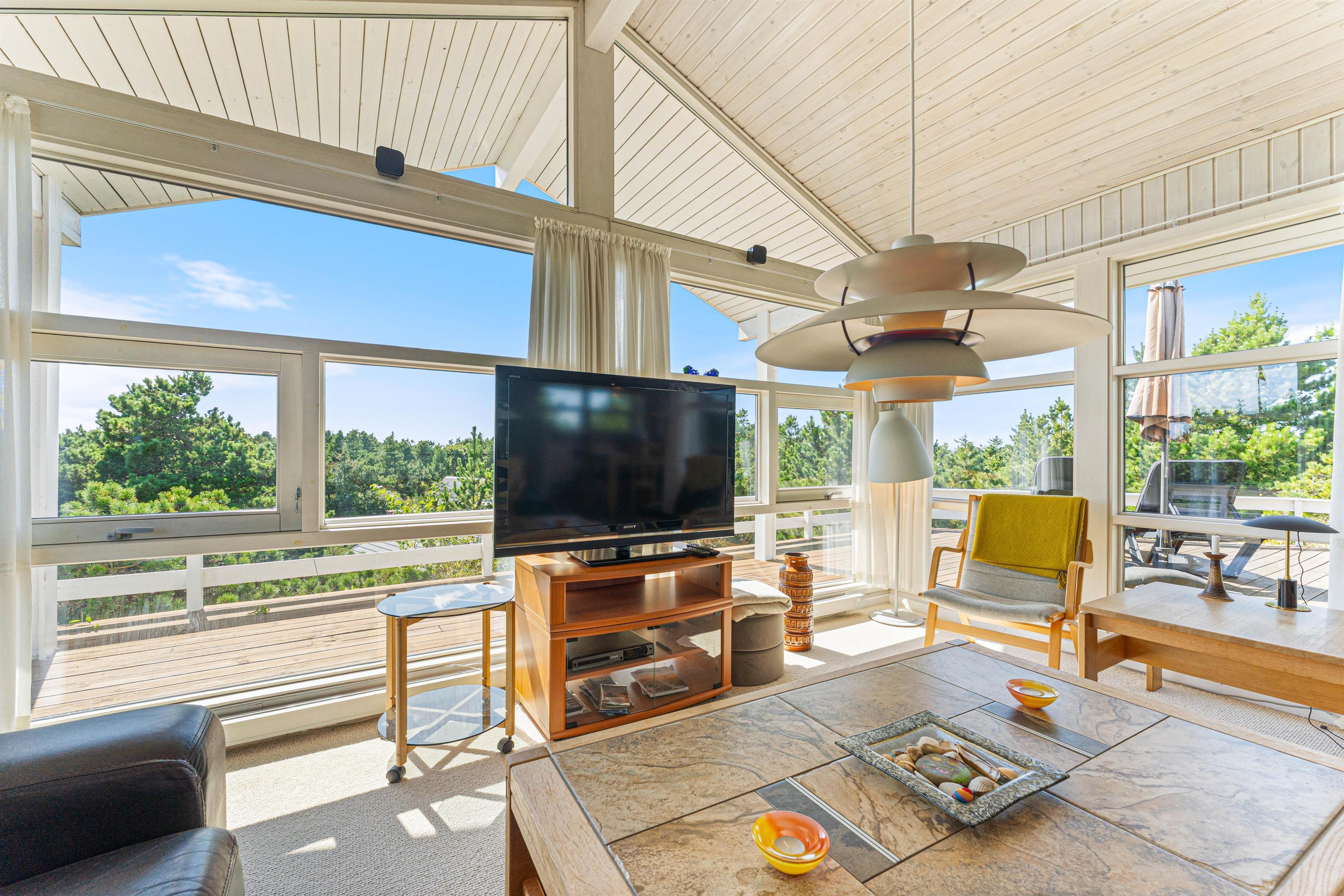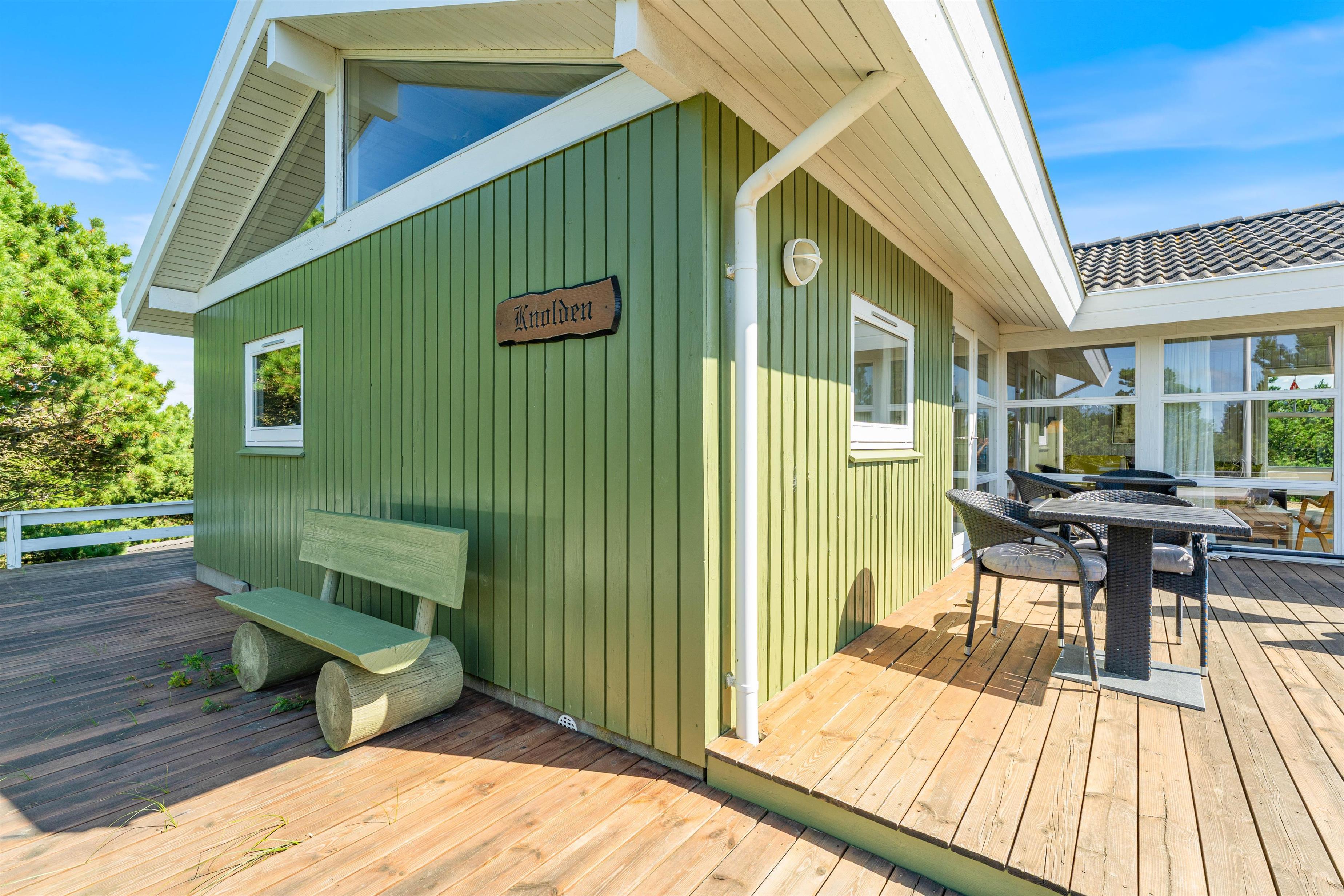 Stil bilen i carporten, inden I tager trappen op til feriehuset. Når I ankommer på terrassen, er feriestemningen sat! Her er udsigten slående, og I kan rigtigt fornemme områdets duft af Vesterhavet og fyrretræer. Terrassen bliver hurtigt omdrejningspunkt for dagens mange aktiviteter. Den er delvist overdækket og praktisk indrettet, så der altid er et hjørne til liggestolene med læ og sol, samtidig med at I har det store udsyn over området.