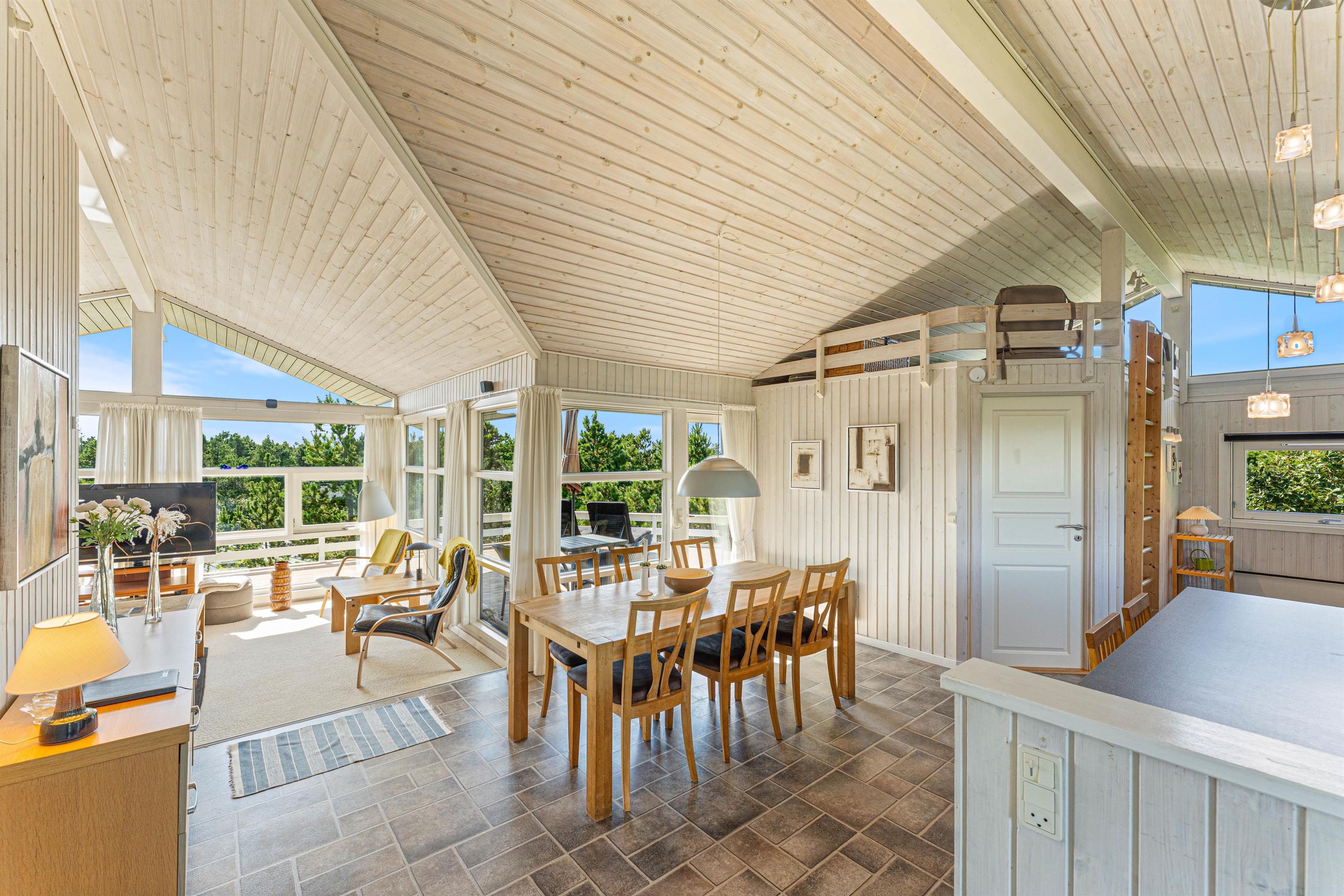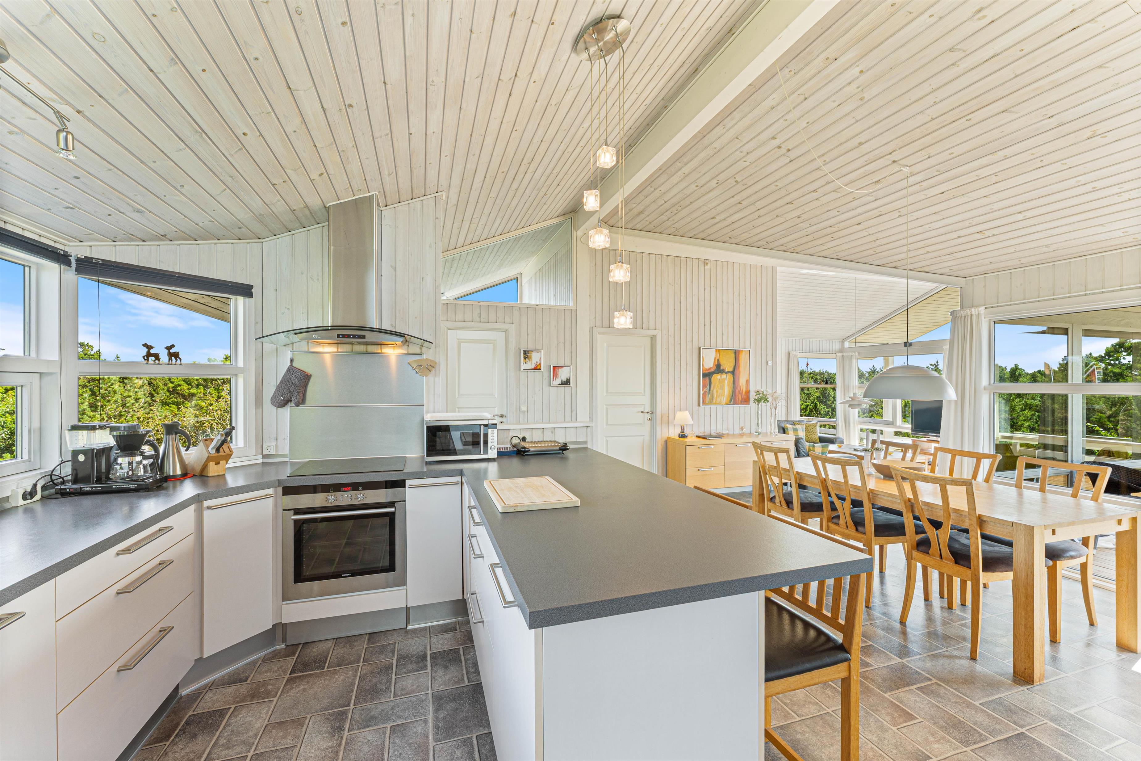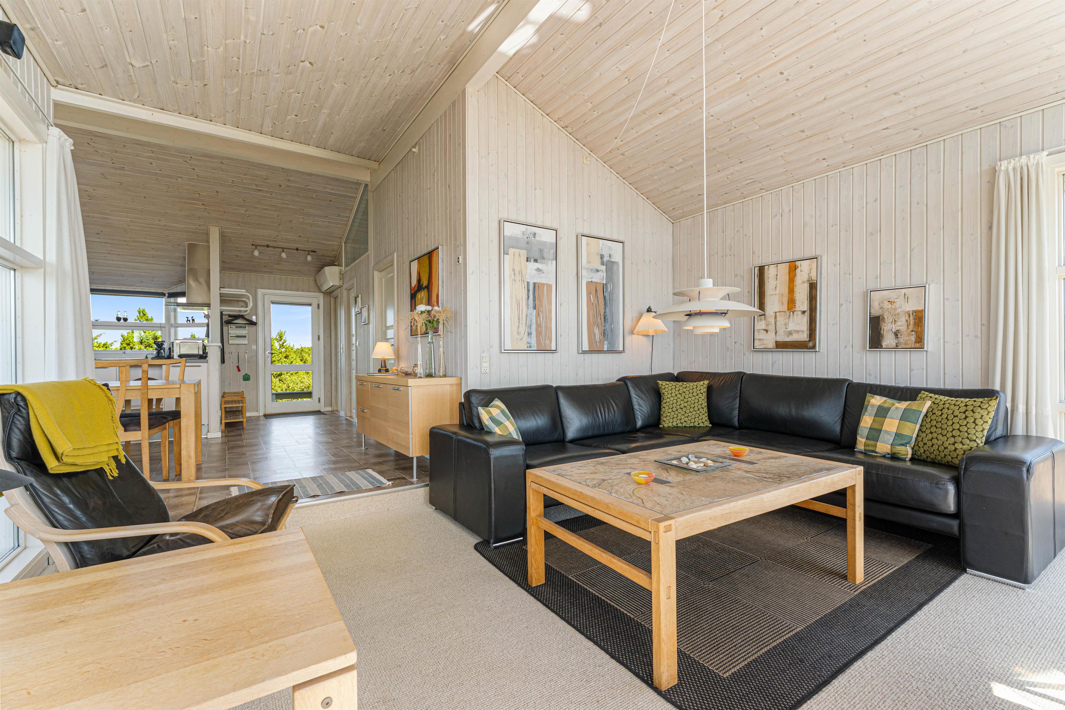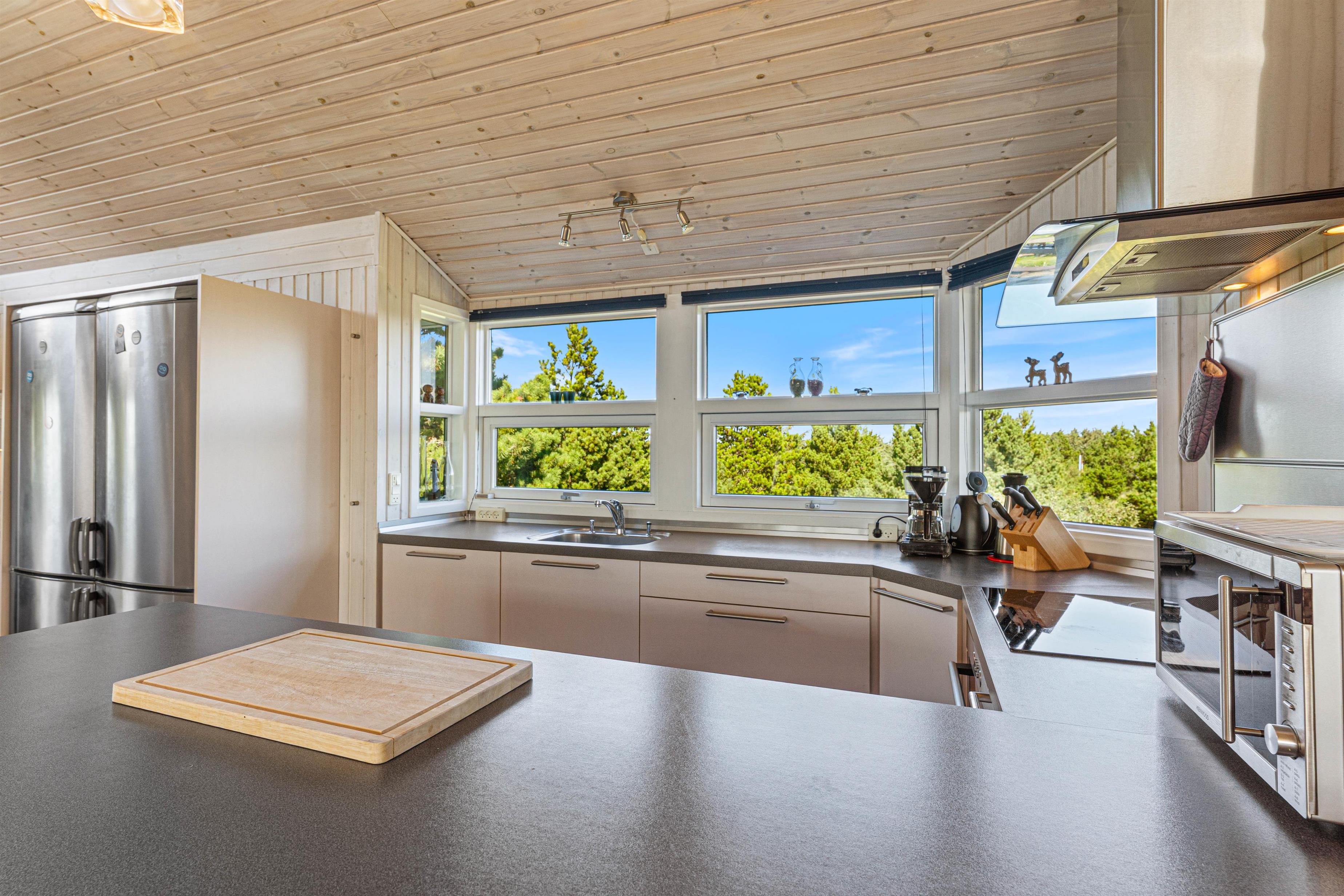Indenfor venter jer et sommerhus med et fantastisk lysindfald og udsigt til alle sider. Fra den magelige hjørnesofa kan I nyde himlens mange forskellige farver og stemninger hen over dagen. Stuen er åben til det store lyse køkken med opvaskemaskine og to køleskab med i alt 120 liter fryser. Alt dette indbyder til fællesskab omkring tilberedningen af lækre måltider, der efterfølgende kan nydes rundt om spisebordet eller på terrassen i solnedgangens skær.
