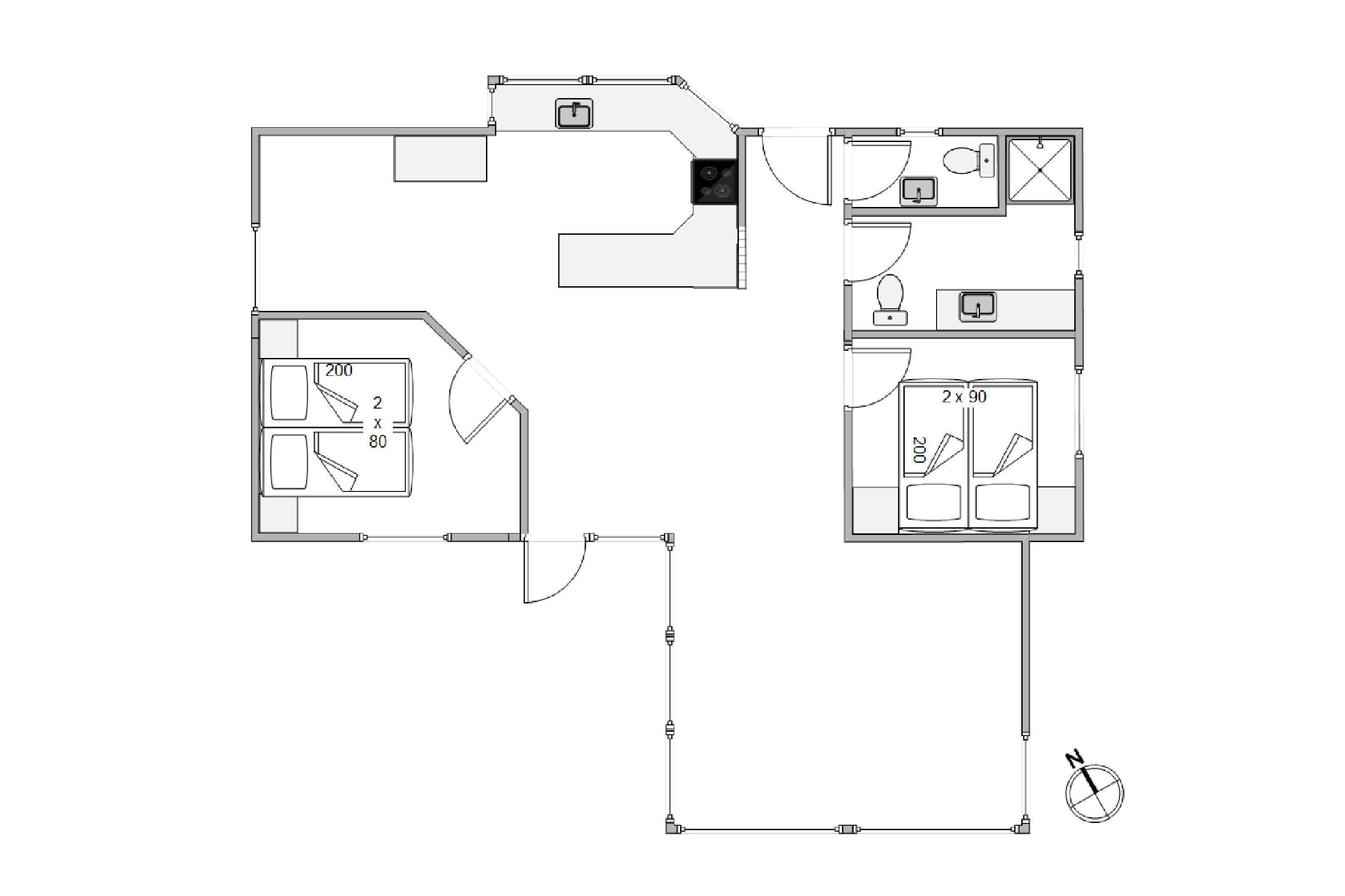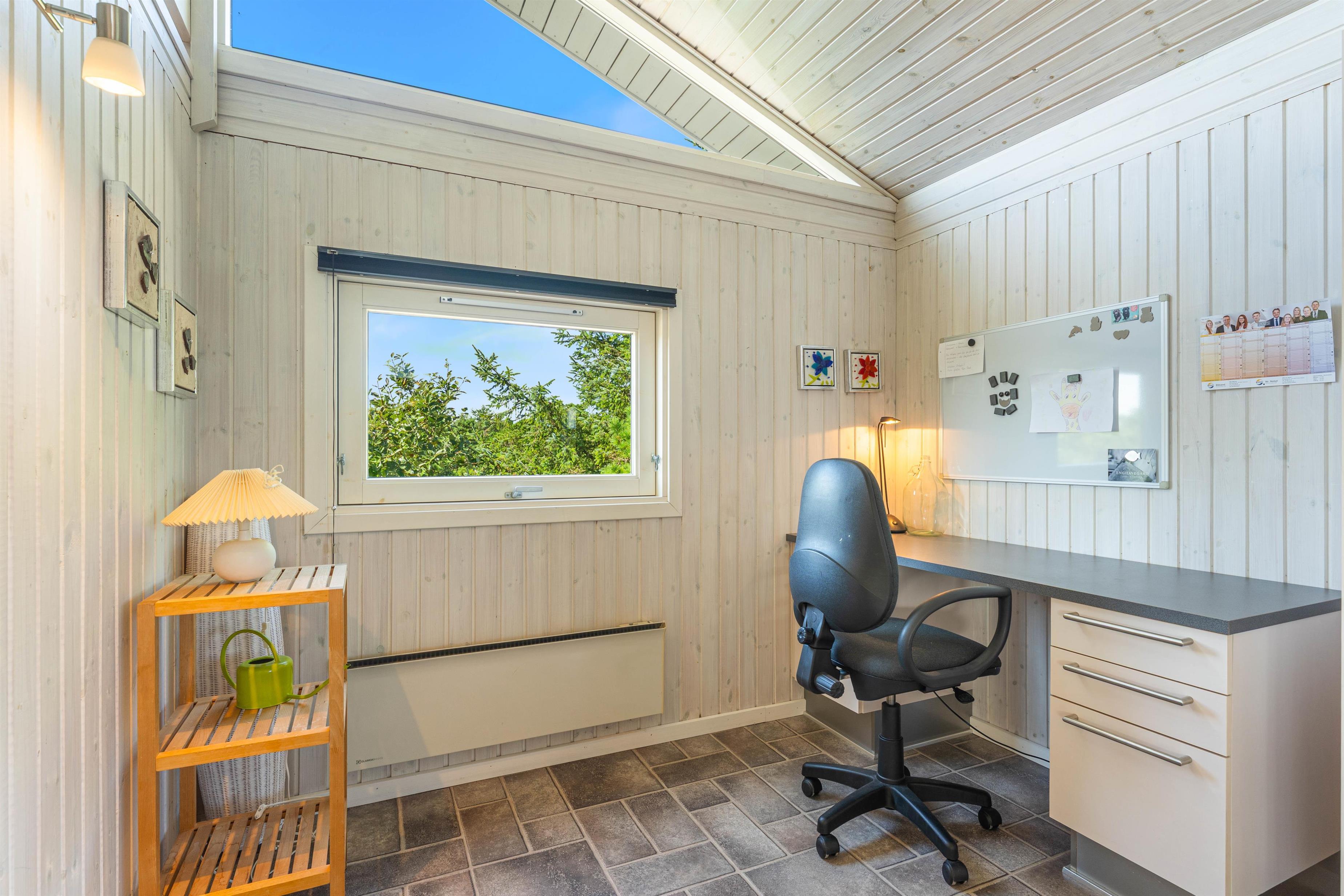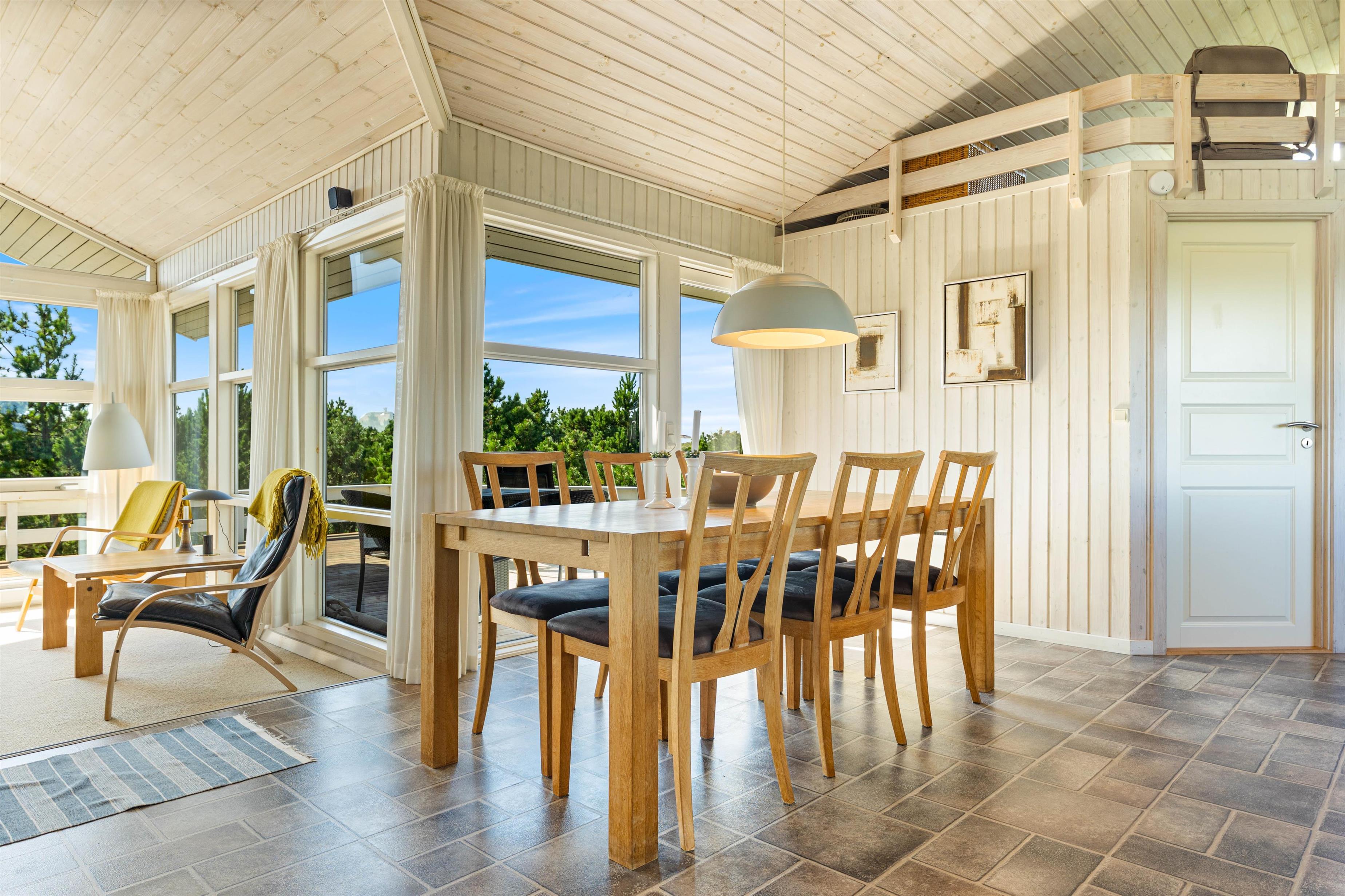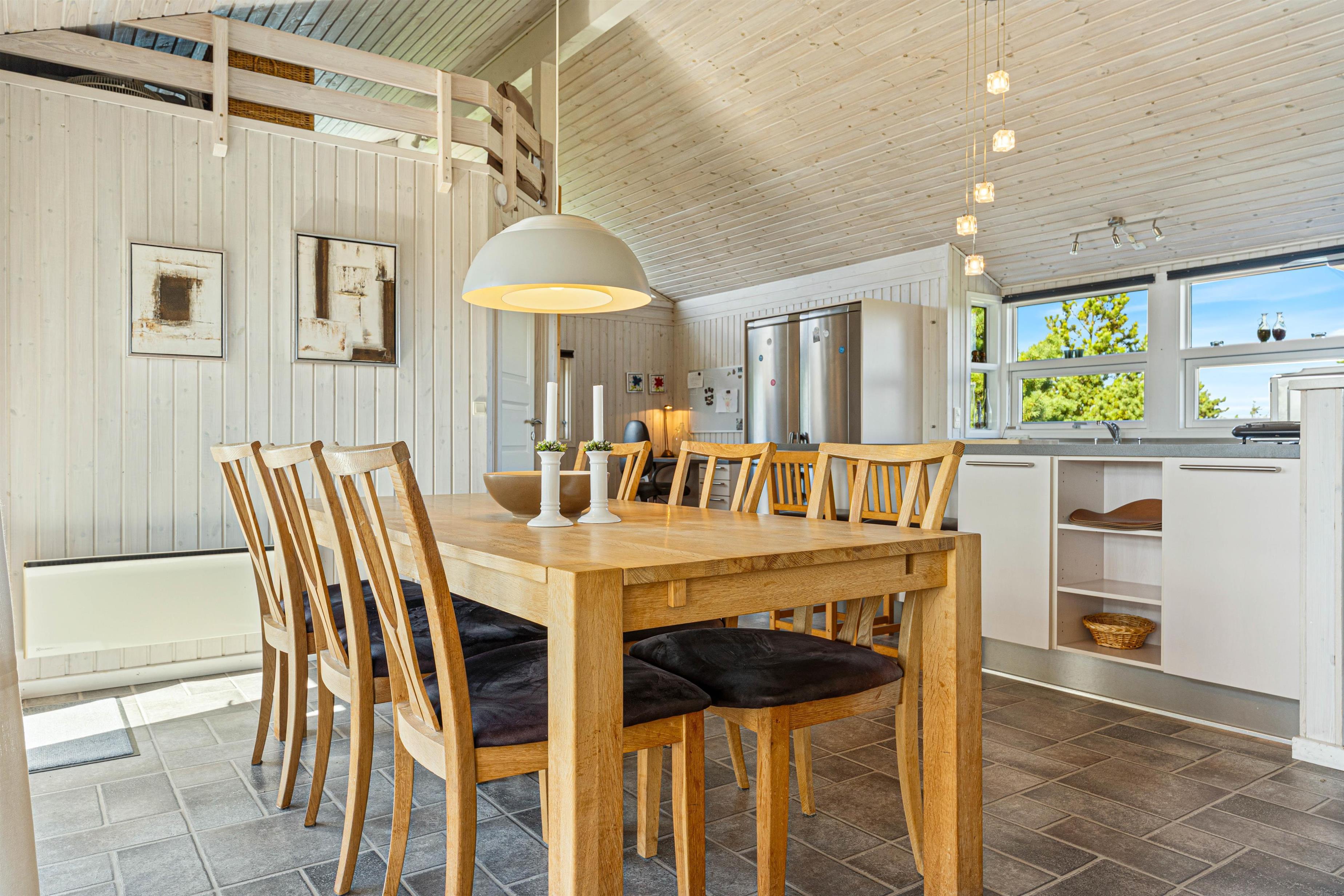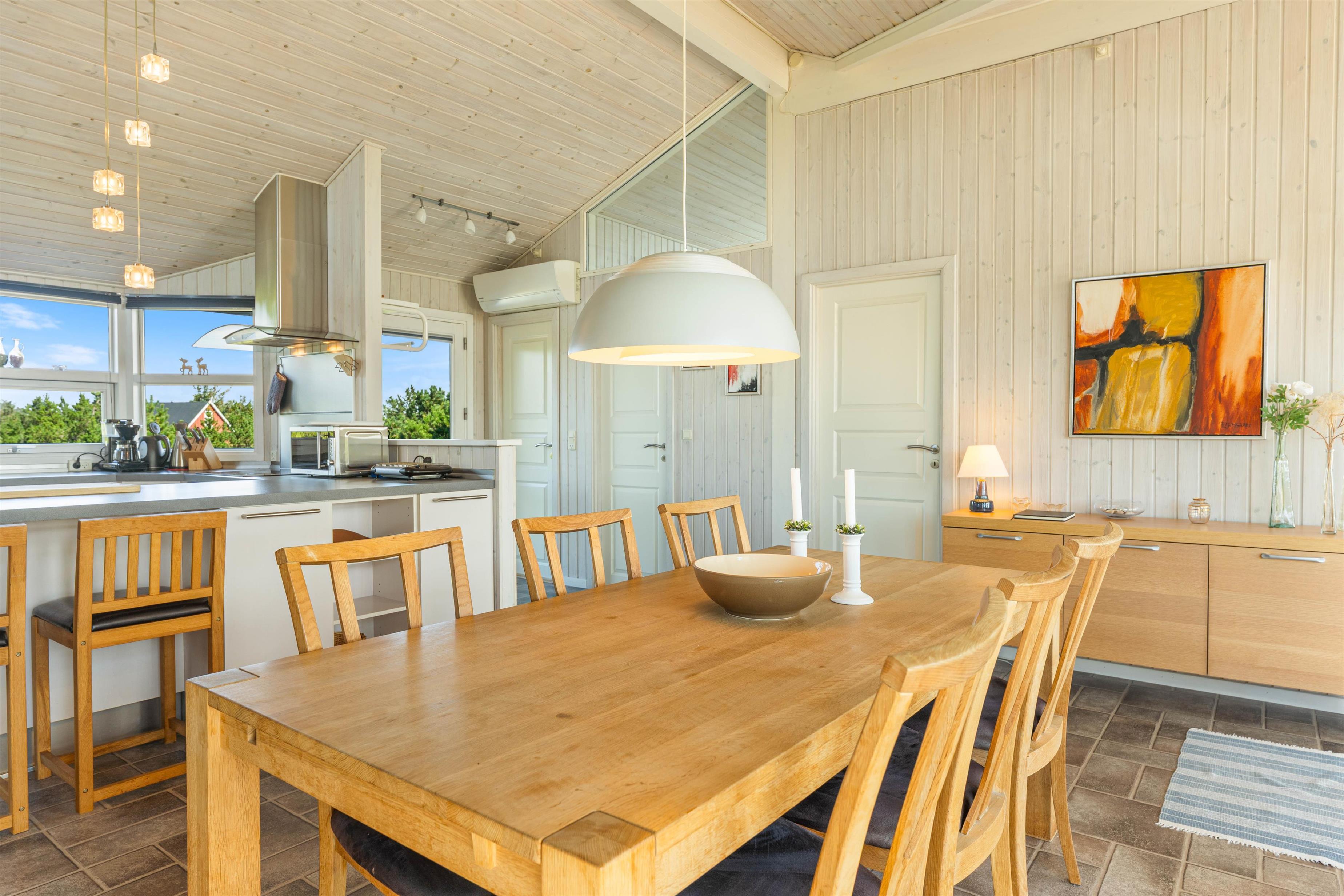 Indenfor venter jer et sommerhus med et fantastisk lysindfald og udsigt til alle sider. Fra den magelige hjørnesofa kan I nyde himlens mange forskellige farver og stemninger hen over dagen. Stuen er åben til det store lyse køkken med opvaskemaskine og to køleskab med i alt 120 liter fryser. Alt dette indbyder til fællesskab omkring tilberedningen af lækre måltider, der efterfølgende kan nydes rundt om spisebordet eller på terrassen i solnedgangens skær.