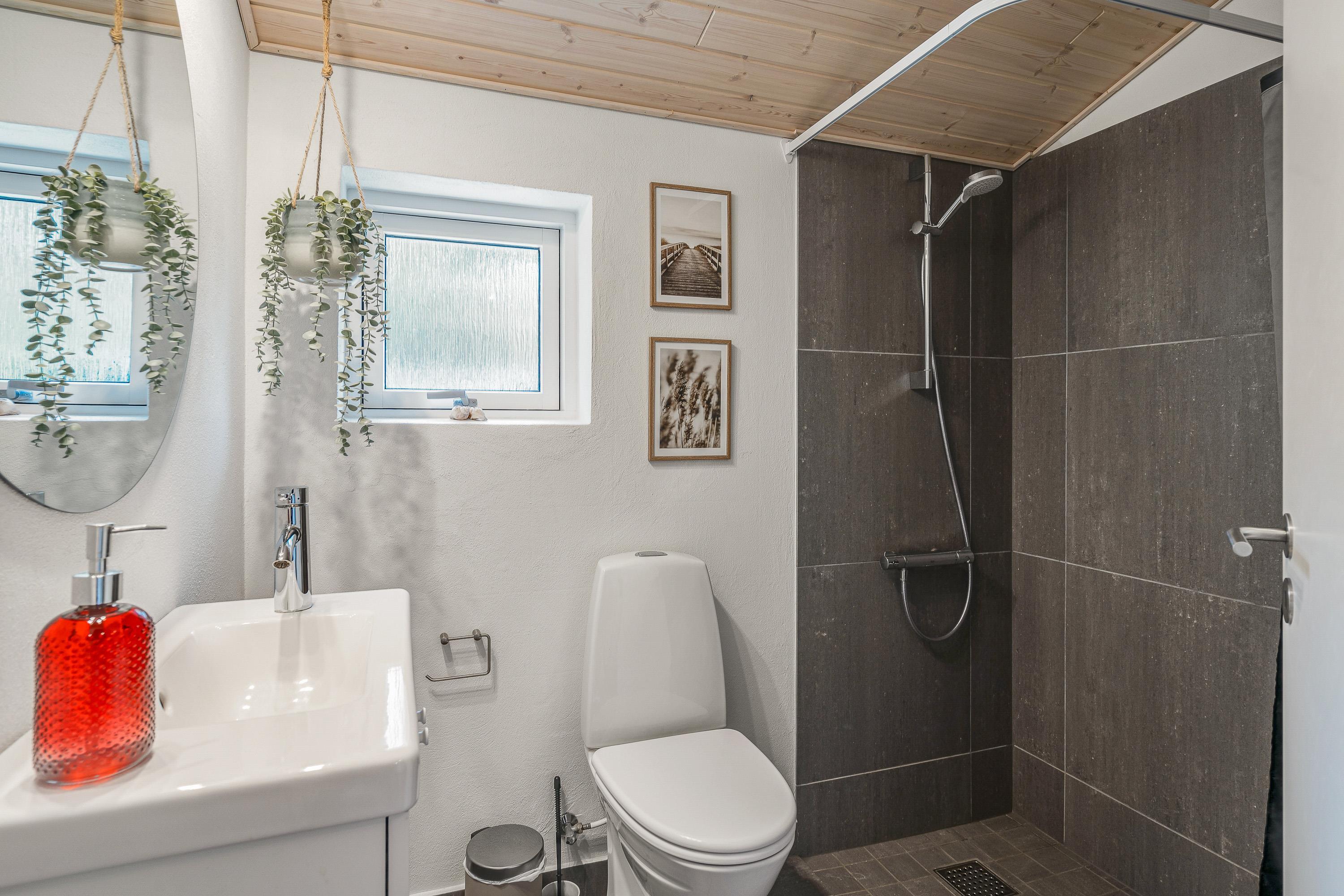 Det 129 kvadratmeter store sommerhus har en indretning, der er særdeles praktisk, hvis I er 2 familier på ferie sammen, da hver familie her kan få hver sin afdeling. I den ene ende af sommerhuset finder I 2 soveværelser og 1 badeværelse, og i den anden ende af sommerhuset finder I ligeledes 2 soveværelser og 1 badeværelse.