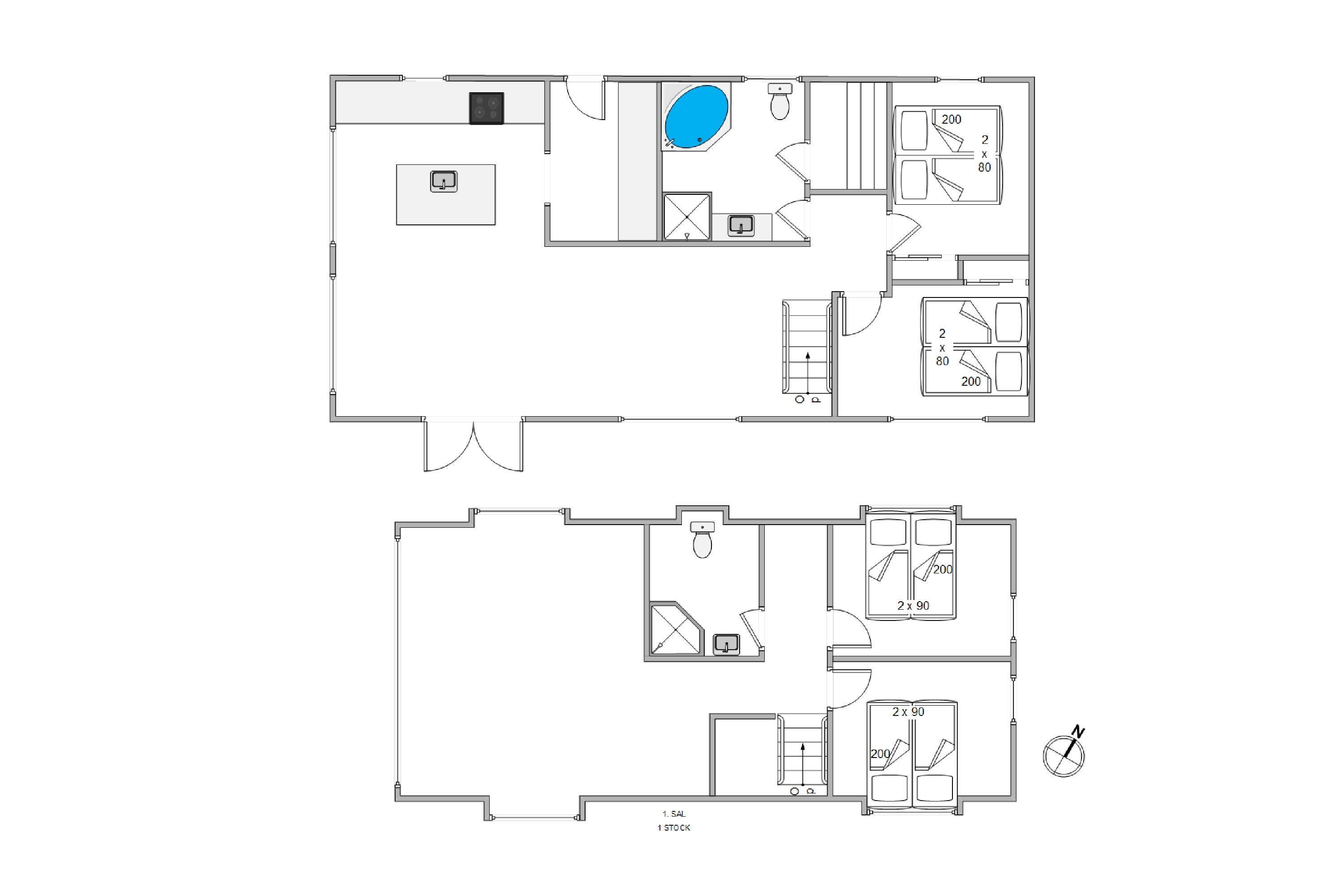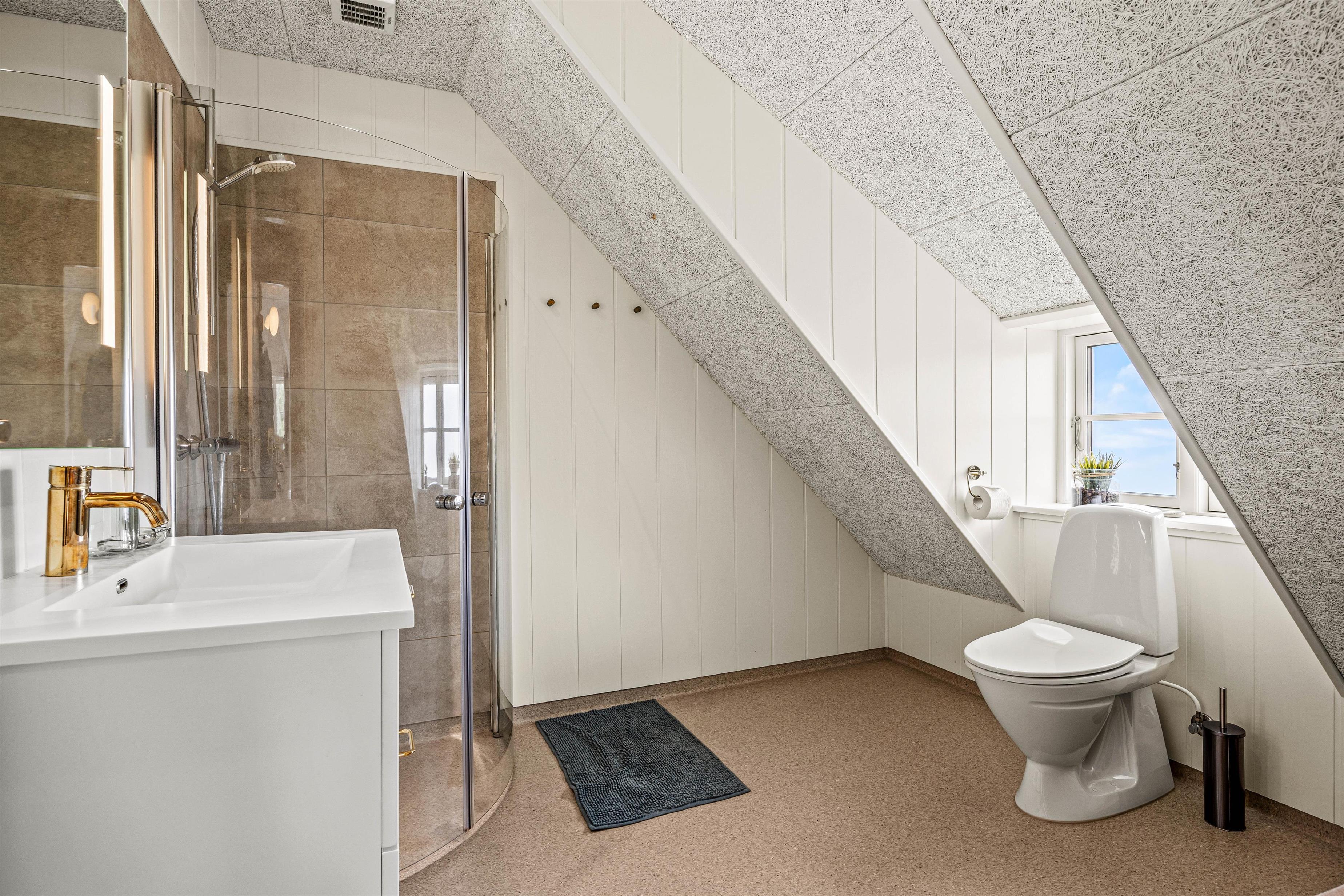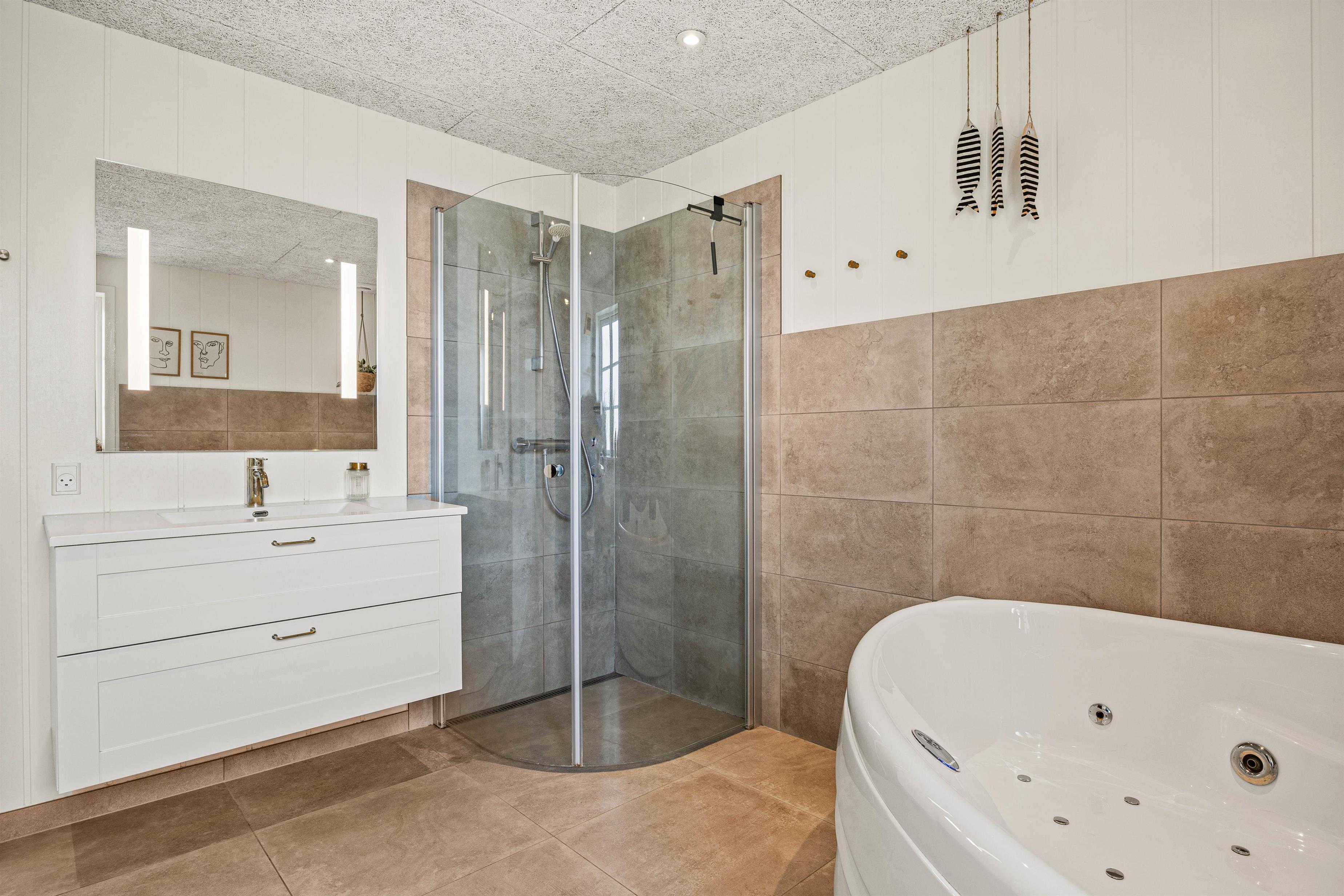 Med 2 badeværelser (med gulvvarme) - ret praktisk et på hver etage - slipper I for lange køer til toilettet om morgenen, og på det ene badeværelse kan I tanke nye kræfter på ferien i saunaen og spabadet.
