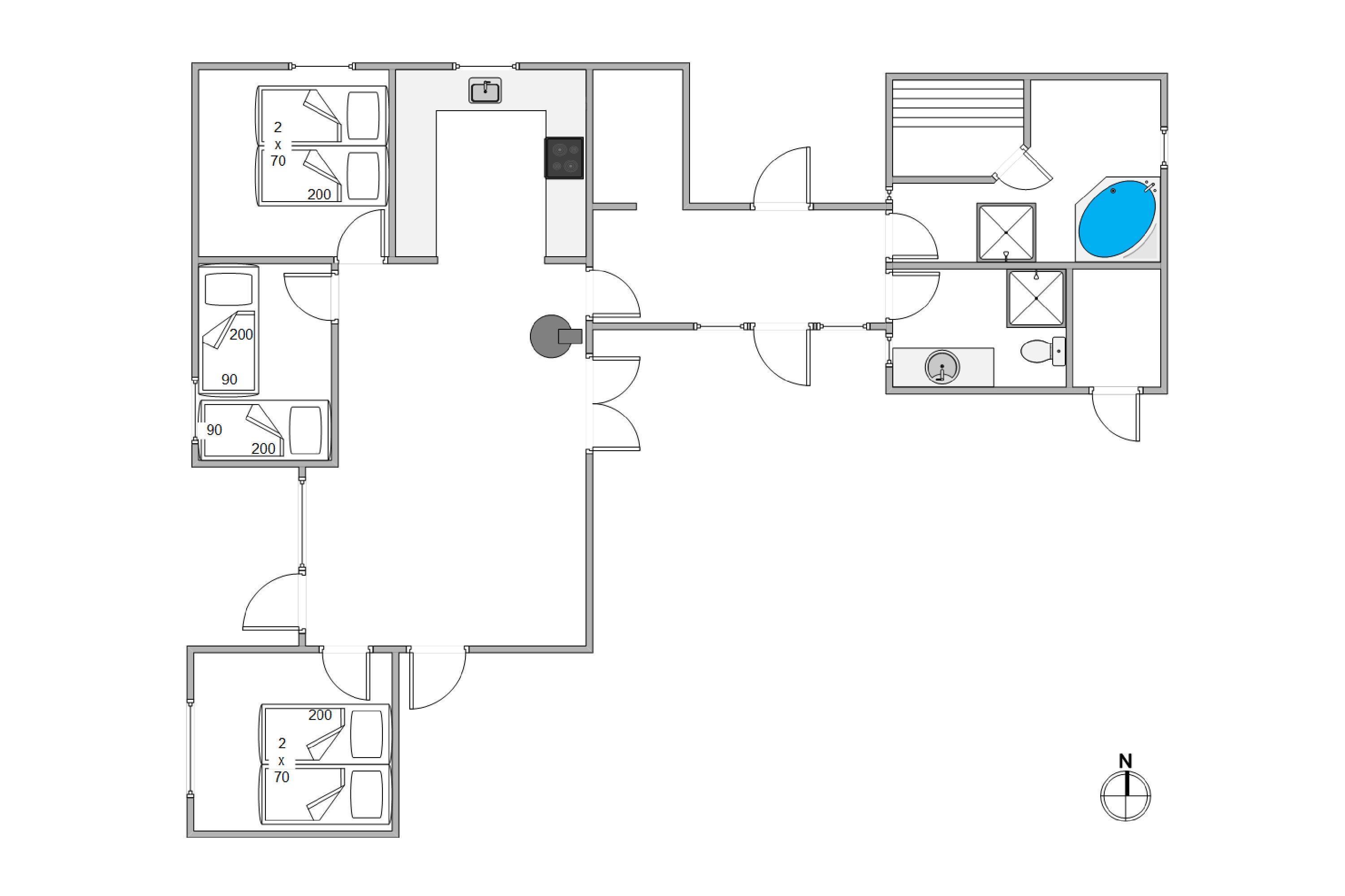 Sovepladserne er fordelt på 3 fine soverum. På det største af badeværelserne finder I en sauna og et spabad, hvor I kan varme jer på de kolde vinterdage eller tanke nye kræfter efter en herlig feriedag ude i den friske luft.