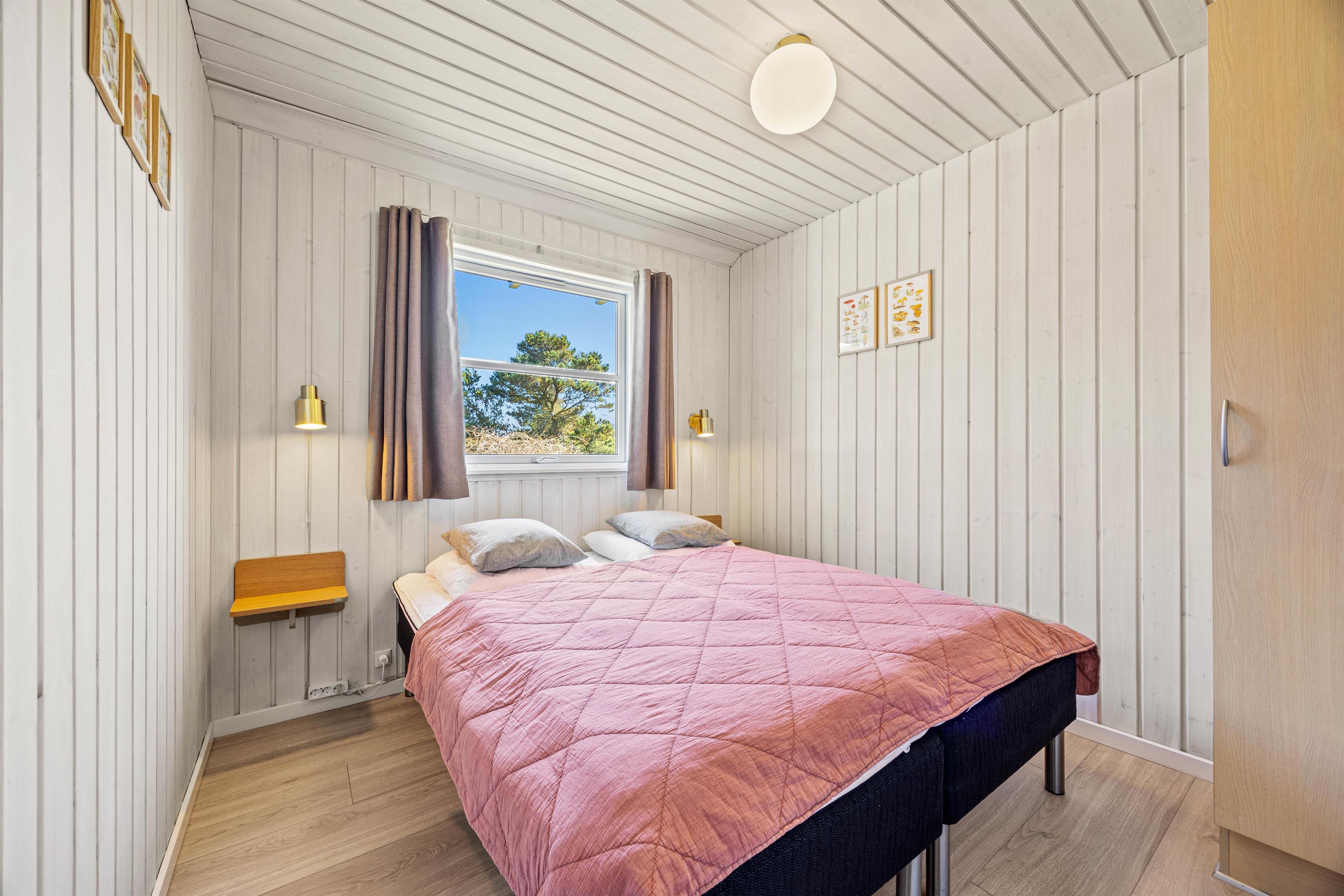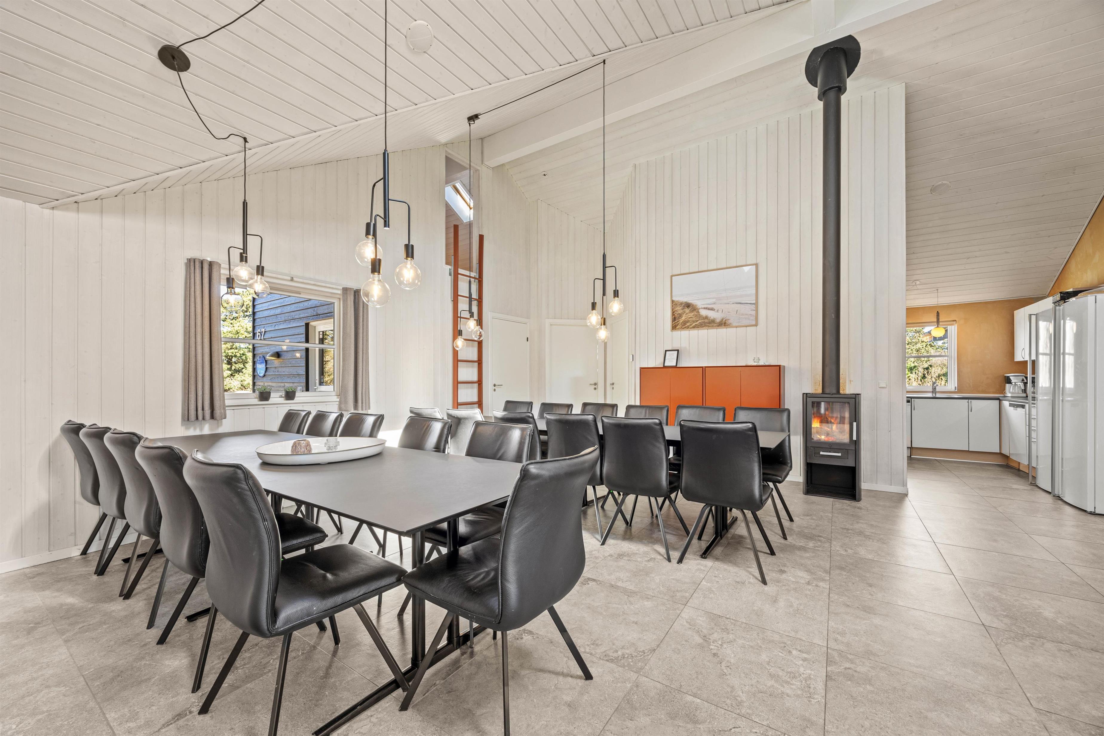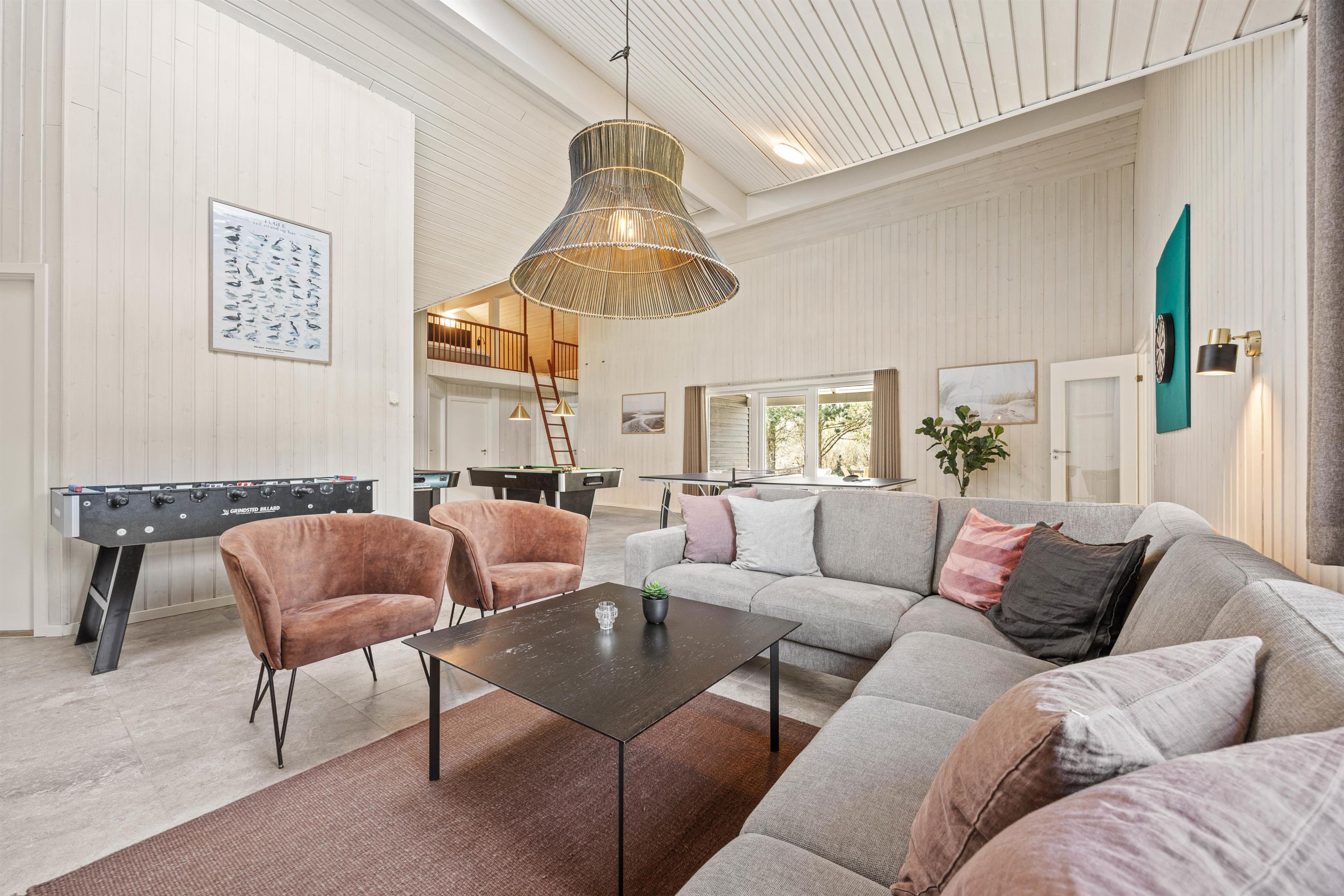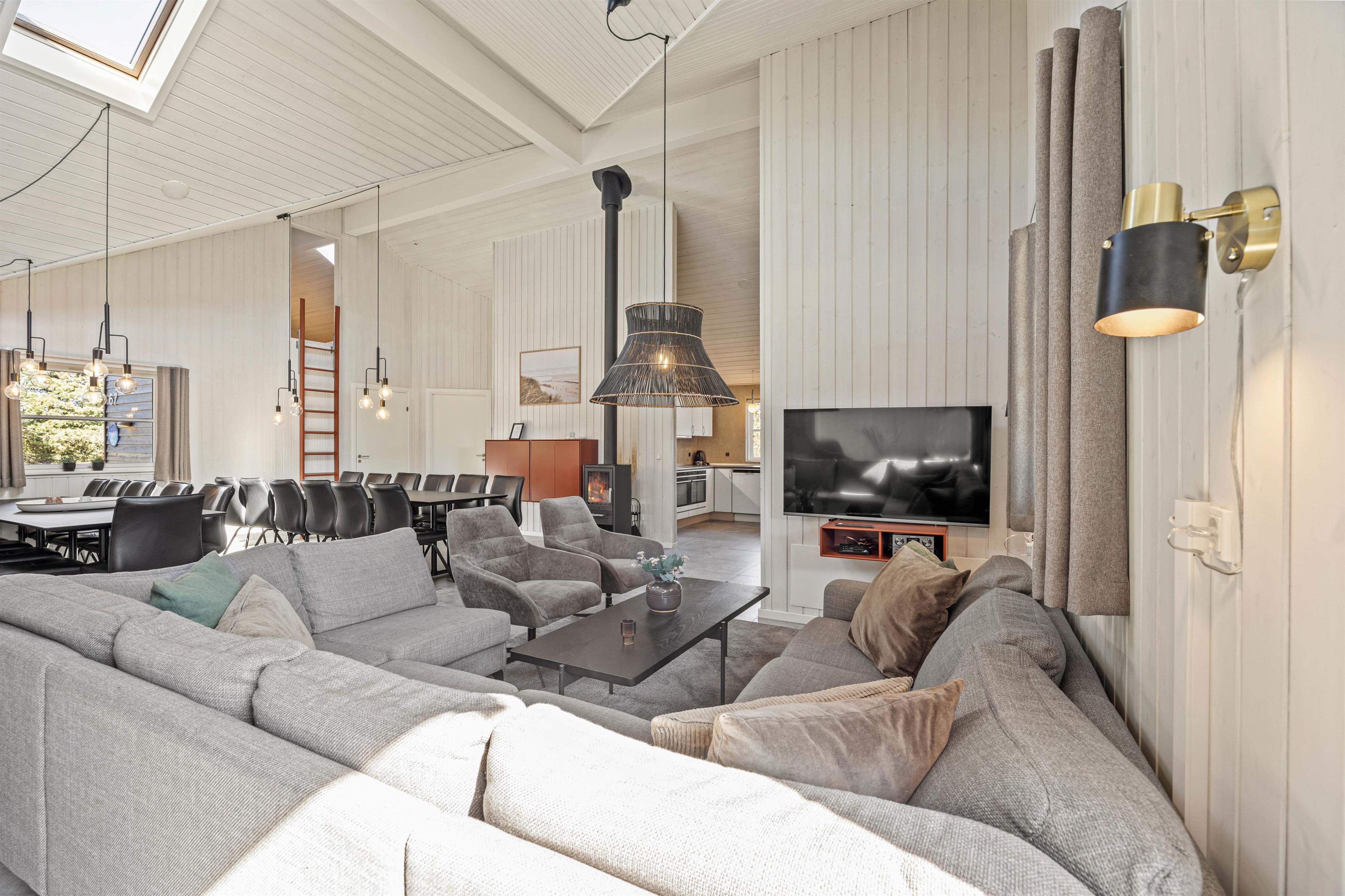 Med i alt 9 smagfuldt indrettede soveværelser og en kombination af 5 dobbeltsenge og 14 enkeltsenge giver sommerhuset i Vejers rigelig plads til op til 24 personer. Bekvemt og komfortabelt kan du slappe af med din familie eller venner i disse indbydende rum. De 4 badeværelser er moderne udstyret, så der opstår ingen ventetider, og alle kan starte friske på dagen. Opholdsområdet kompletteres af en hyggelig brændeovn, der giver behagelig varme på køligere aftener.