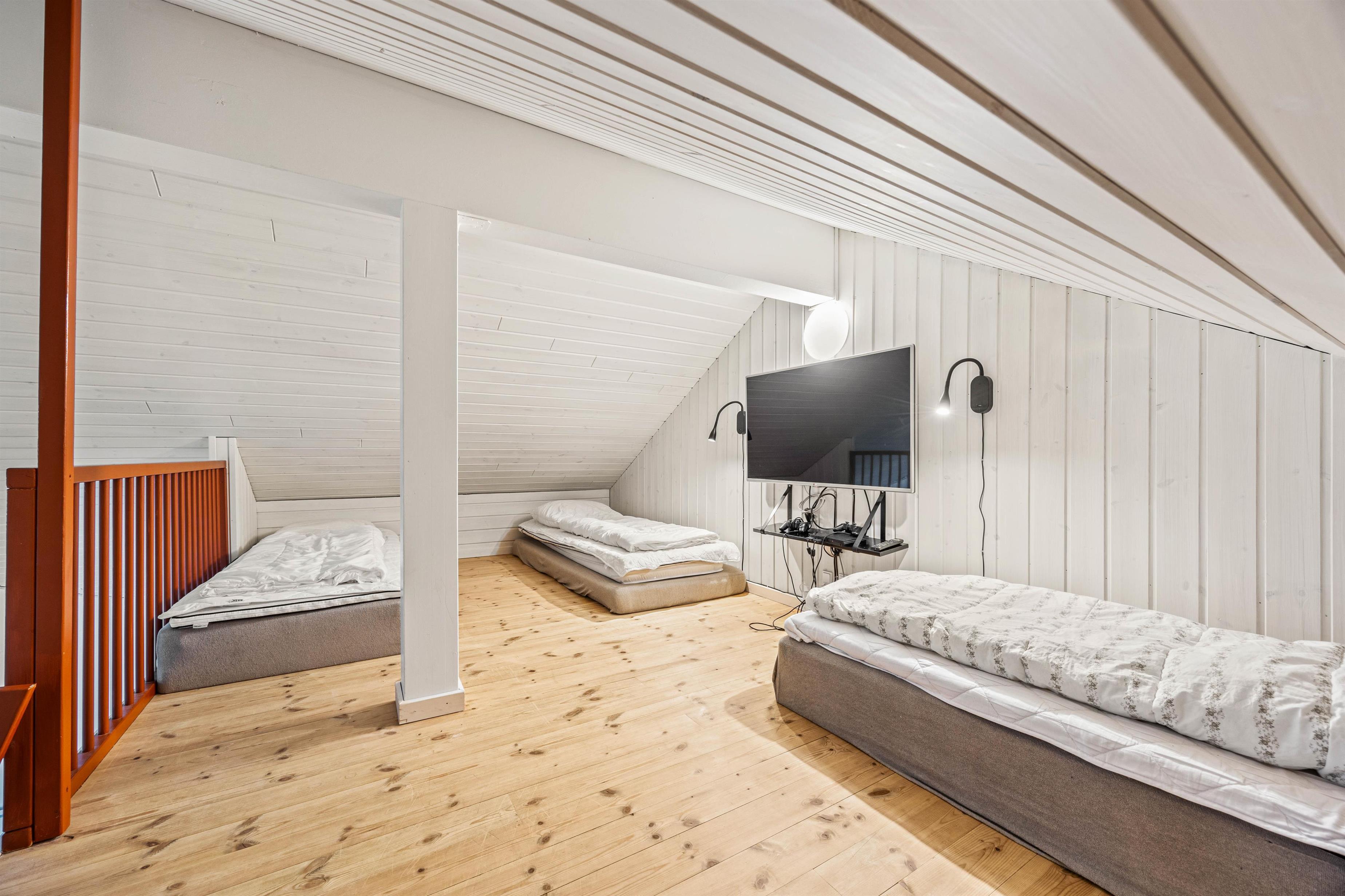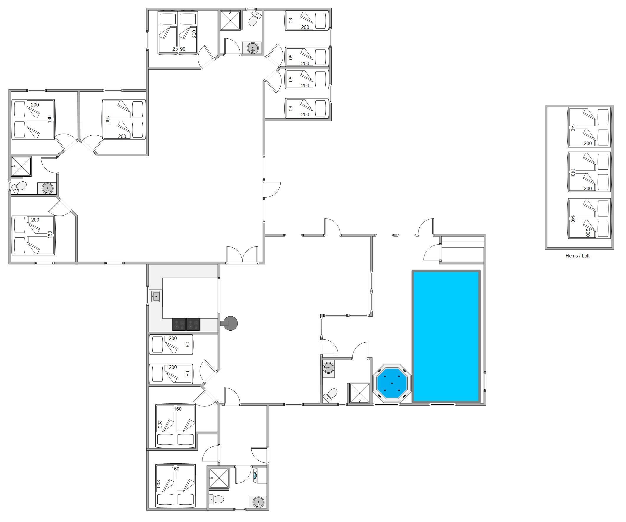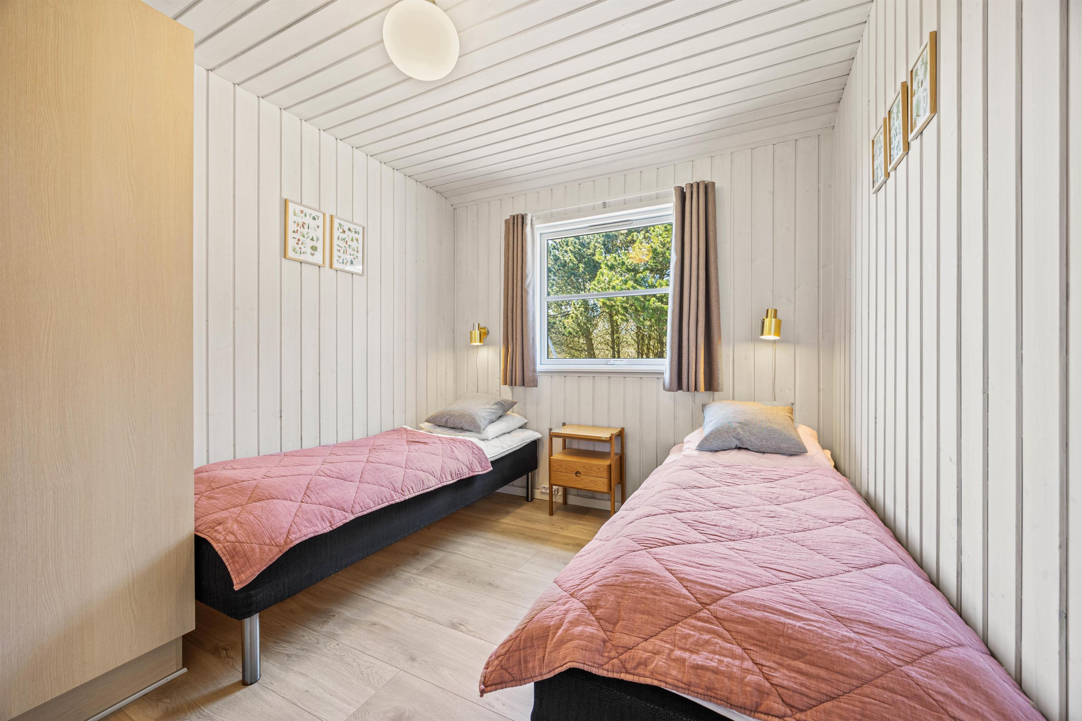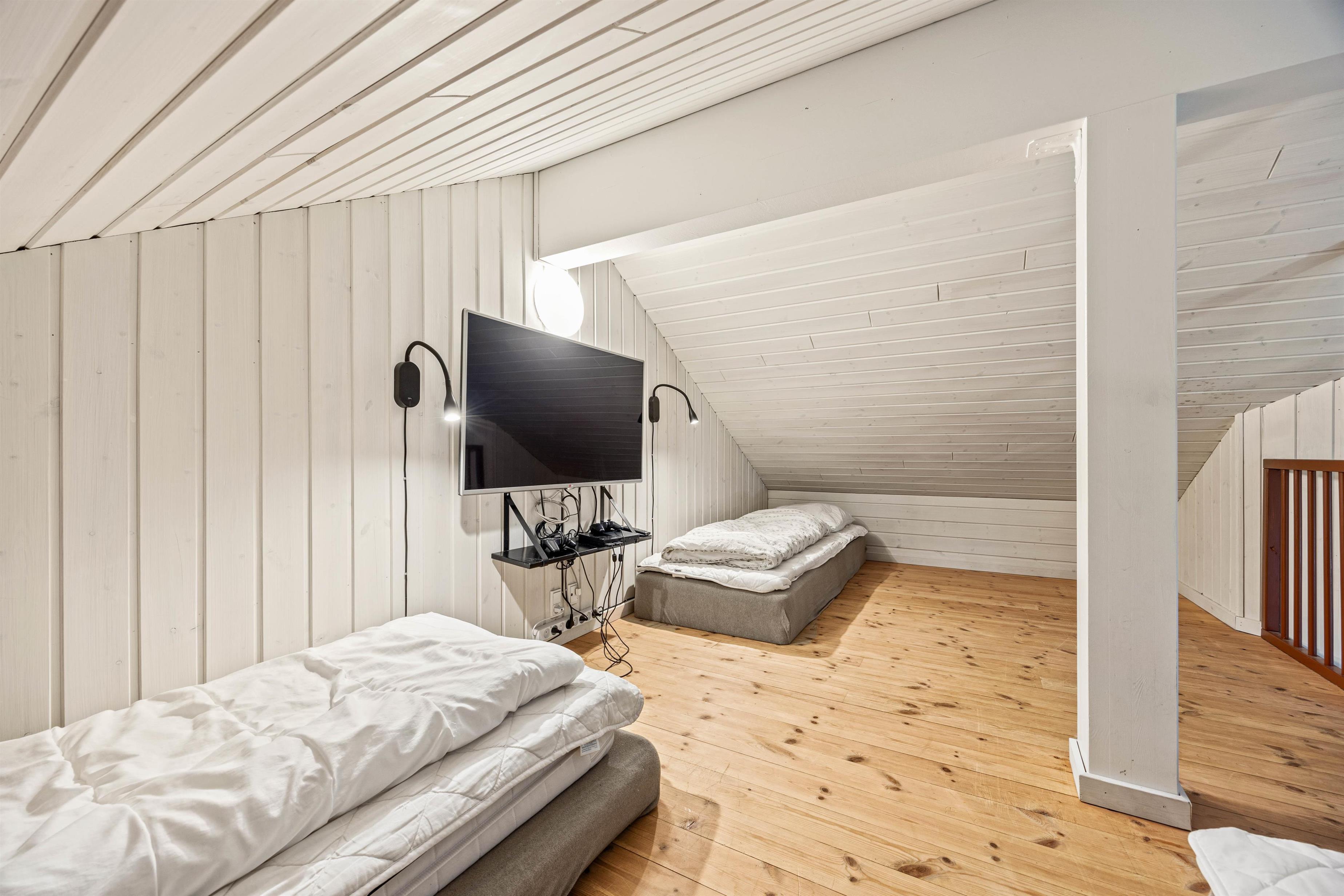 Med i alt 9 smagfuldt indrettede soveværelser og en kombination af 5 dobbeltsenge og 14 enkeltsenge giver sommerhuset i Vejers rigelig plads til op til 24 personer. Bekvemt og komfortabelt kan du slappe af med din familie eller venner i disse indbydende rum. De 4 badeværelser er moderne udstyret, så der opstår ingen ventetider, og alle kan starte friske på dagen. Opholdsområdet kompletteres af en hyggelig brændeovn, der giver behagelig varme på køligere aftener.