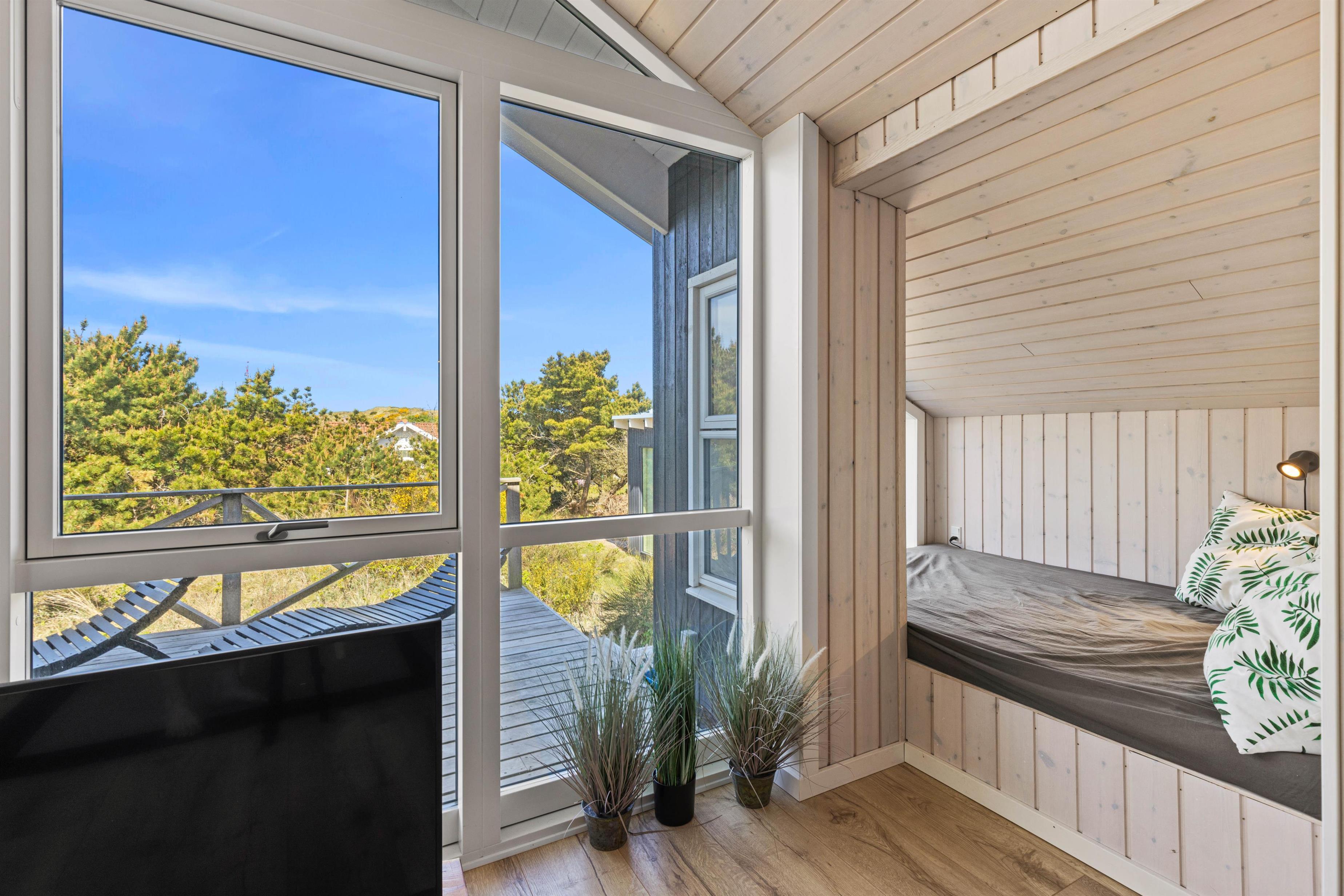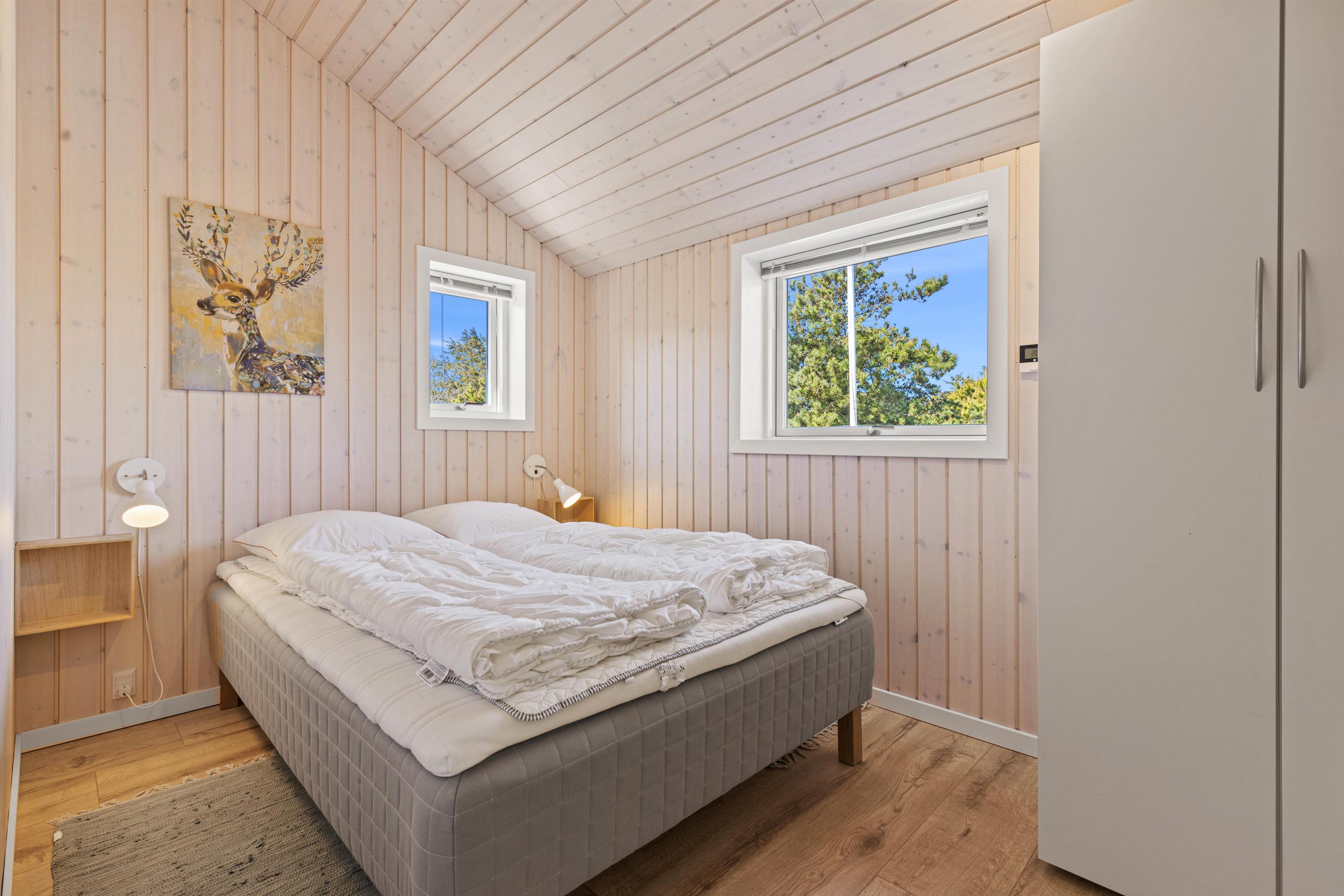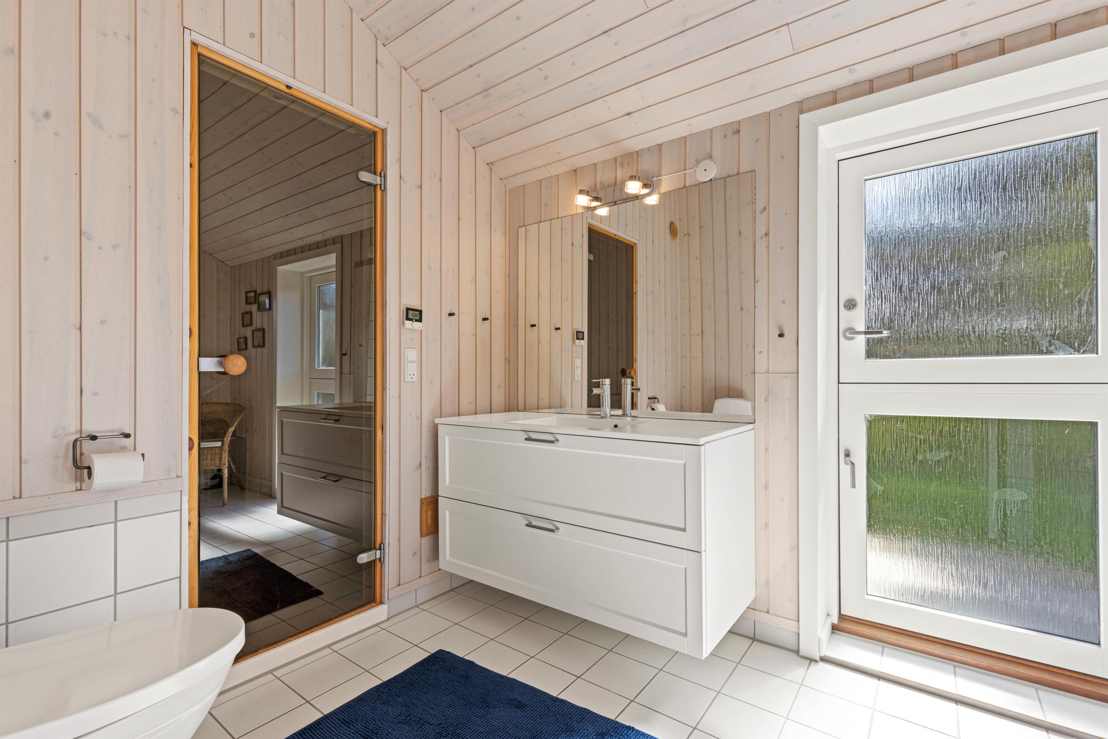 Fra badeværelset er der indgang til sommerhusets helt egen sauna, hvor I kan slappe af og samle ny energi på ferien. Læn jer tilbage i varmen efter en gåtur i den salte havluft eller rund dagen af med et saunabesøg, inden I kravler under dynen.