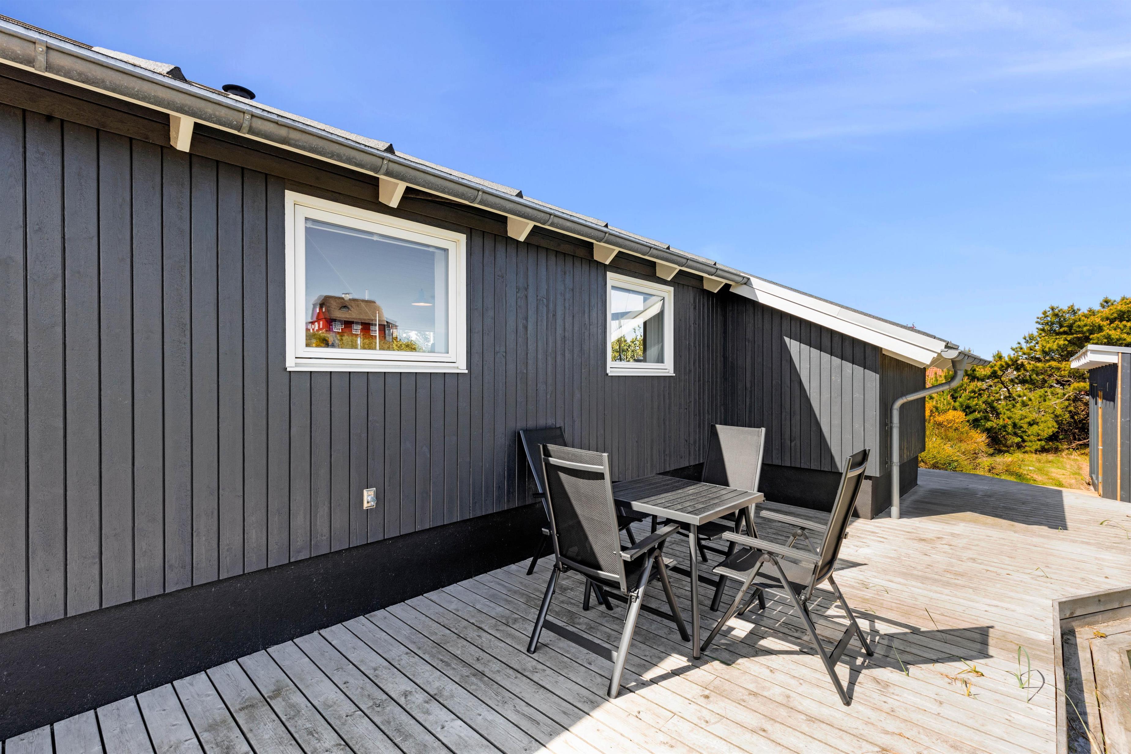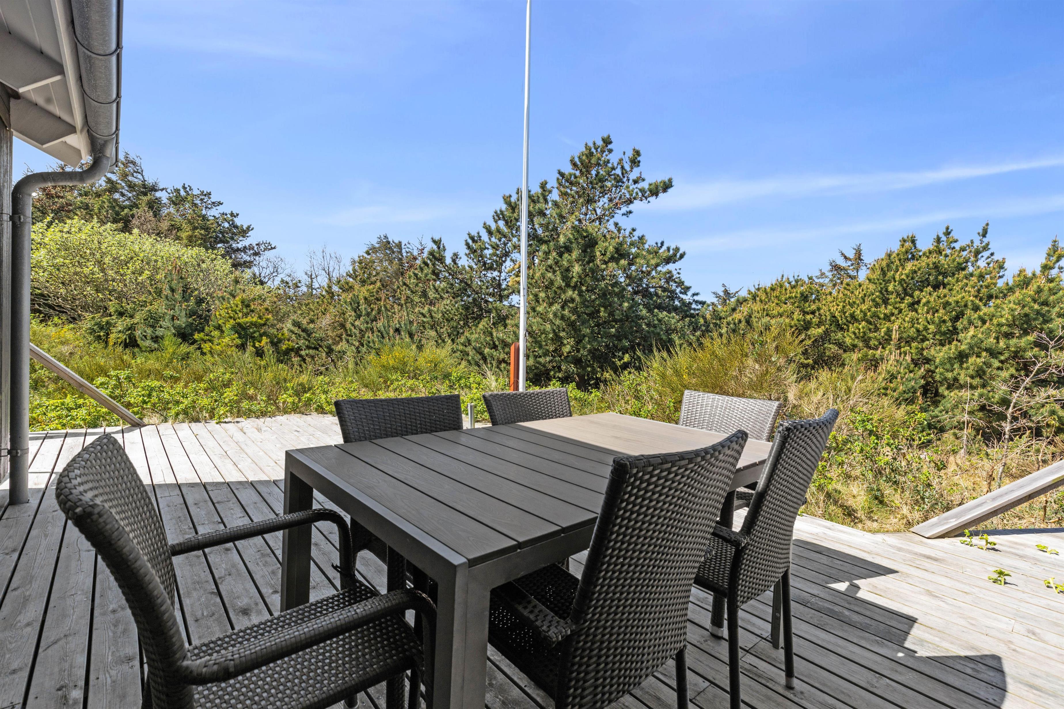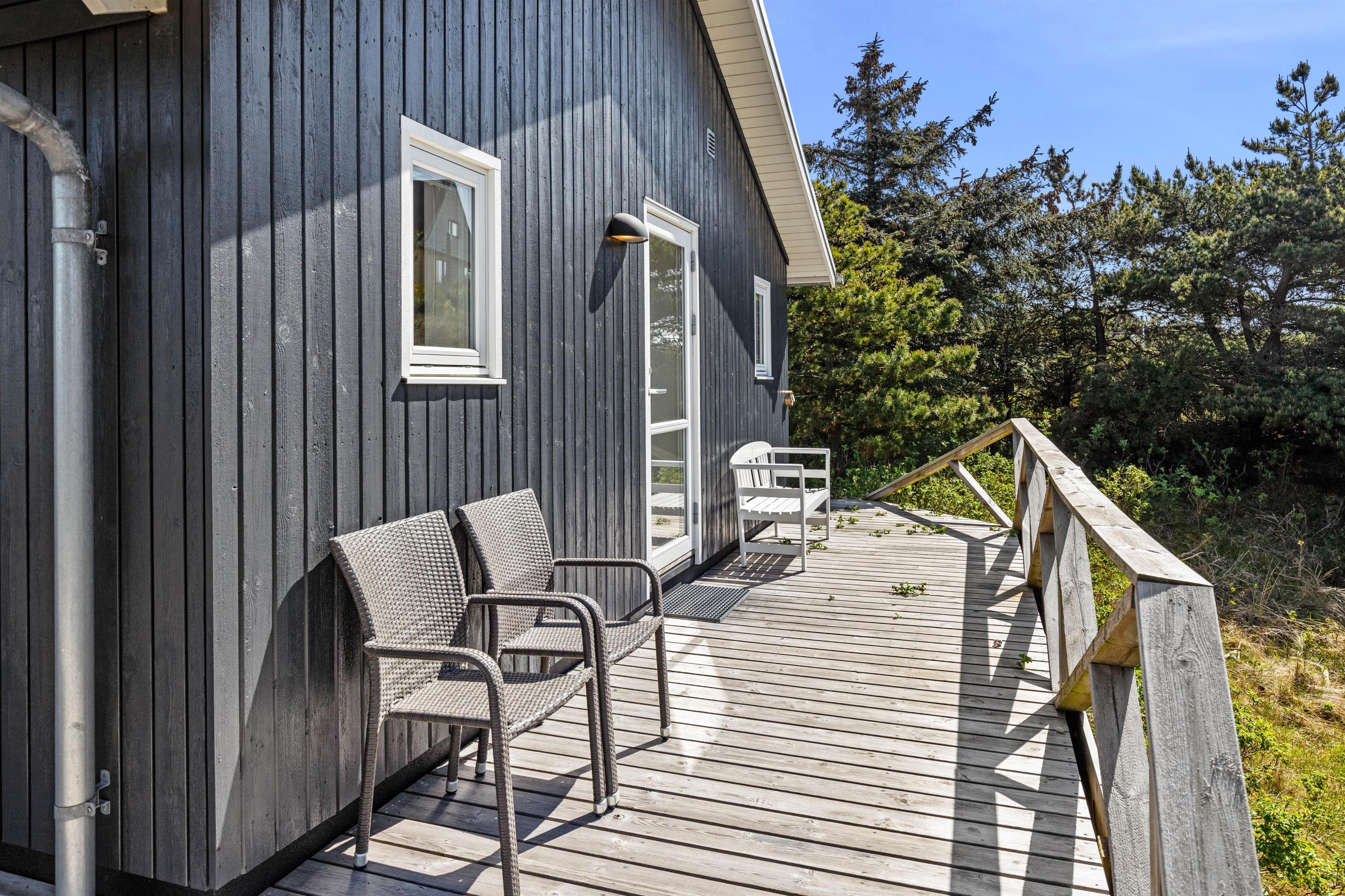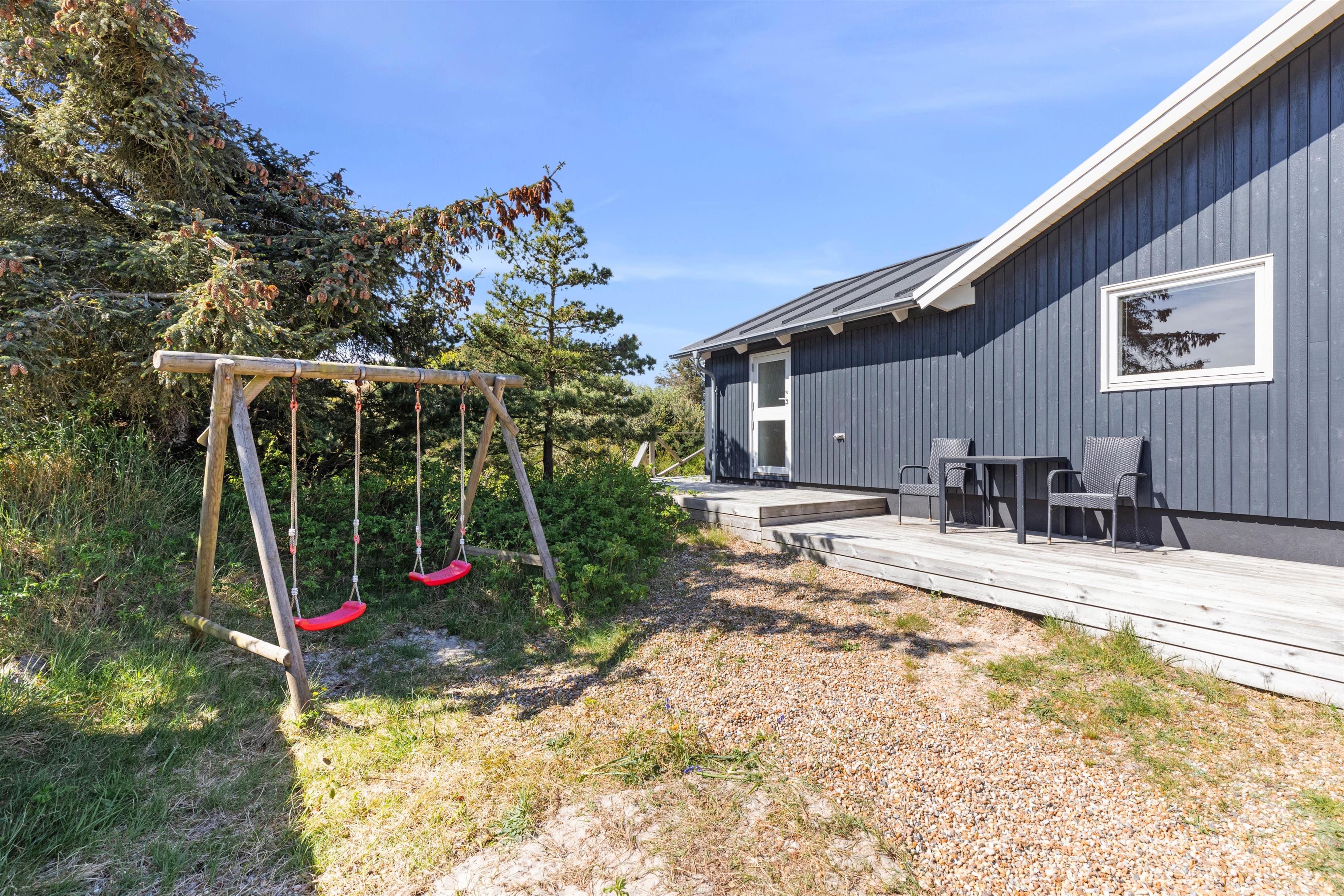 Rundt om feriehuset går en stor, delvist overdækket terrasse, som giver jer alle muligheder for at nyde den friske luft og havets brusen - så snart I træder ud ad døren. Der er sørget for gode havemøbler og liggestole til jer, og med feriehusets grill er det oplagt at flytte madlavningen udenfor på de lune sommeraftener. Til glæde for børnene er der lavet et gyngestativ.