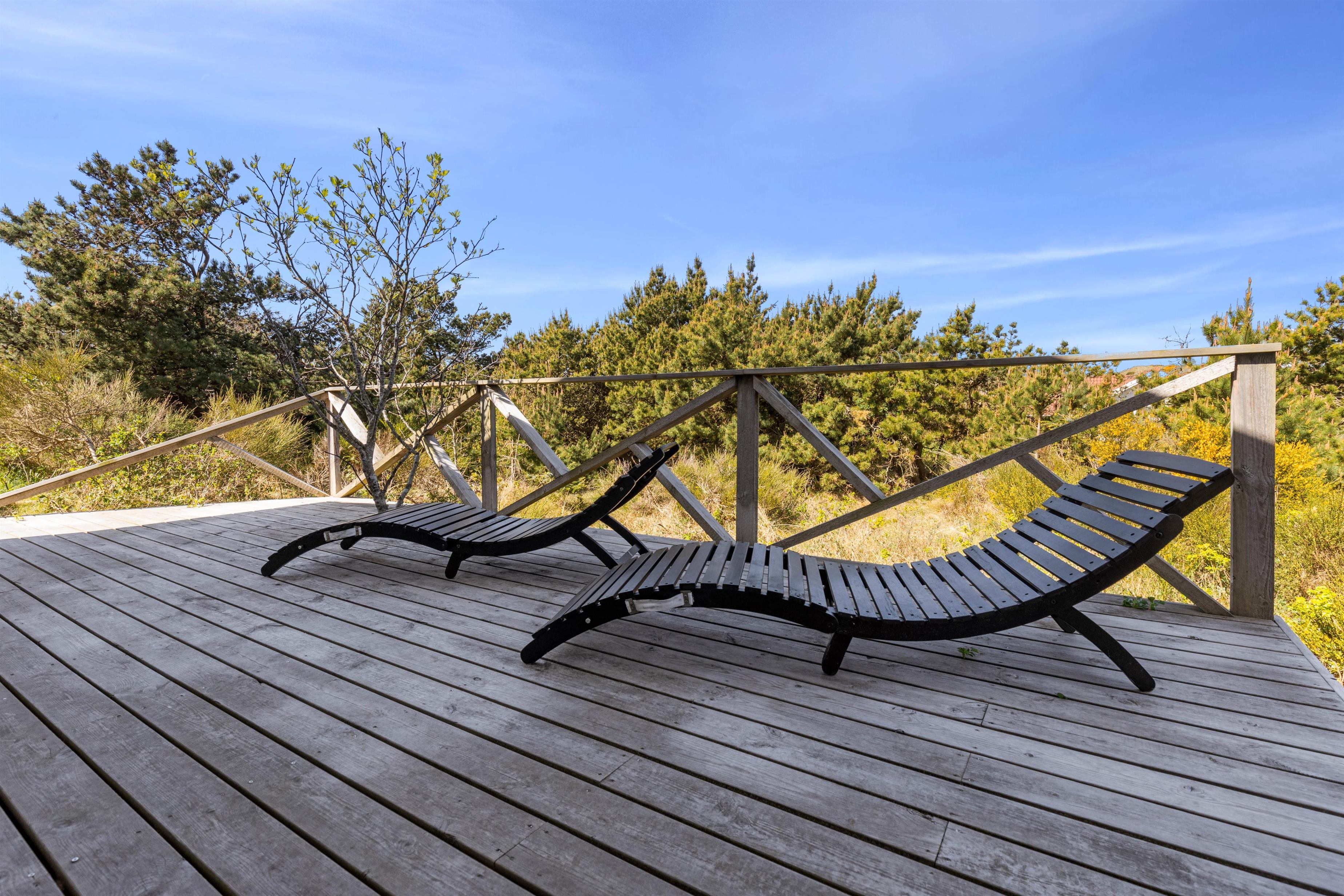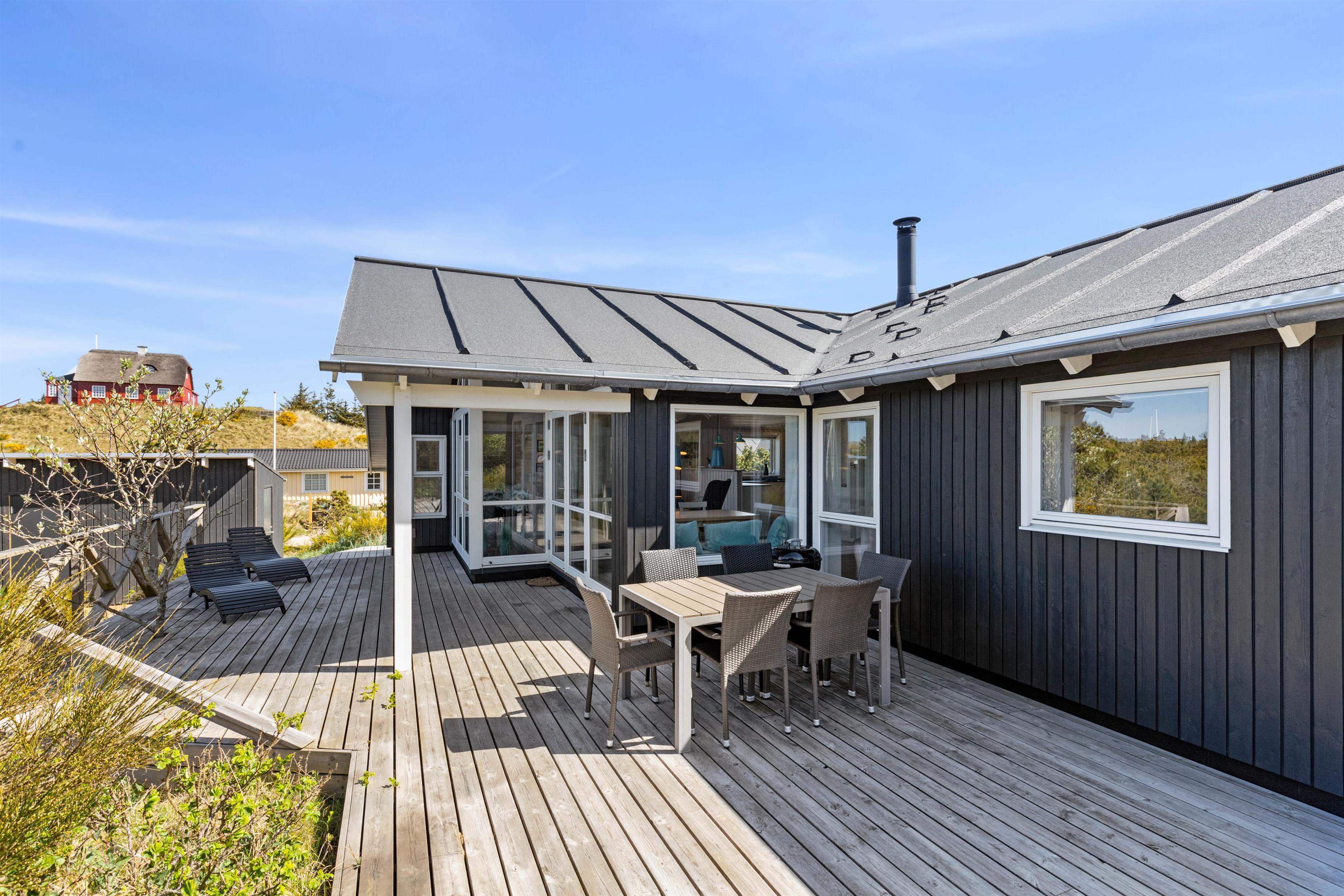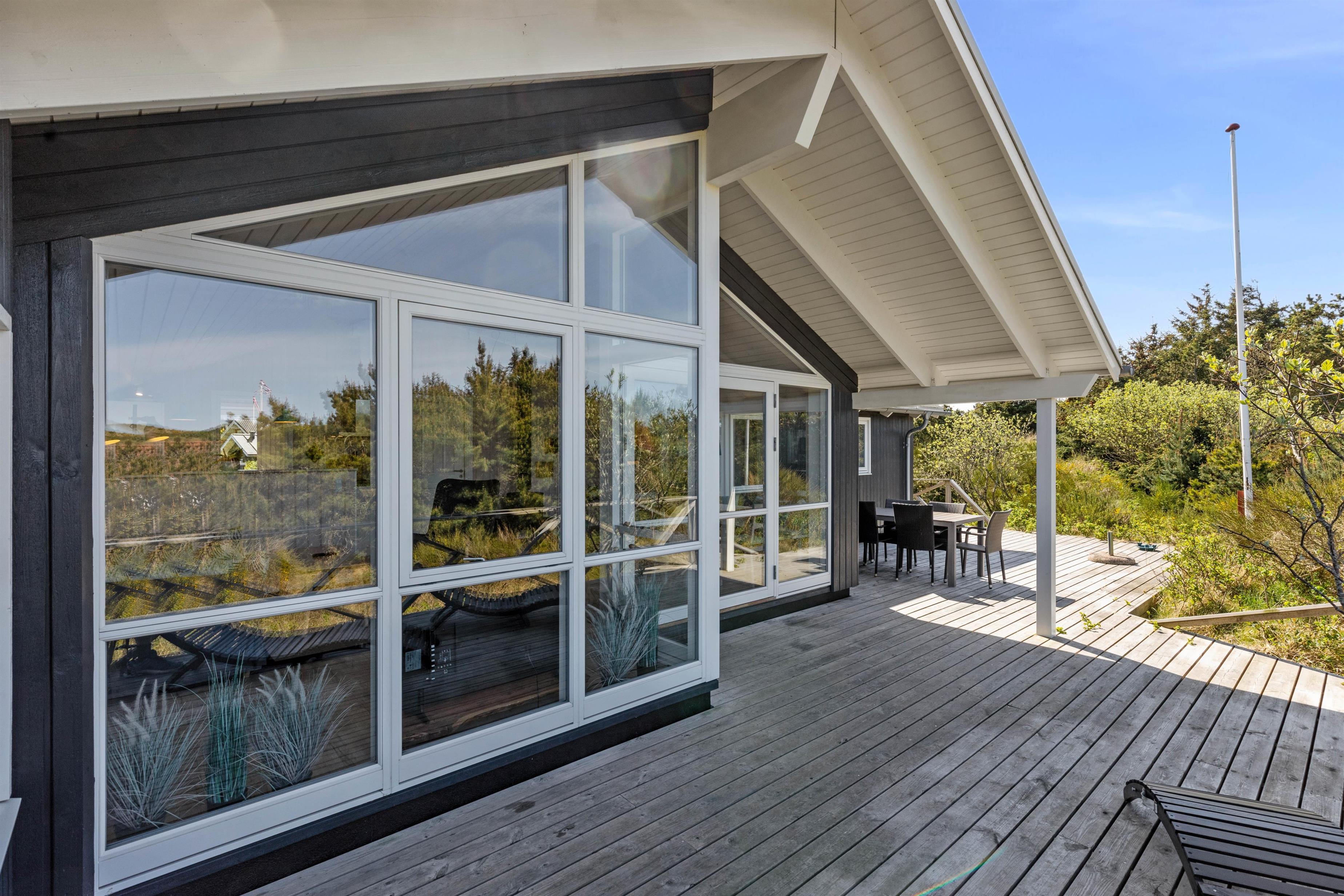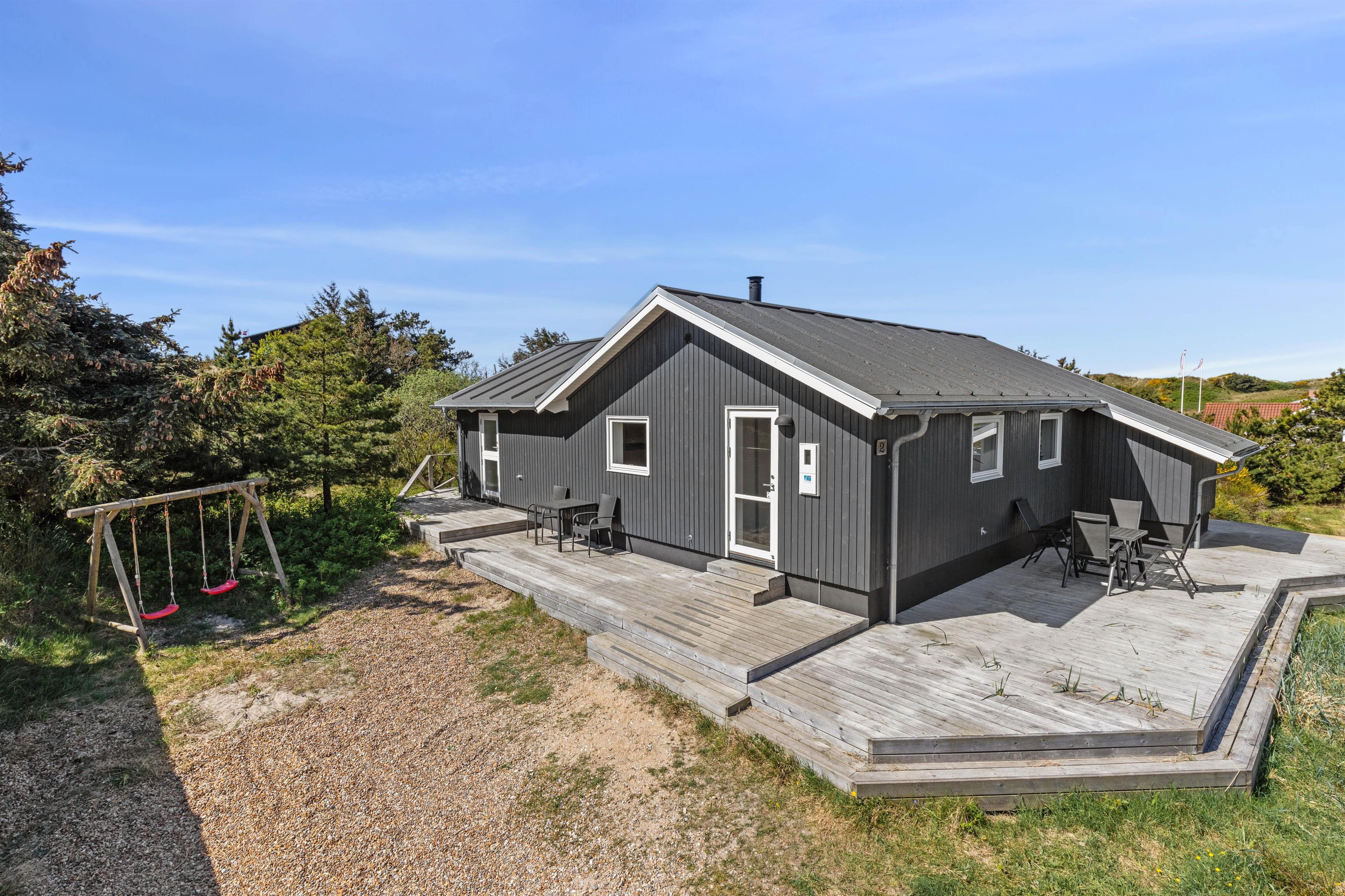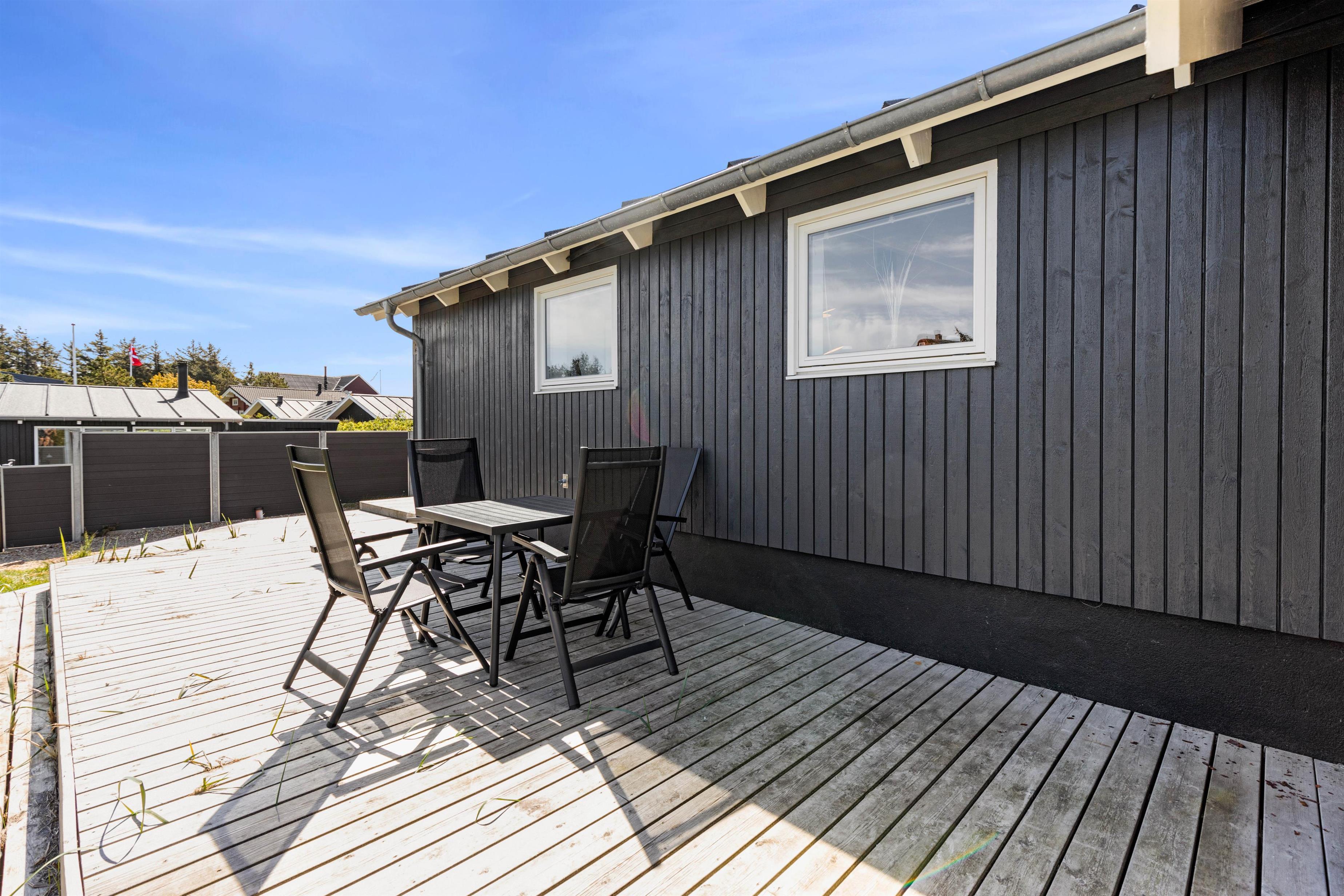 Rundt om feriehuset går en stor, delvist overdækket terrasse, som giver jer alle muligheder for at nyde den friske luft og havets brusen - så snart I træder ud ad døren. Der er sørget for gode havemøbler og liggestole til jer, og med feriehusets grill er det oplagt at flytte madlavningen udenfor på de lune sommeraftener. Til glæde for børnene er der lavet et gyngestativ.