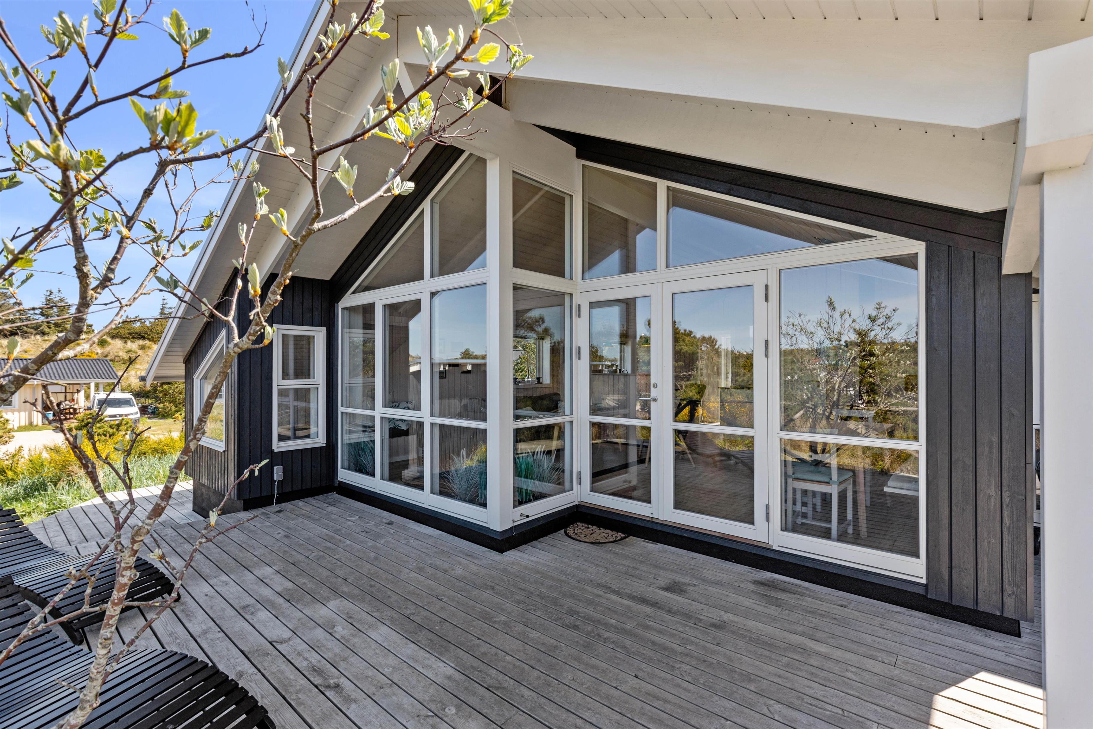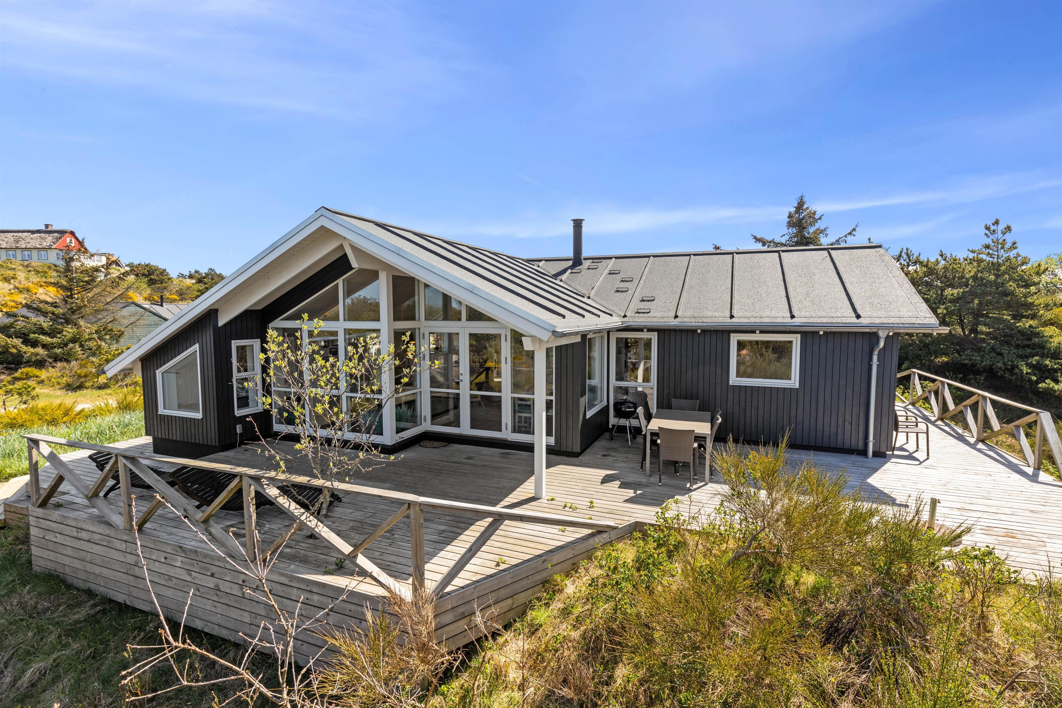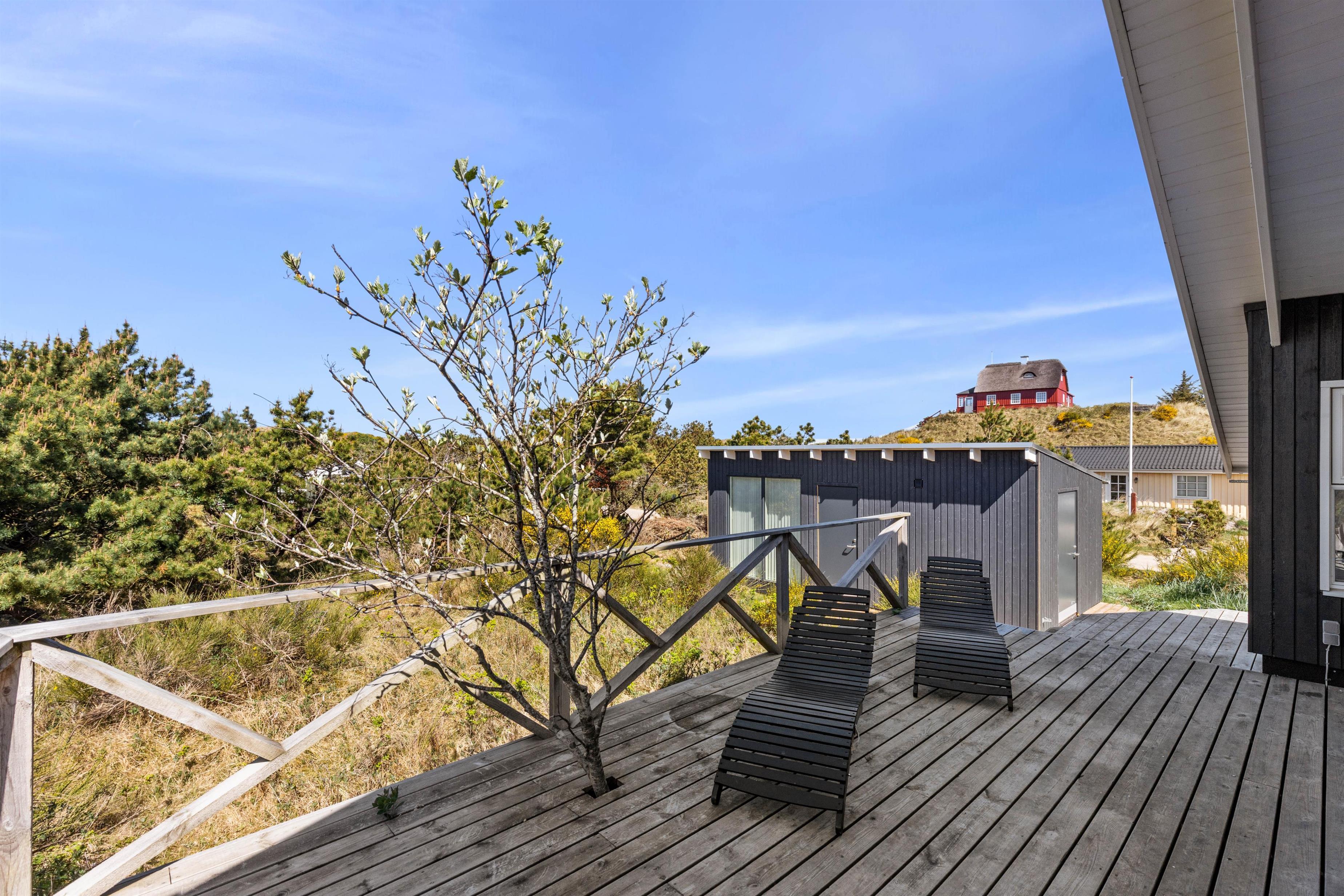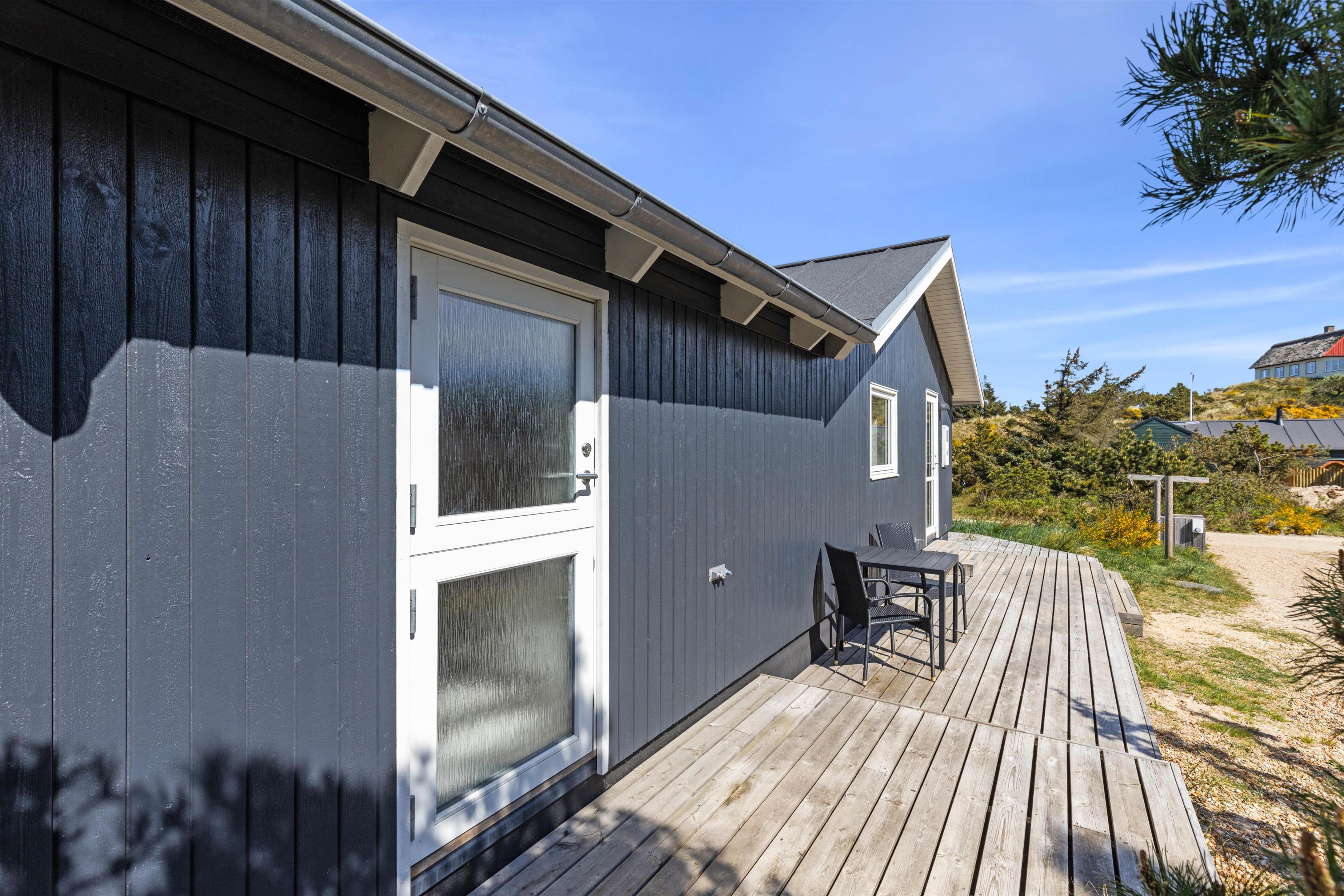 Rundt om feriehuset går en stor, delvist overdækket terrasse, som giver jer alle muligheder for at nyde den friske luft og havets brusen - så snart I træder ud ad døren. Der er sørget for gode havemøbler og liggestole til jer, og med feriehusets grill er det oplagt at flytte madlavningen udenfor på de lune sommeraftener. Til glæde for børnene er der lavet et gyngestativ.