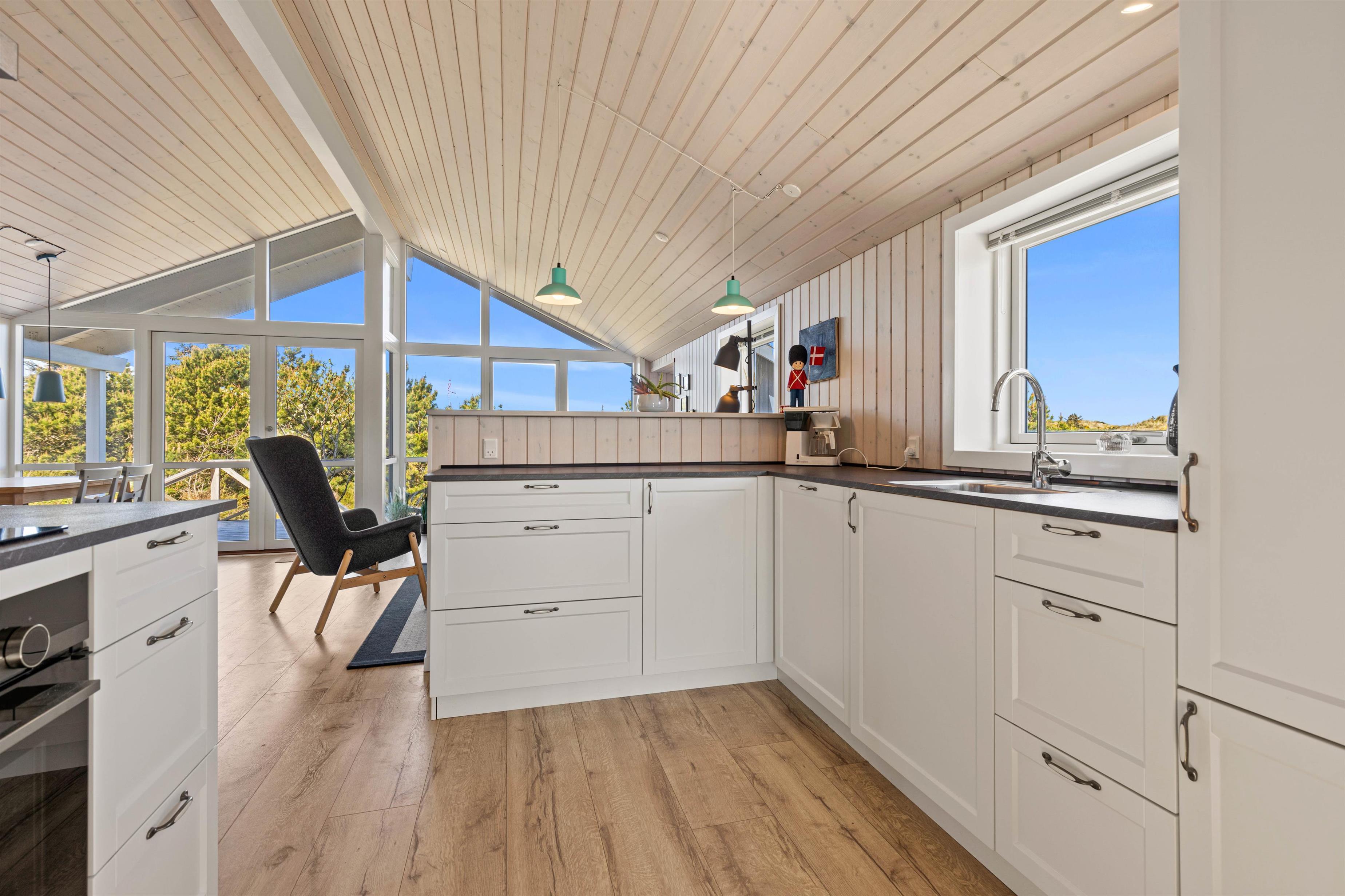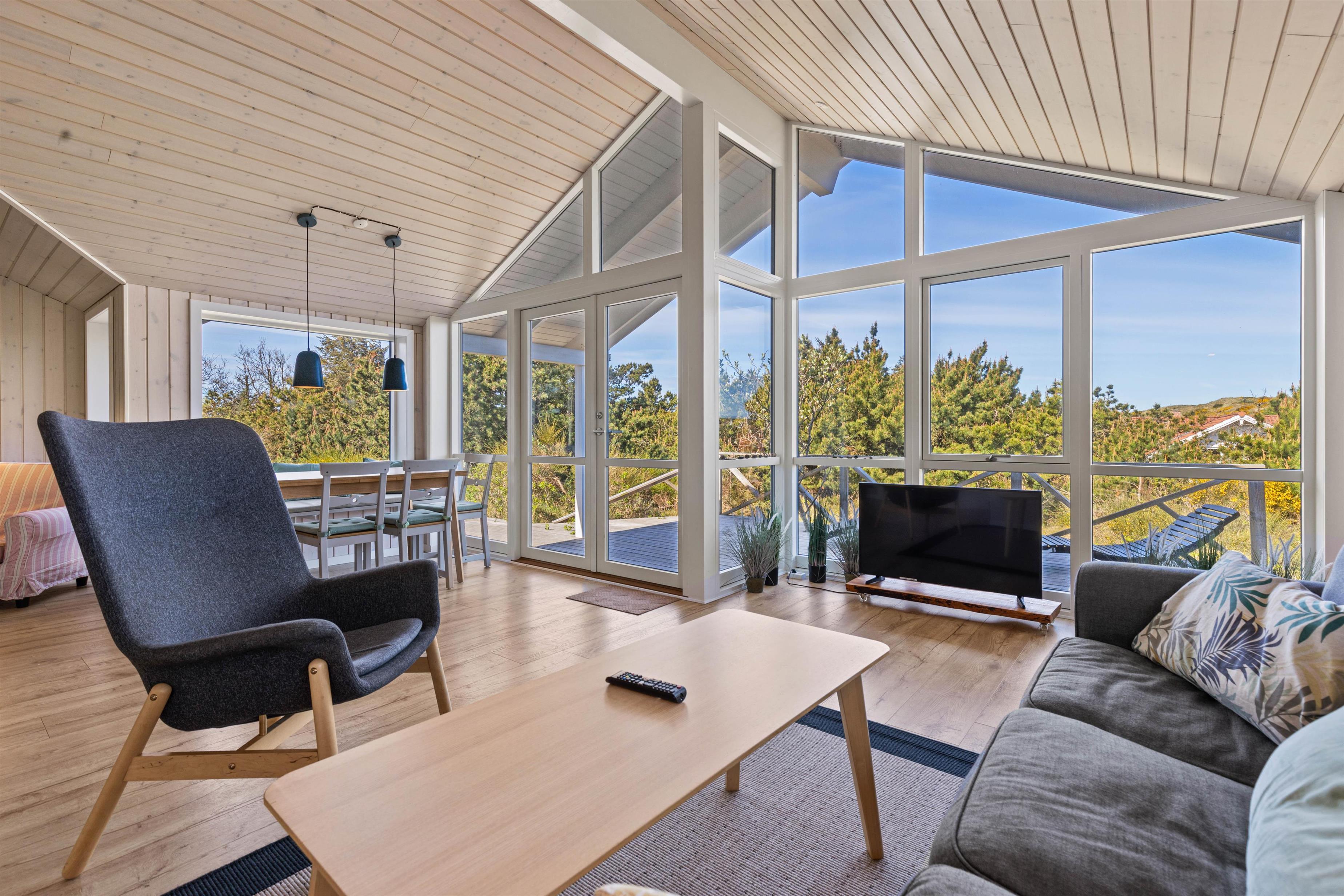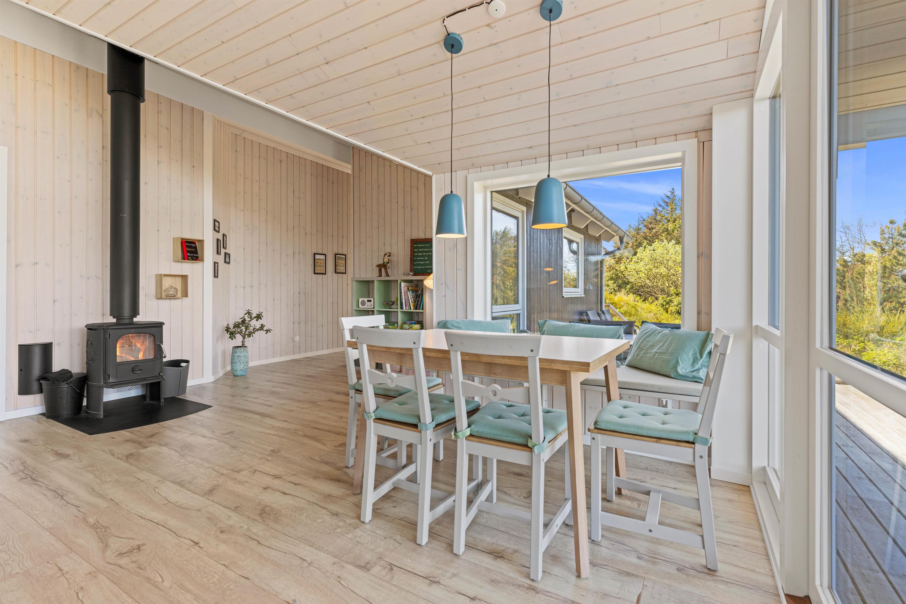 Kom med indenfor i den hyggelige stue, som er kombineret med både spiseafdeling og køkken og danner de perfekte rammer for en ferie med masser af samvær. De store vinduer lader solens stråler komme ind og giver jer et smukt udsyn til den grønne, vestjyske natur, der omgiver jer.