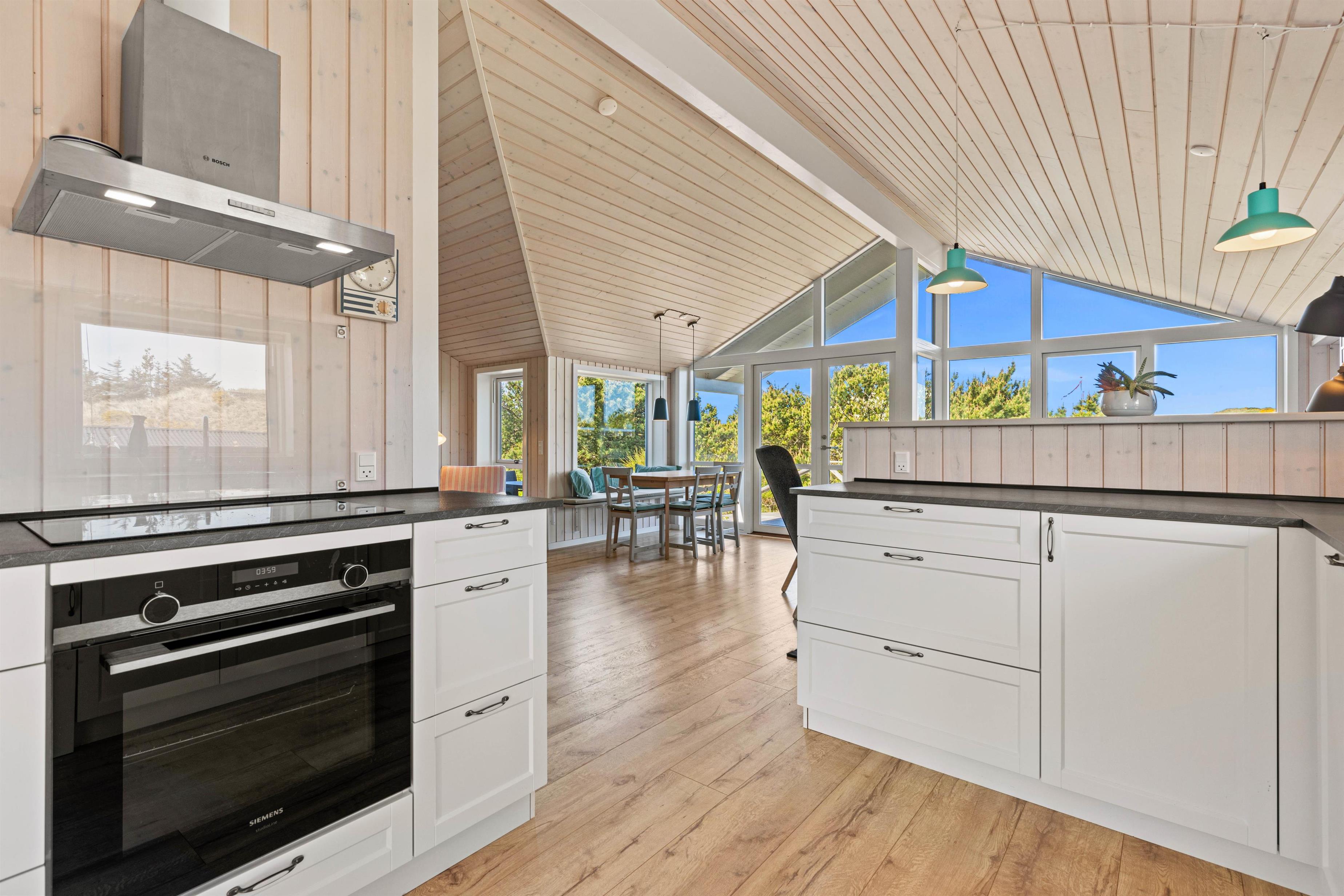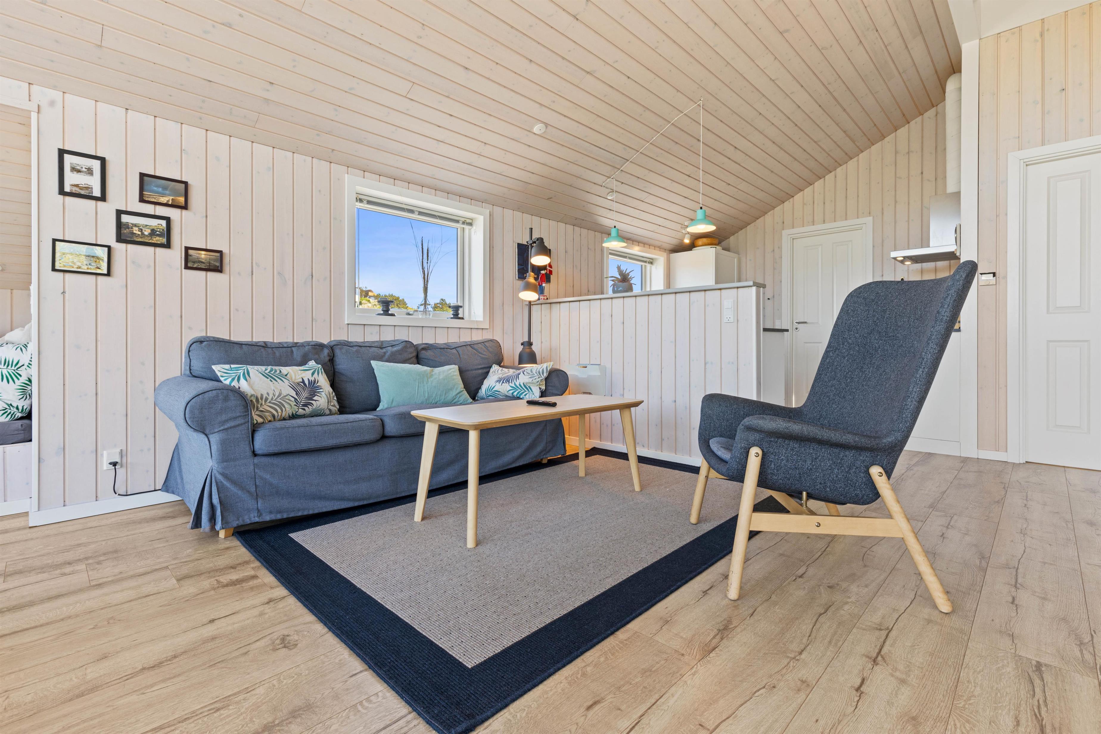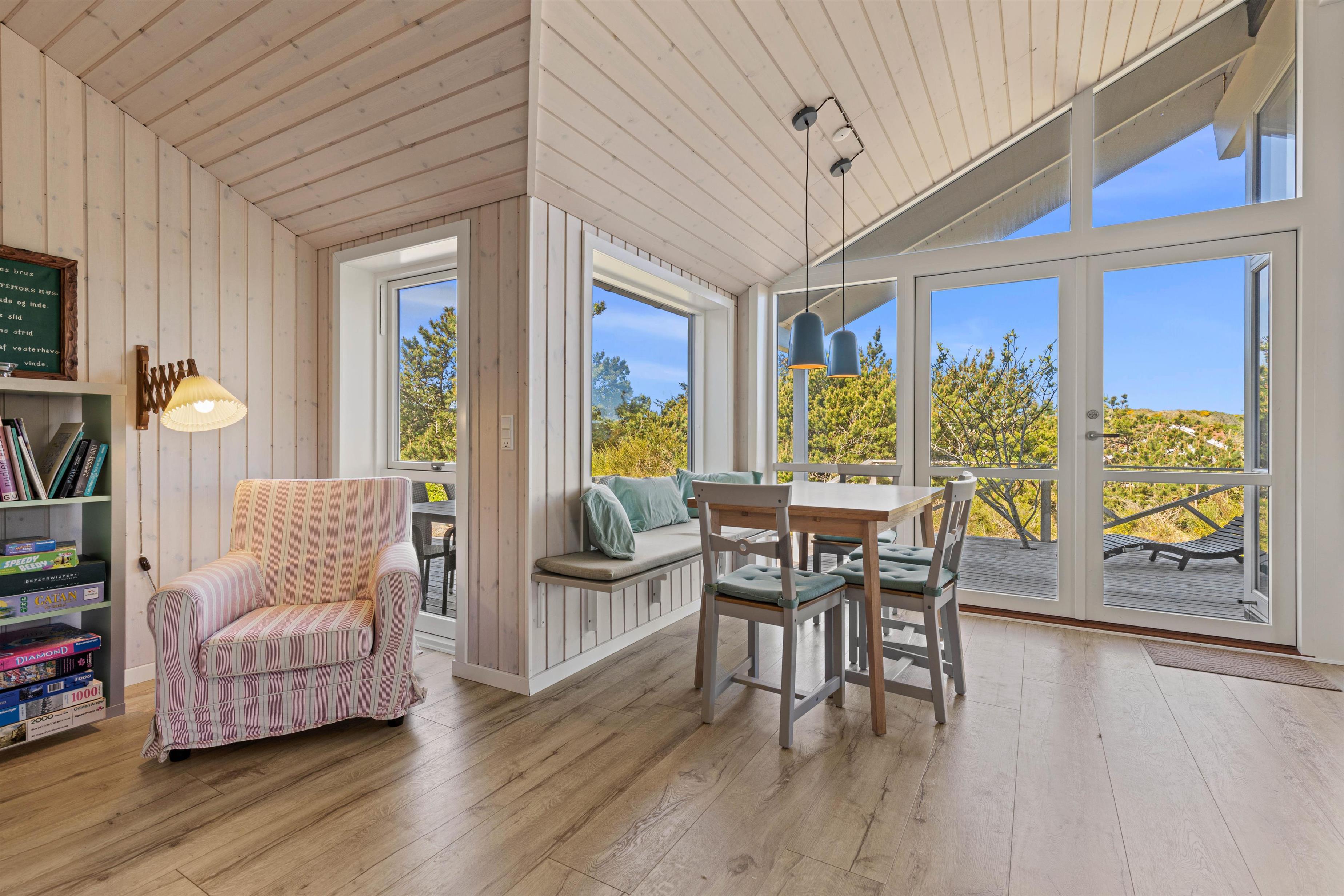 Kom med indenfor i den hyggelige stue, som er kombineret med både spiseafdeling og køkken og danner de perfekte rammer for en ferie med masser af samvær. De store vinduer lader solens stråler komme ind og giver jer et smukt udsyn til den grønne, vestjyske natur, der omgiver jer.