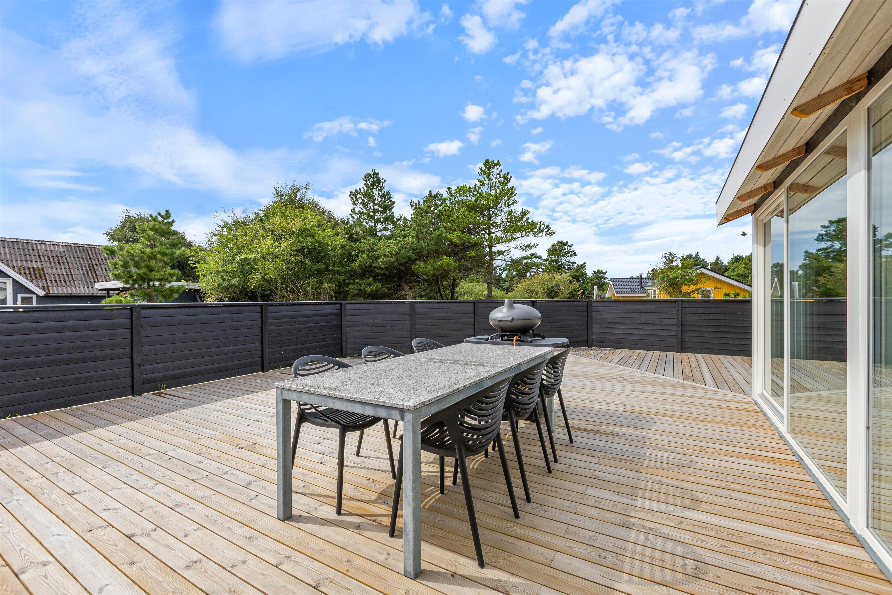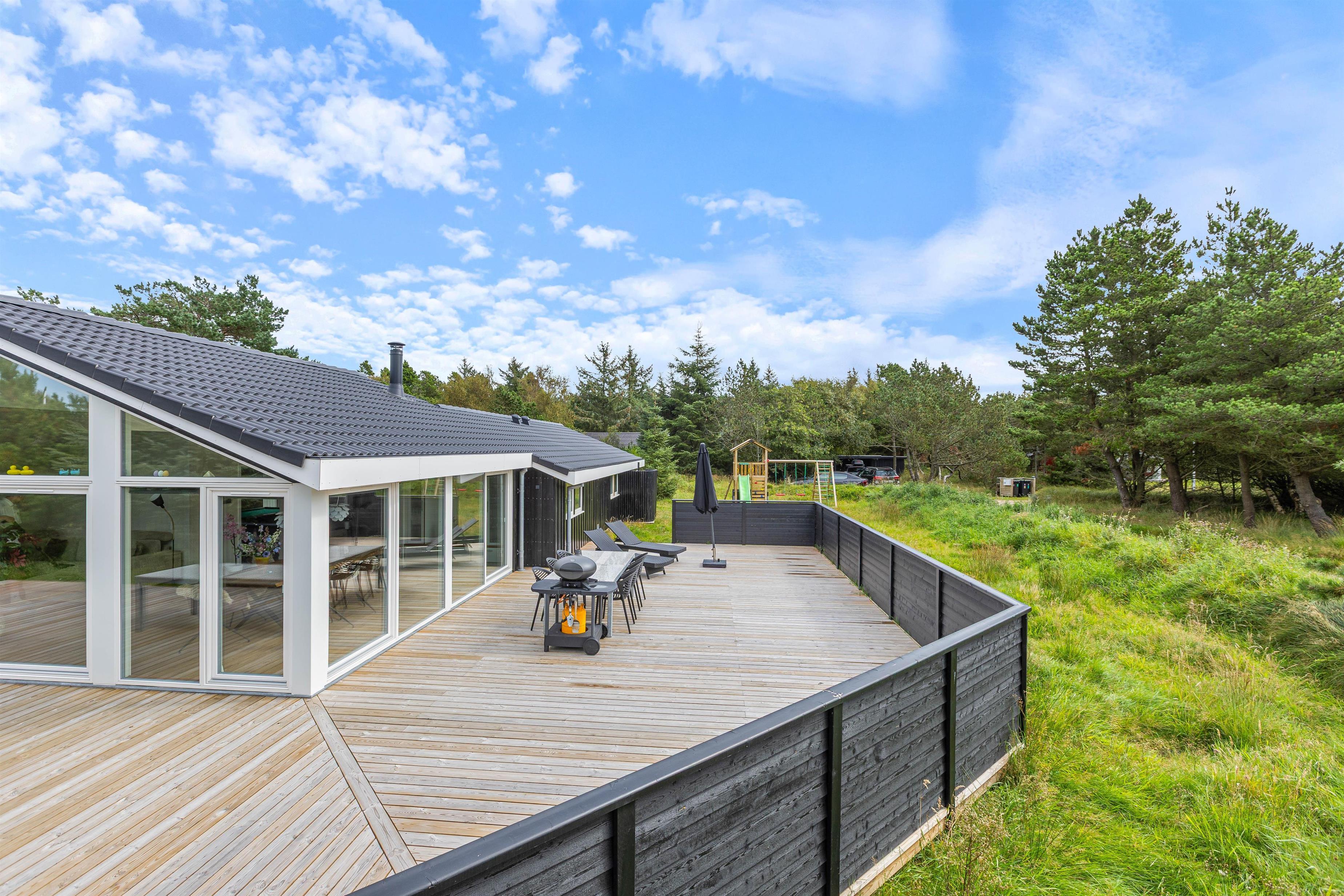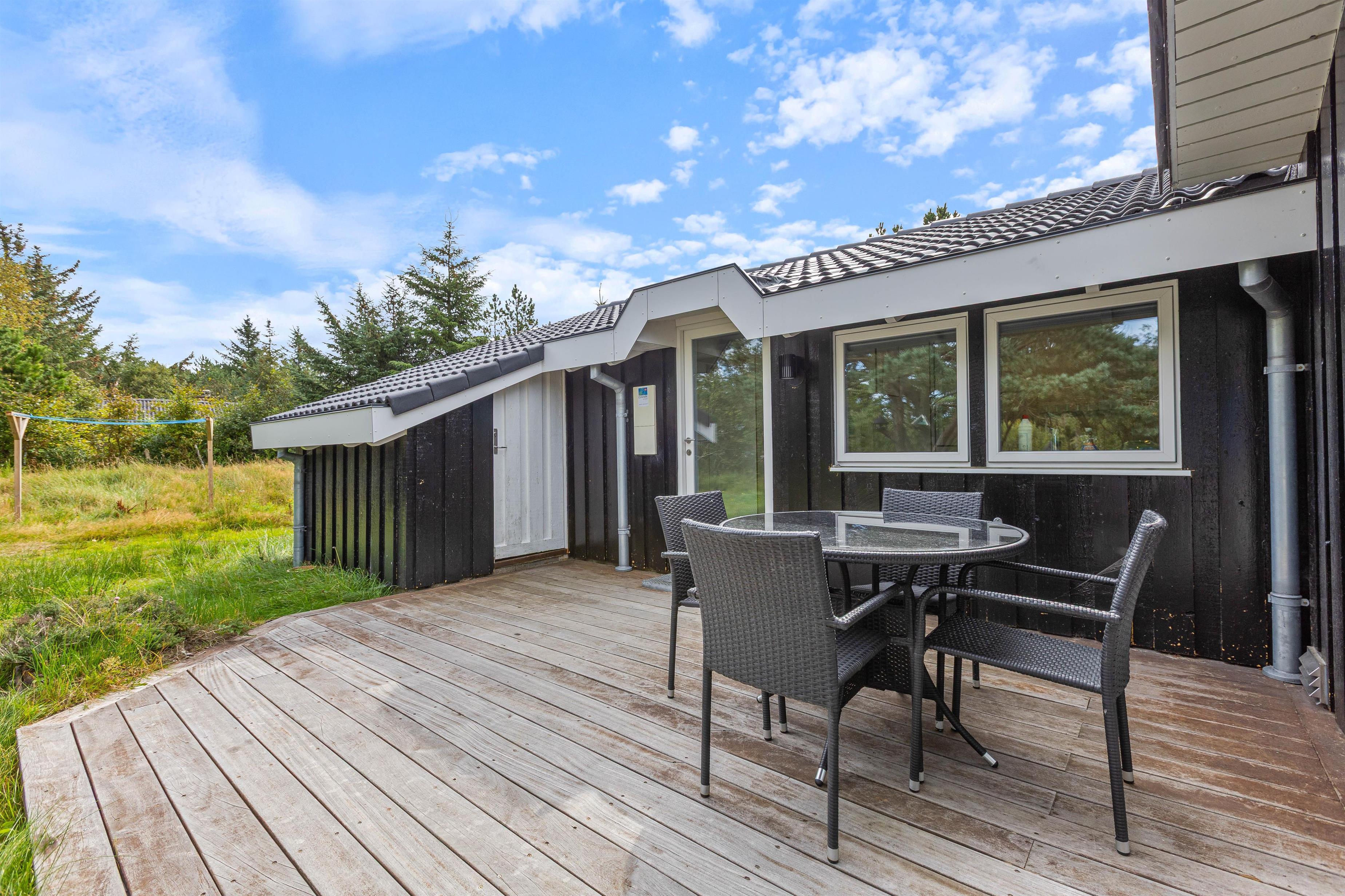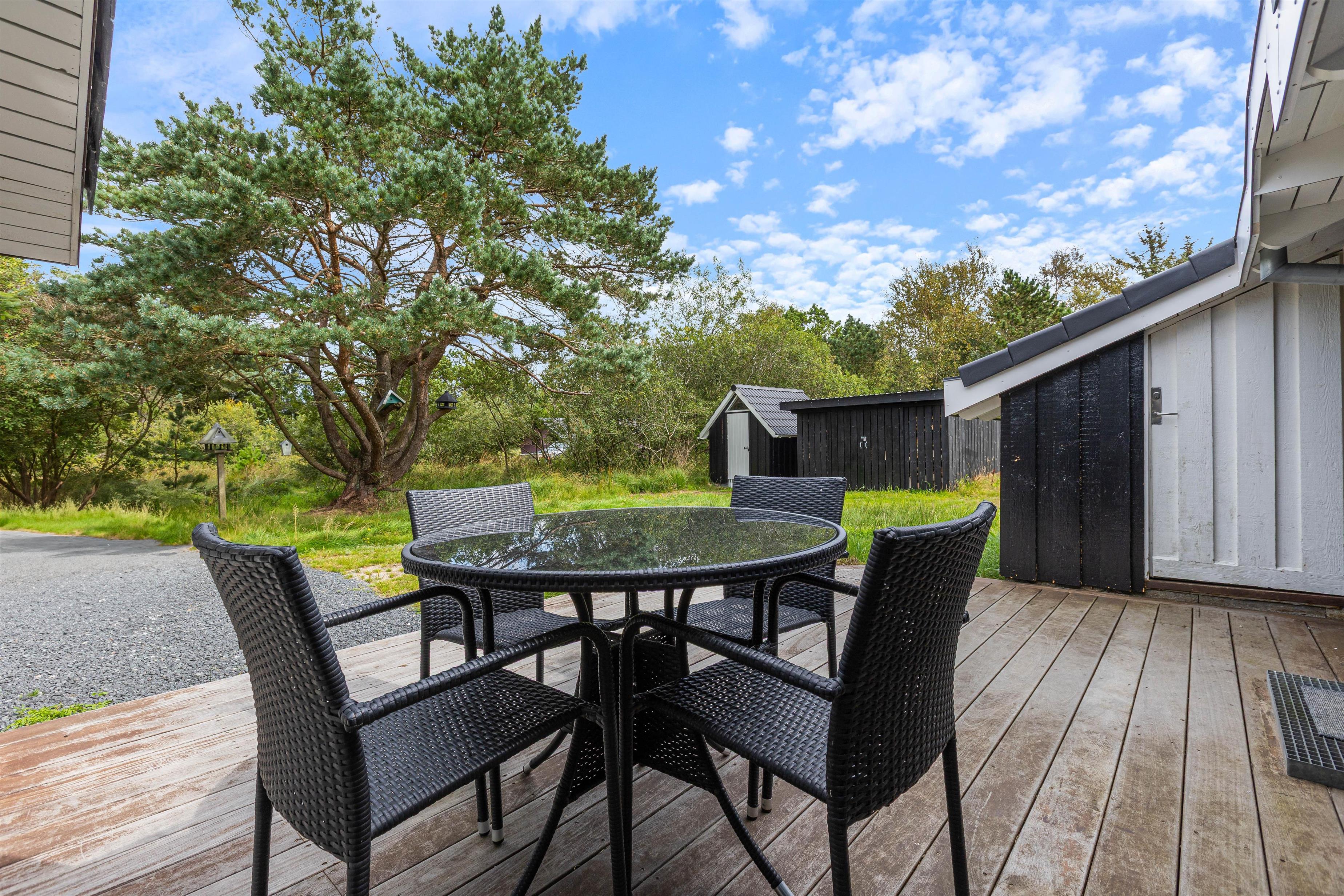 På terrassen kan du nyde den friske vesterhavsluft i fulde drag. Der er både liggestole og havemøbler til rådighed, så I kan flytte rundt efter vejret. Børnene kan hygge sig på gyngerne eller i sandkassen. Der er en lille skov i umiddelbar nærhed, som bare venter på at blive udforsket og indbyder til en gåtur eller måske en skattejagt. Efter en dejlig sommerdag kan I nyde aftensmaden fra grillen på terrassen.