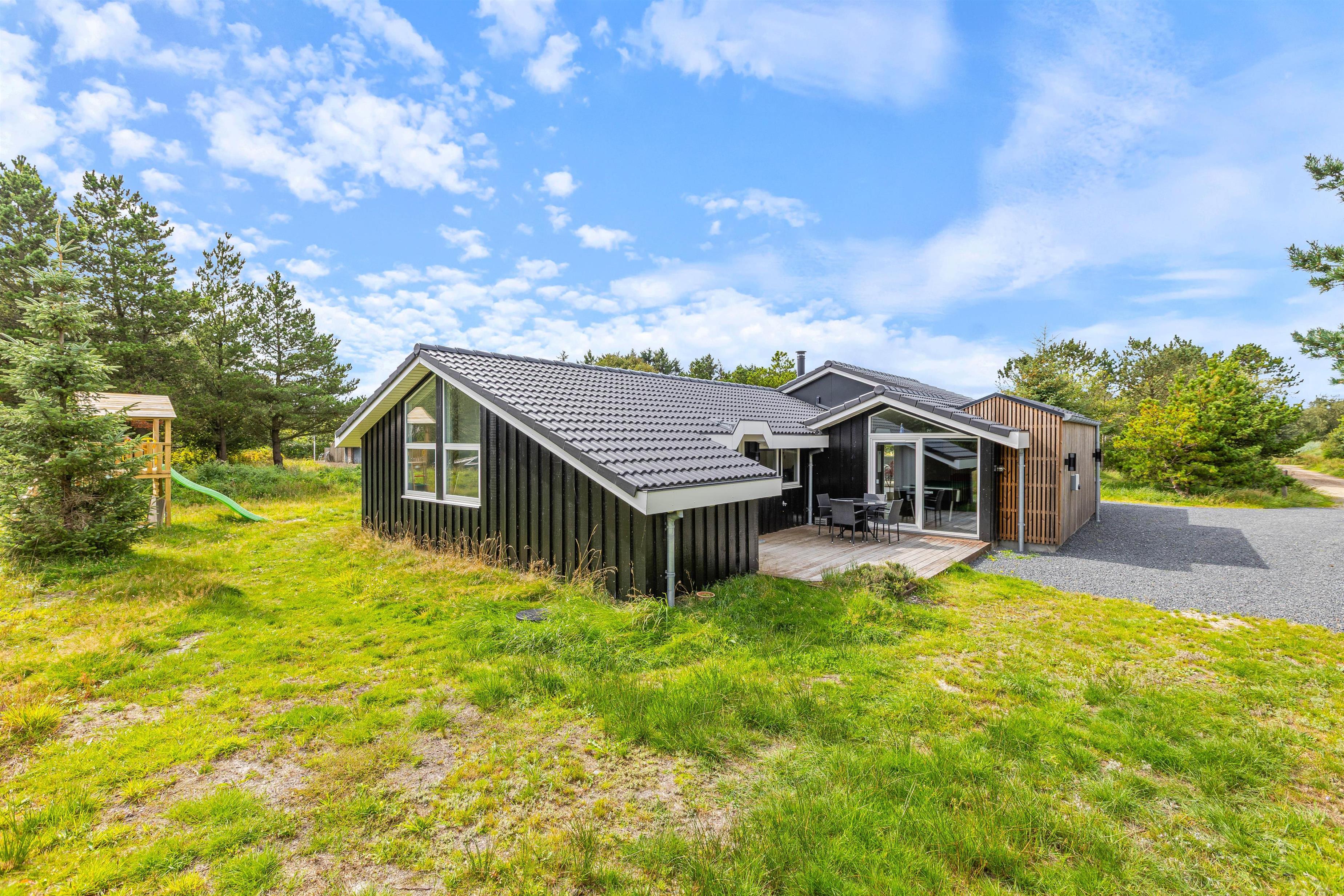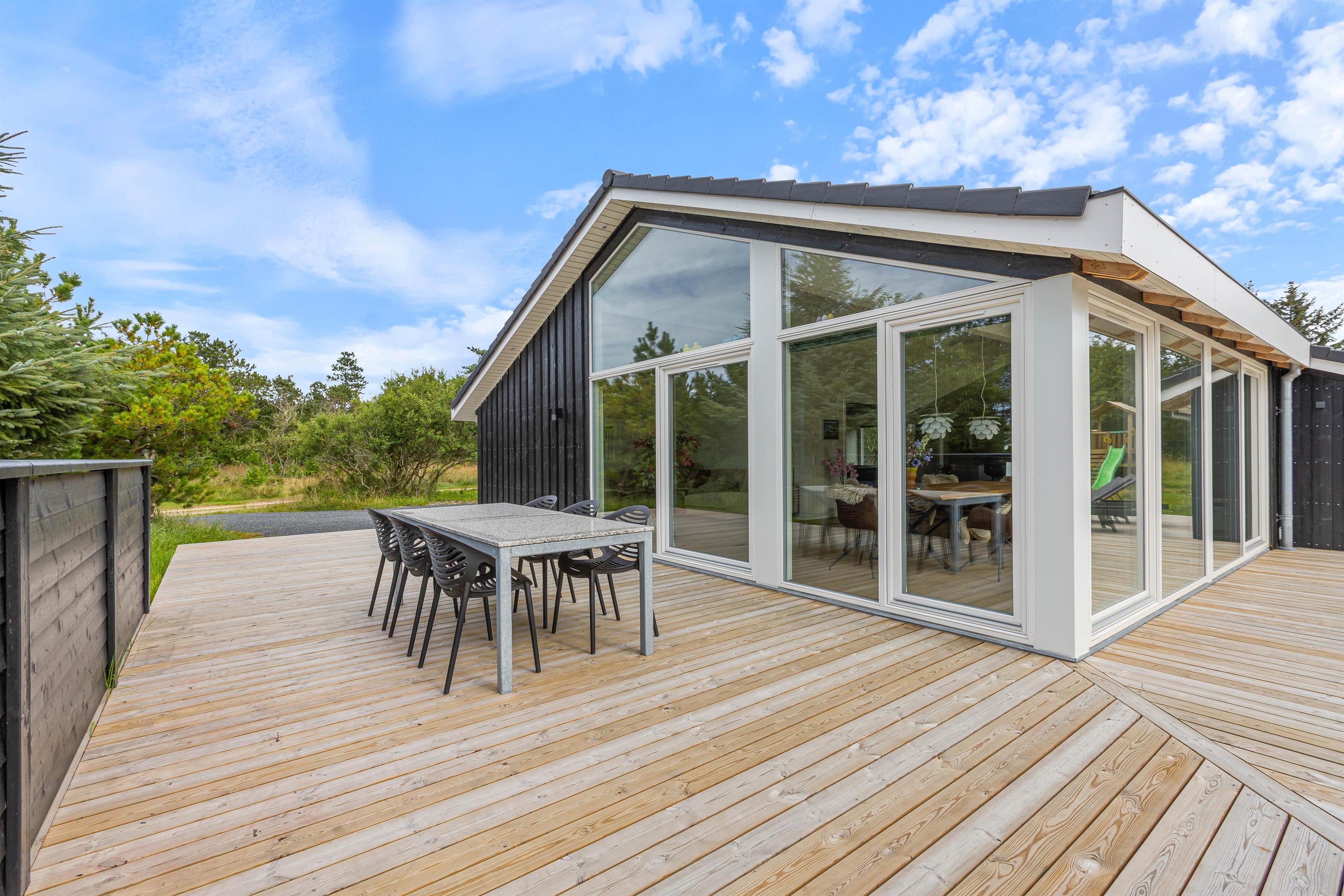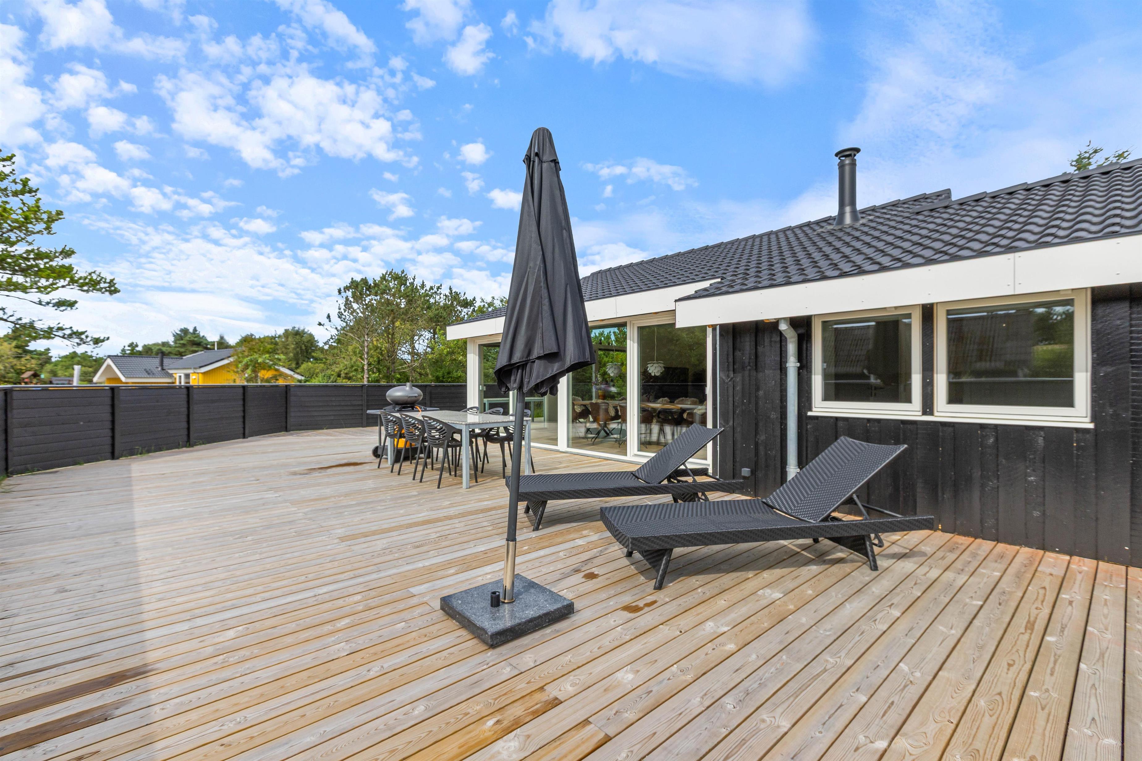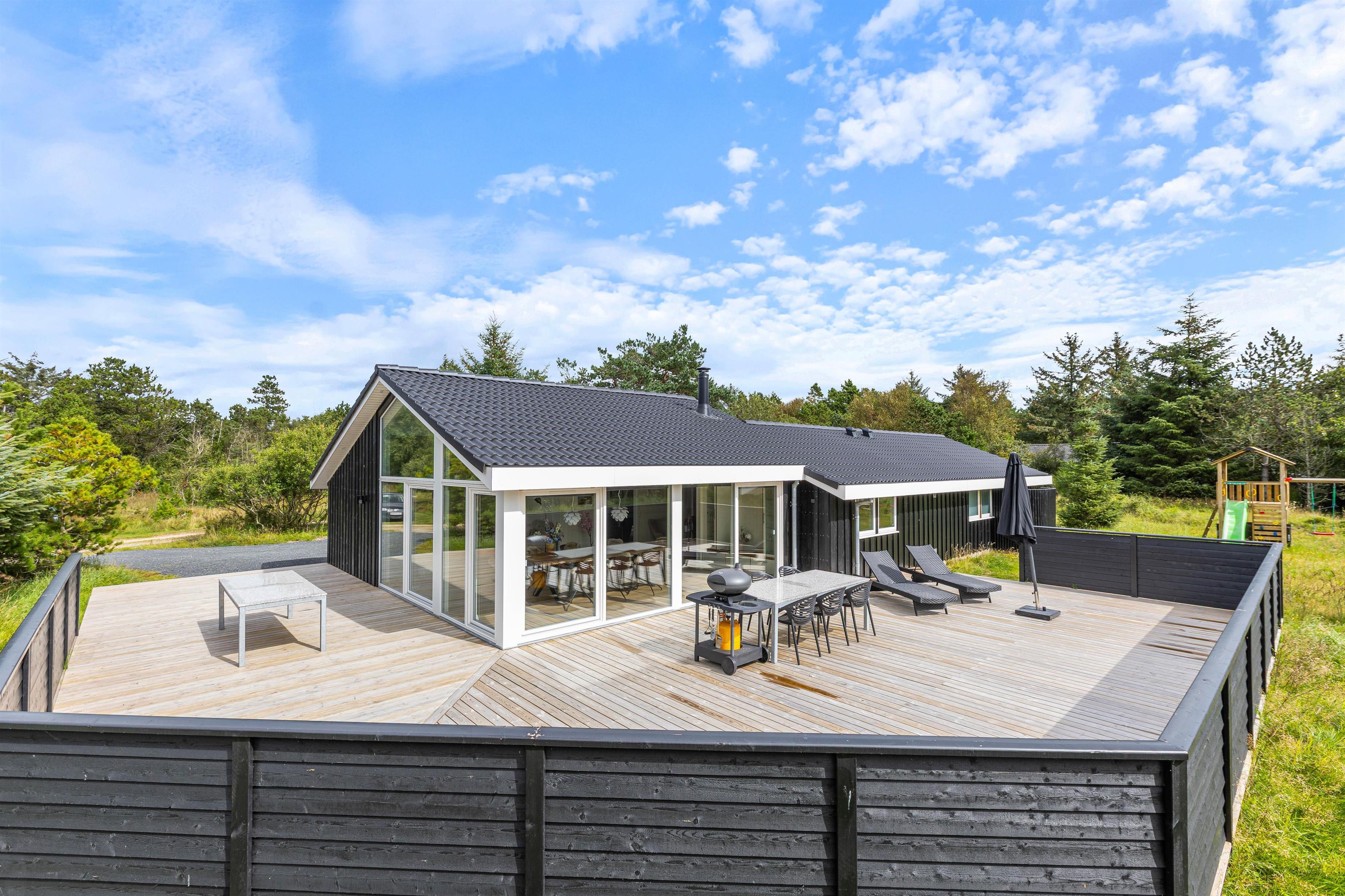 På terrassen kan du nyde den friske vesterhavsluft i fulde drag. Der er både liggestole og havemøbler til rådighed, så I kan flytte rundt efter vejret. Børnene kan hygge sig på gyngerne eller i sandkassen. Der er en lille skov i umiddelbar nærhed, som bare venter på at blive udforsket og indbyder til en gåtur eller måske en skattejagt. Efter en dejlig sommerdag kan I nyde aftensmaden fra grillen på terrassen.