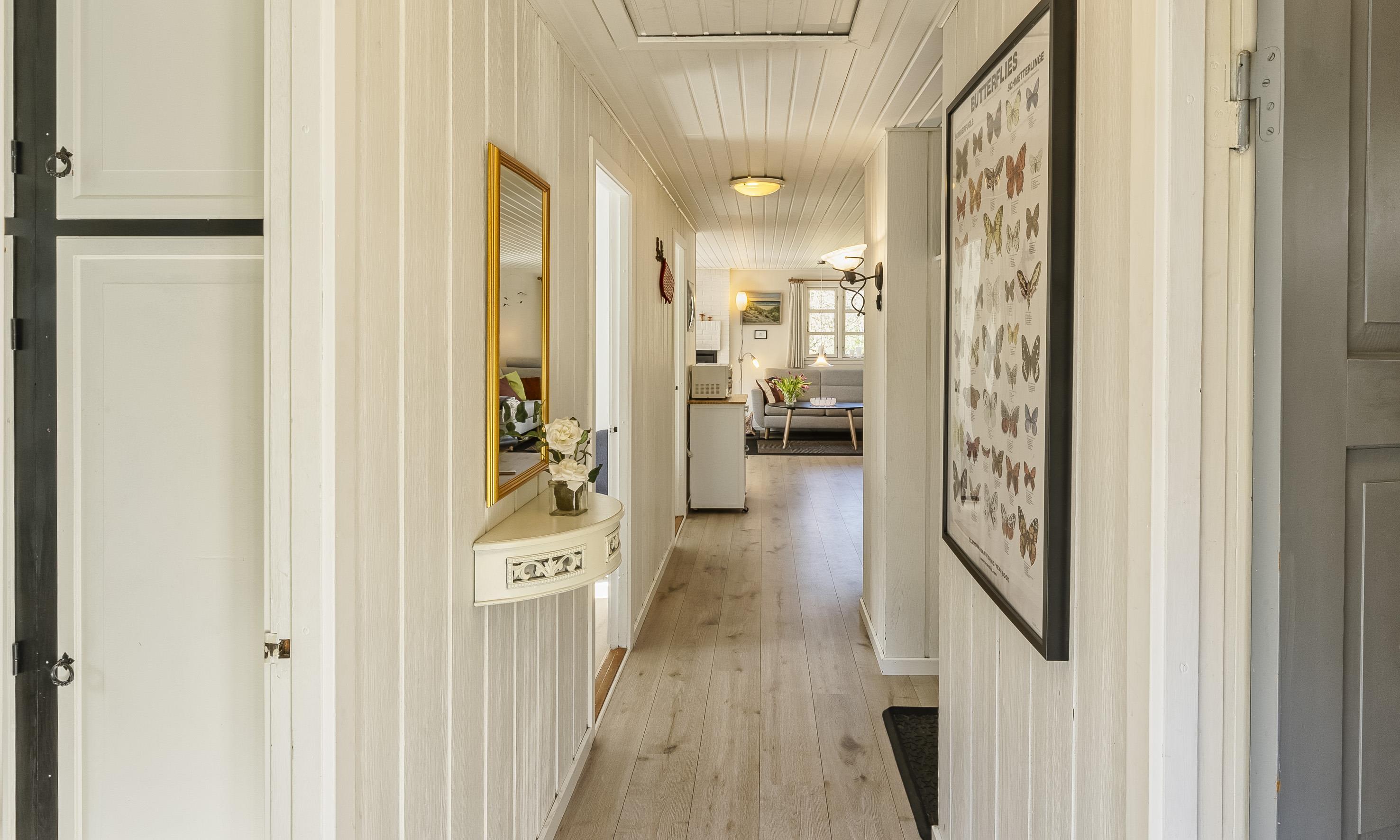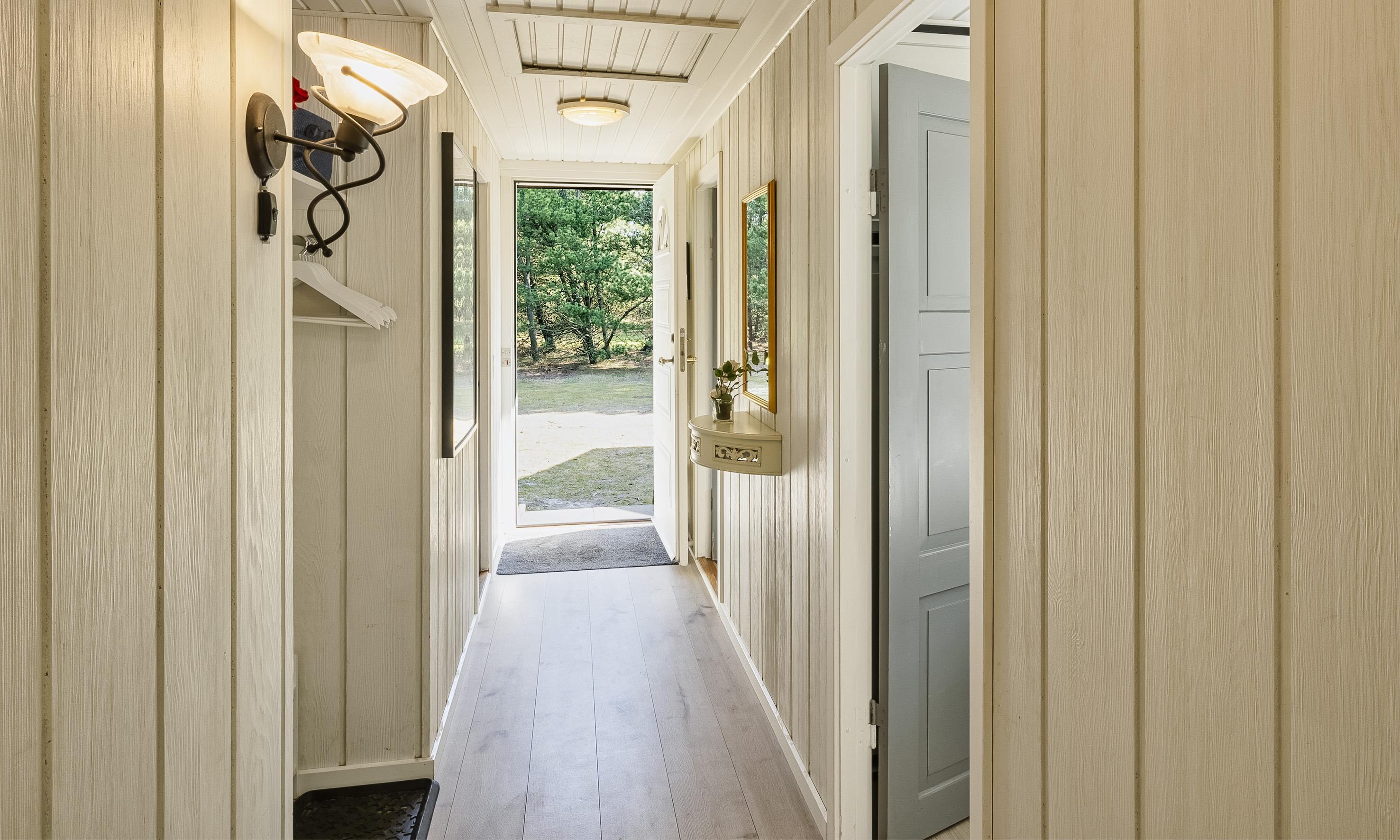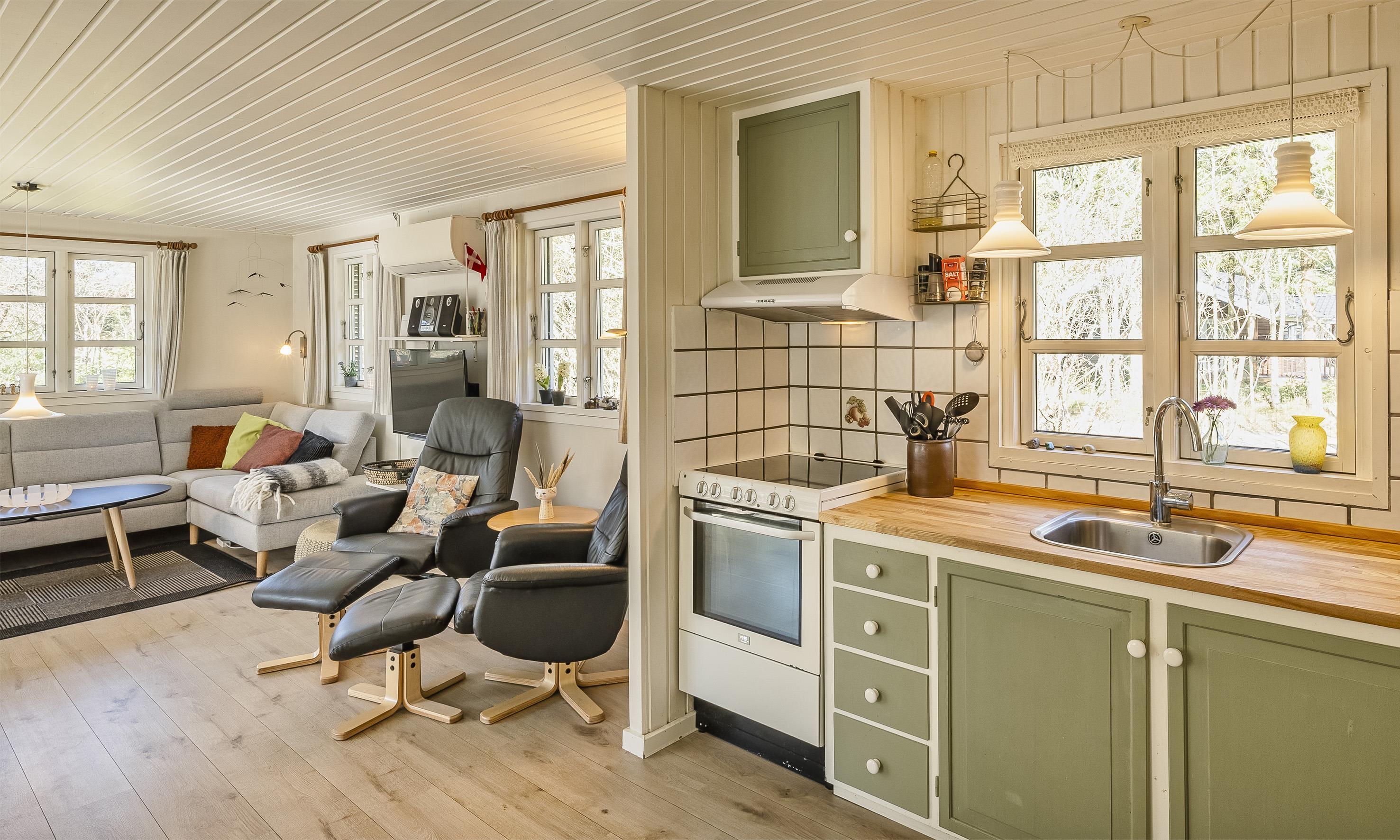 Køkkenet er i åben forbindelse med spisepladsen og stuen, hvorfra der er udgang til den store terrasse. Badeværelset har toilet, håndvask, bruser og gulvvarme. Sovepladserne er fordelt på 3 værelser i huset; 2 med dobbeltseng og 1 med enkeltseng (2DS & 1ES).