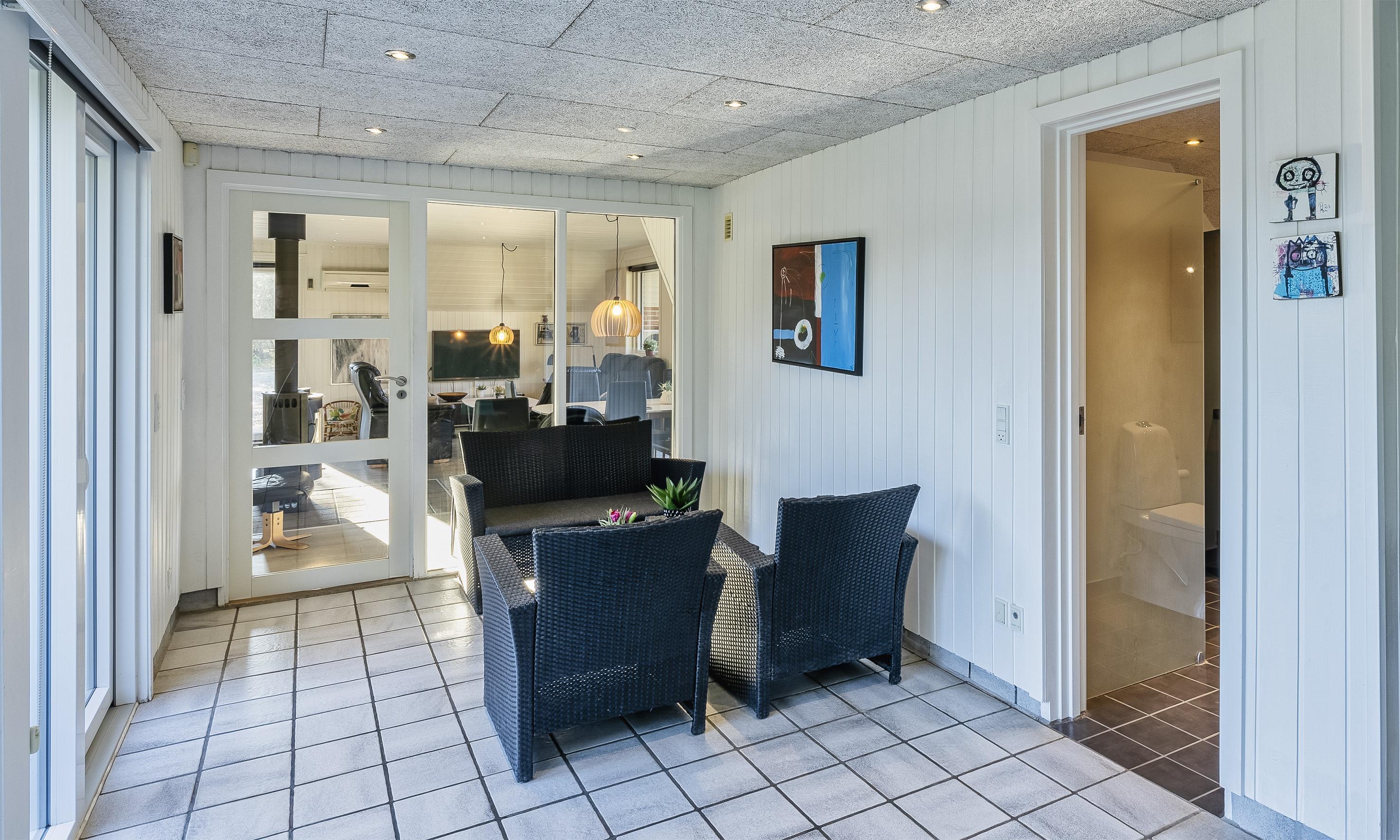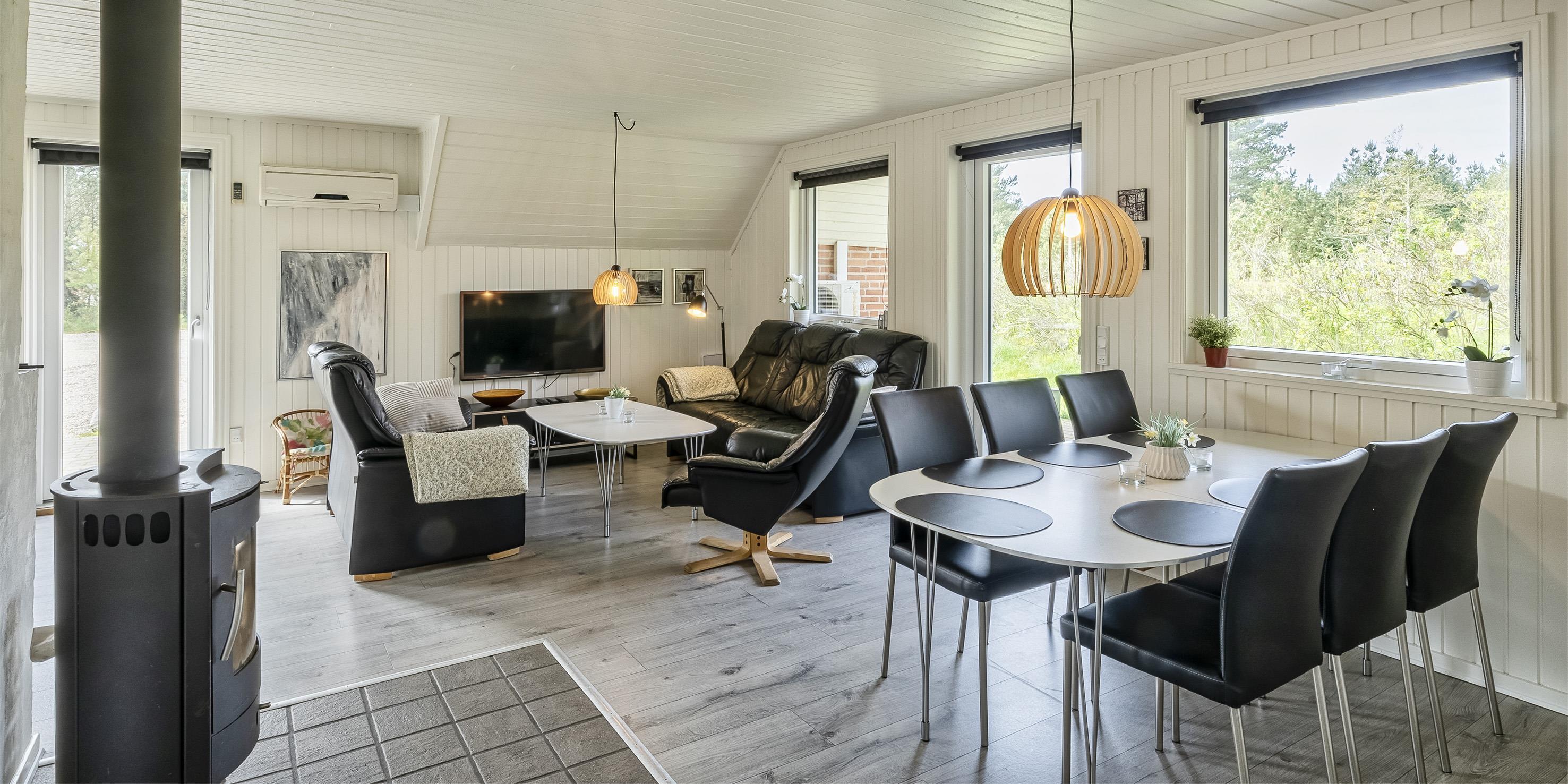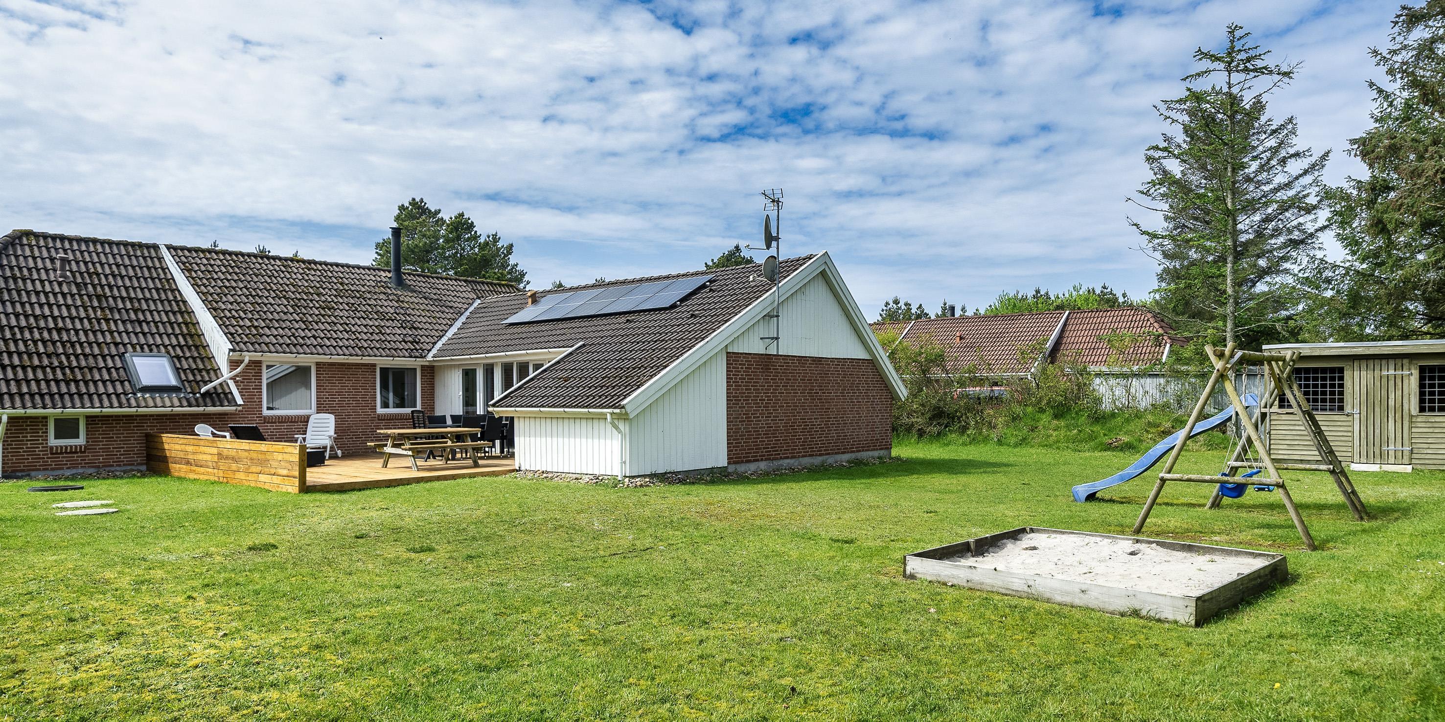 Huset indeholder: Indgang igennem stor entre med vaskemaskine, tørretumbler og god plads til garderoben. Herfra er der adgang til 2 værelser, ét med en dobbeltseng og ét værelse med en smal dobbeltseng. Nyt badeværelser med bruser/wc og vaskearrangement, der er kun adgang til badeværelset igennem værelset med den smalle dobbeltseng. Fra entreen kommer man over i huset opholdsrum med nyere køkken med køle-/fryseskab, opvaskemaskine, indbygningsovn, keramiskkogeplade og mikroovn. Dejlig lys stue i åben forbindelse med køkkenet. Stuen er indrettent med brændeovn, fjernsyn, parabol og Chromecast (ingen danske programmer). Trådløs Internetadgang. Spisestue afdeling med udgang til vestvendt terrasse samt kig til poolrummet. Poolrummet er med ca. 5,4 x 3,5 x 1,15 meter (længde x brede x dybde) stor bassin og spa til selvbetjening. Huset har luft til vand varmepumpe til opvarmning af poolen for reduktion af strømforbruget. Badeværelse med toilet, bruser, vaskearrangement og sauna. Huset byder ydermere på 2 soveværelser med hver 1 smal dobbeltseng. 4 soveværelser: DS + DS + DS + DS. De udvendige forhold byder på flere små terrasser, så både mogen middag og aftensolen kan nydes på et af terrasserne. Der forefindes en sandkasse og en gynge til de mindre børn. Adgang til Oksbøl Badeland 2025. Huset er tilladt med max. 2 hunde. Rygning er ikke tilladt i huset! Byggeår 1986, renoveret 2019 og 2020.