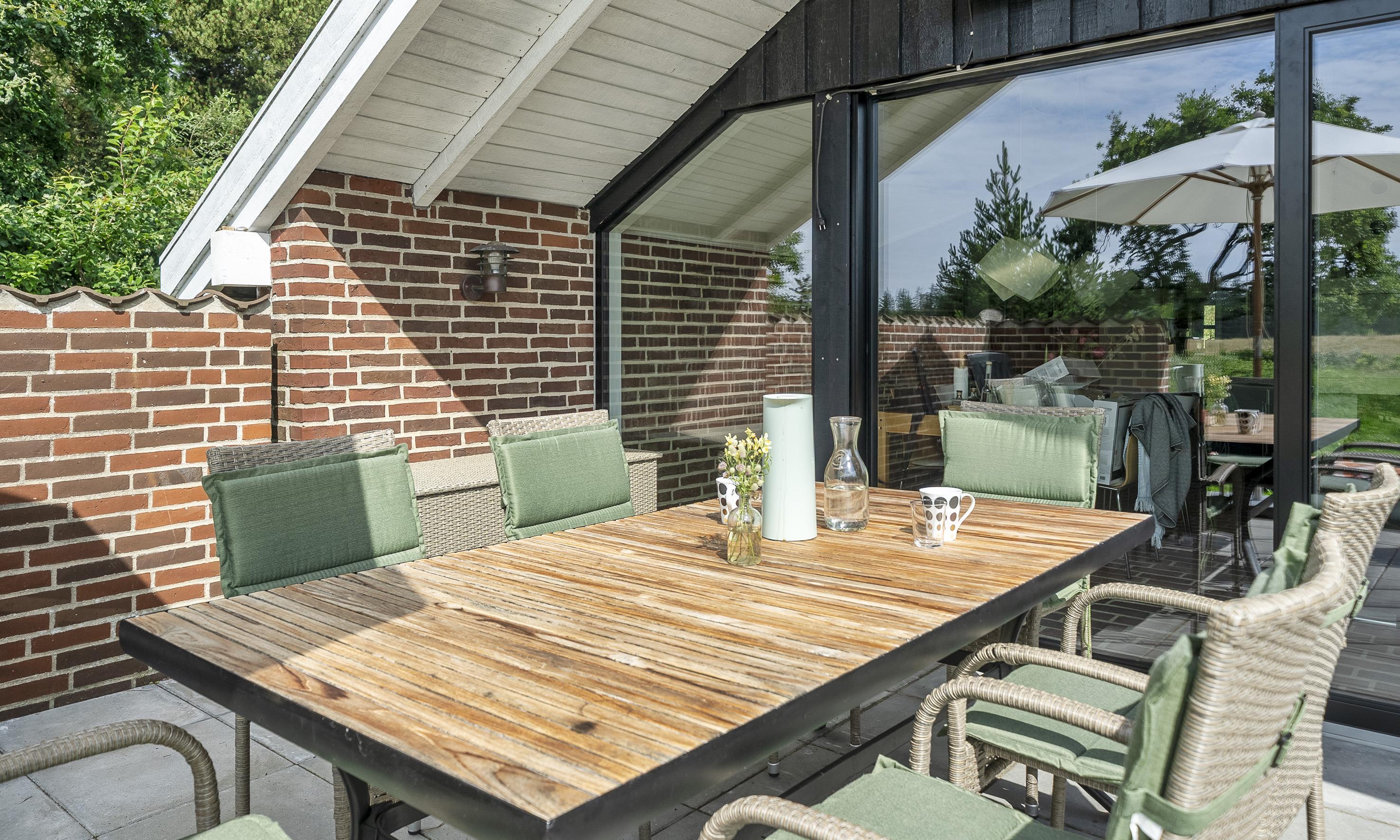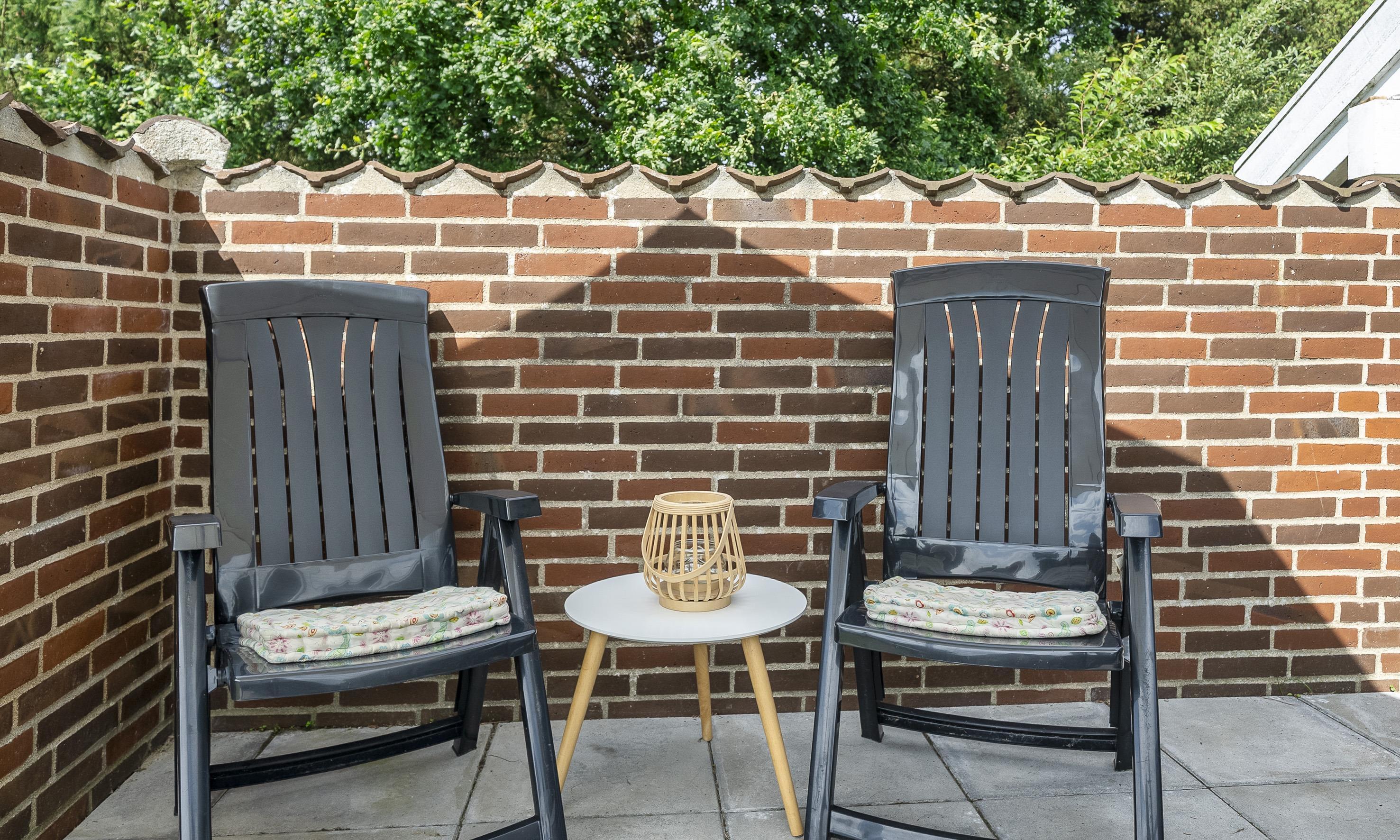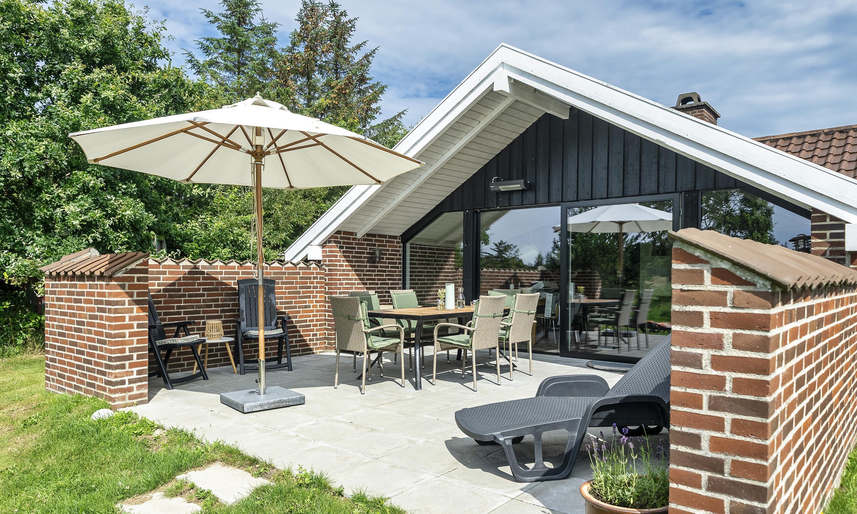 De udvendige faciliteter byder på en delvis overdækket sydvendt terrasse med terrassevarmer, komfortable møbler, solsenge, en gasgrill og en kuglegrill. Her kan aftenerne forlænges og nydes både forår, sommer og efterår. Derudover er der etableret siddepladser rundt omkring på grunden, afstemt i forhold til solen.