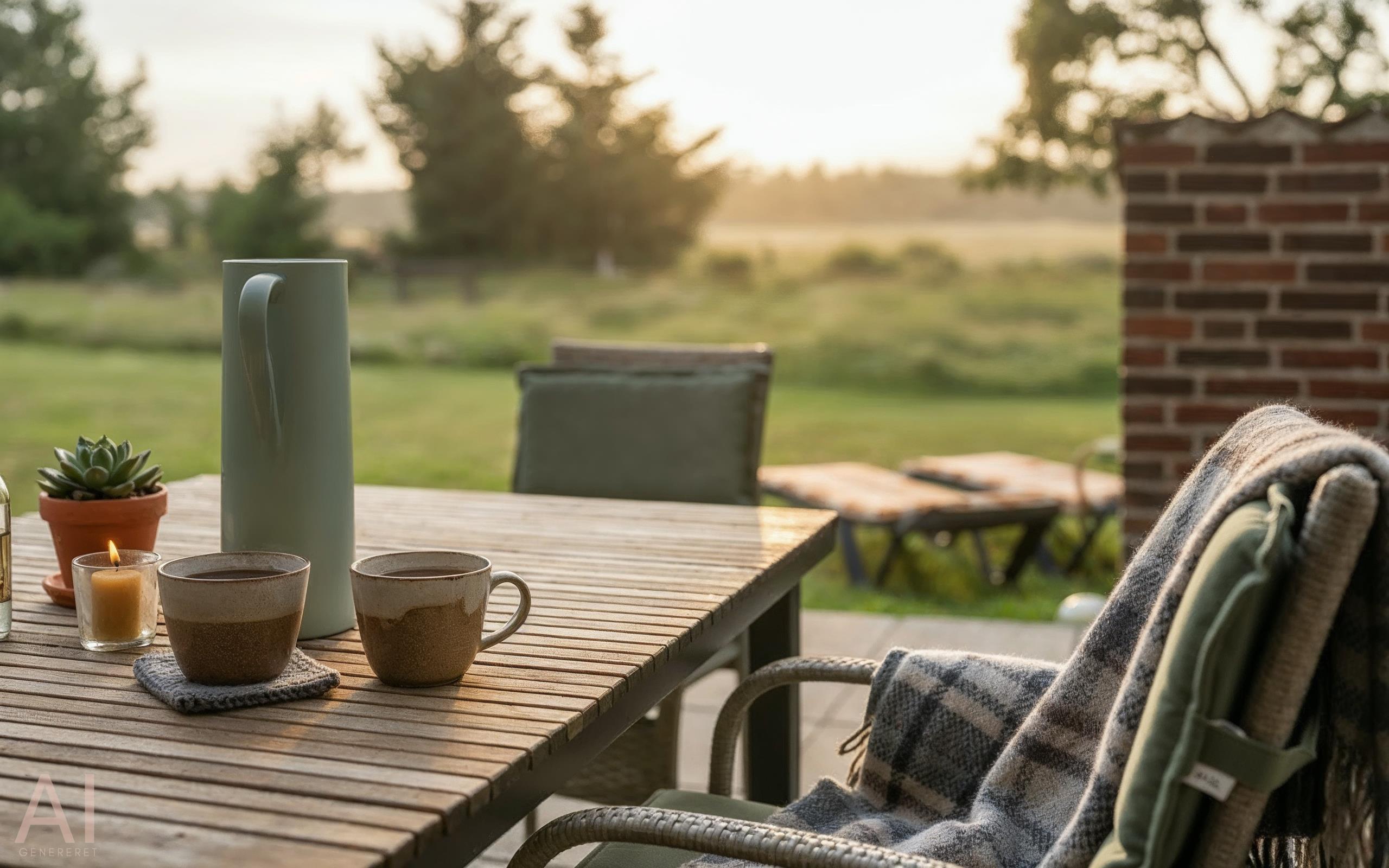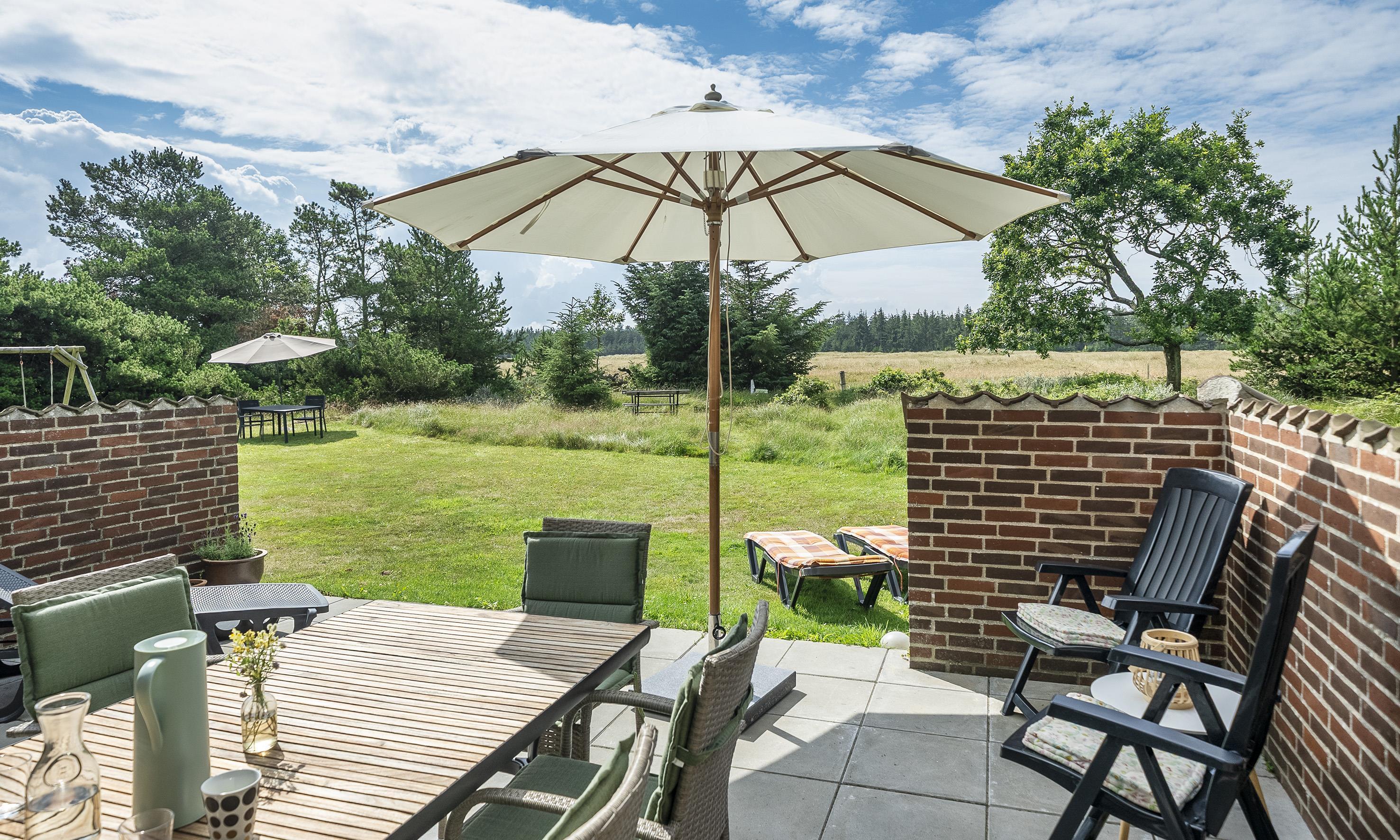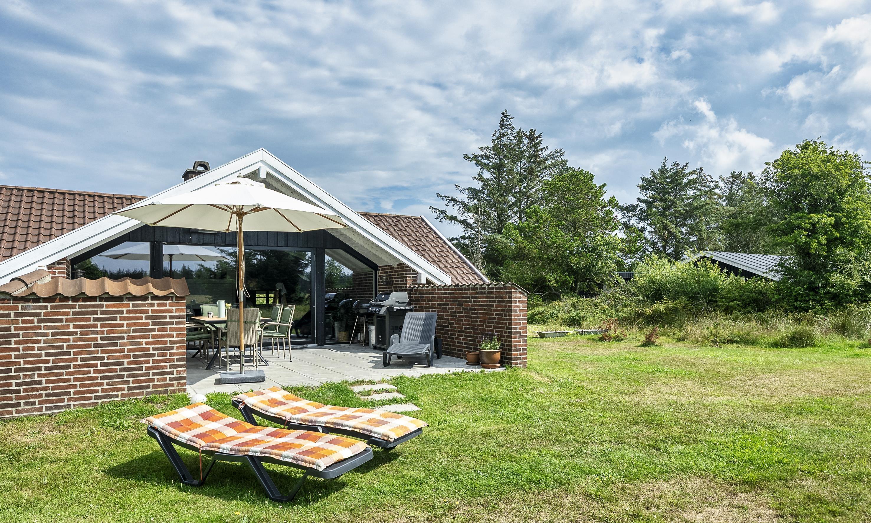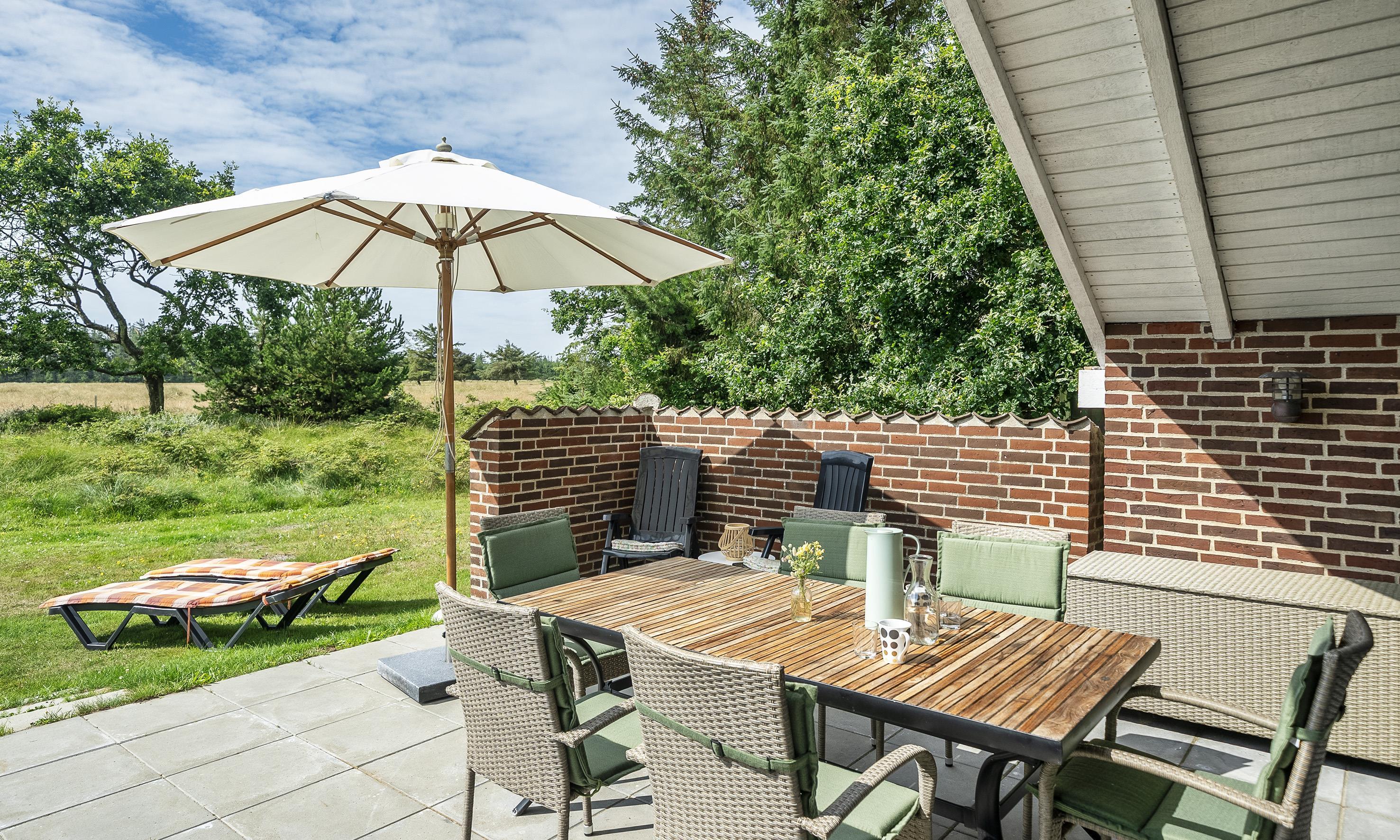 De udvendige faciliteter byder på en delvis overdækket sydvendt terrasse med terrassevarmer, komfortable møbler, solsenge, en gasgrill og en kuglegrill. Her kan aftenerne forlænges og nydes både forår, sommer og efterår. Derudover er der etableret siddepladser rundt omkring på grunden, afstemt i forhold til solen.