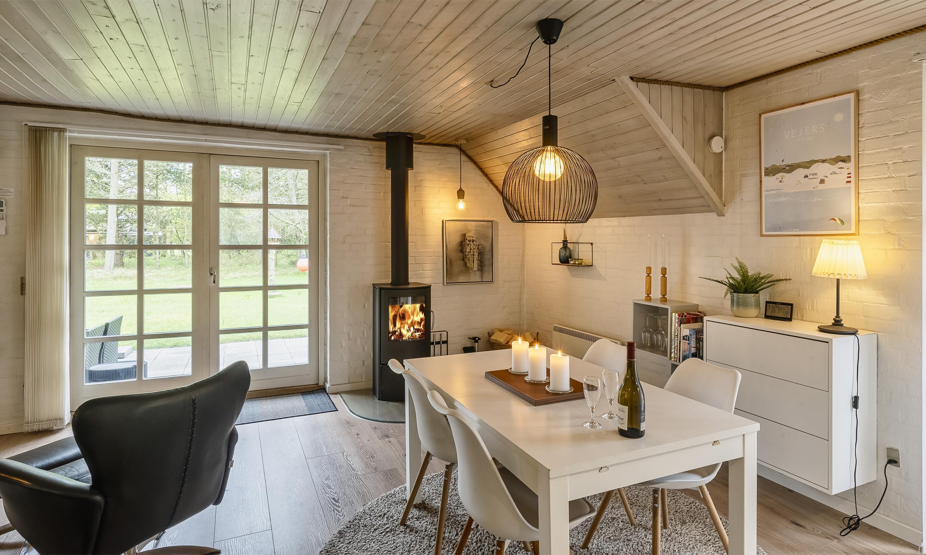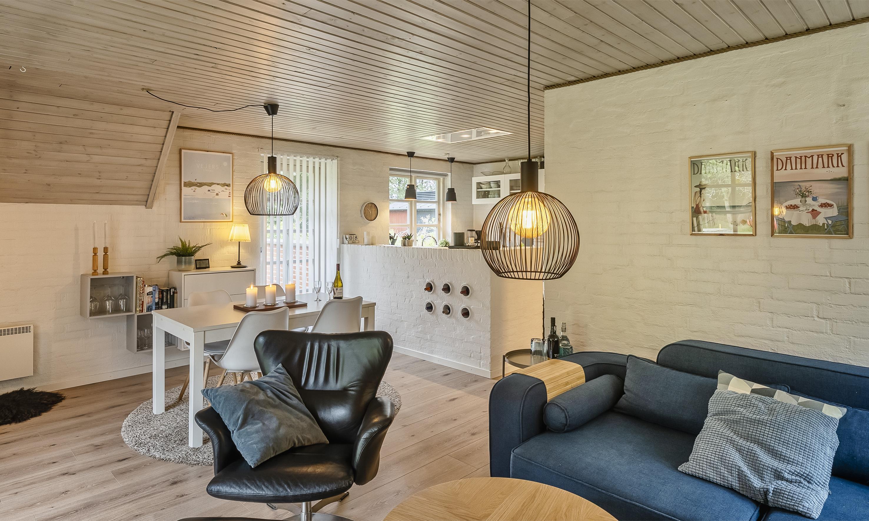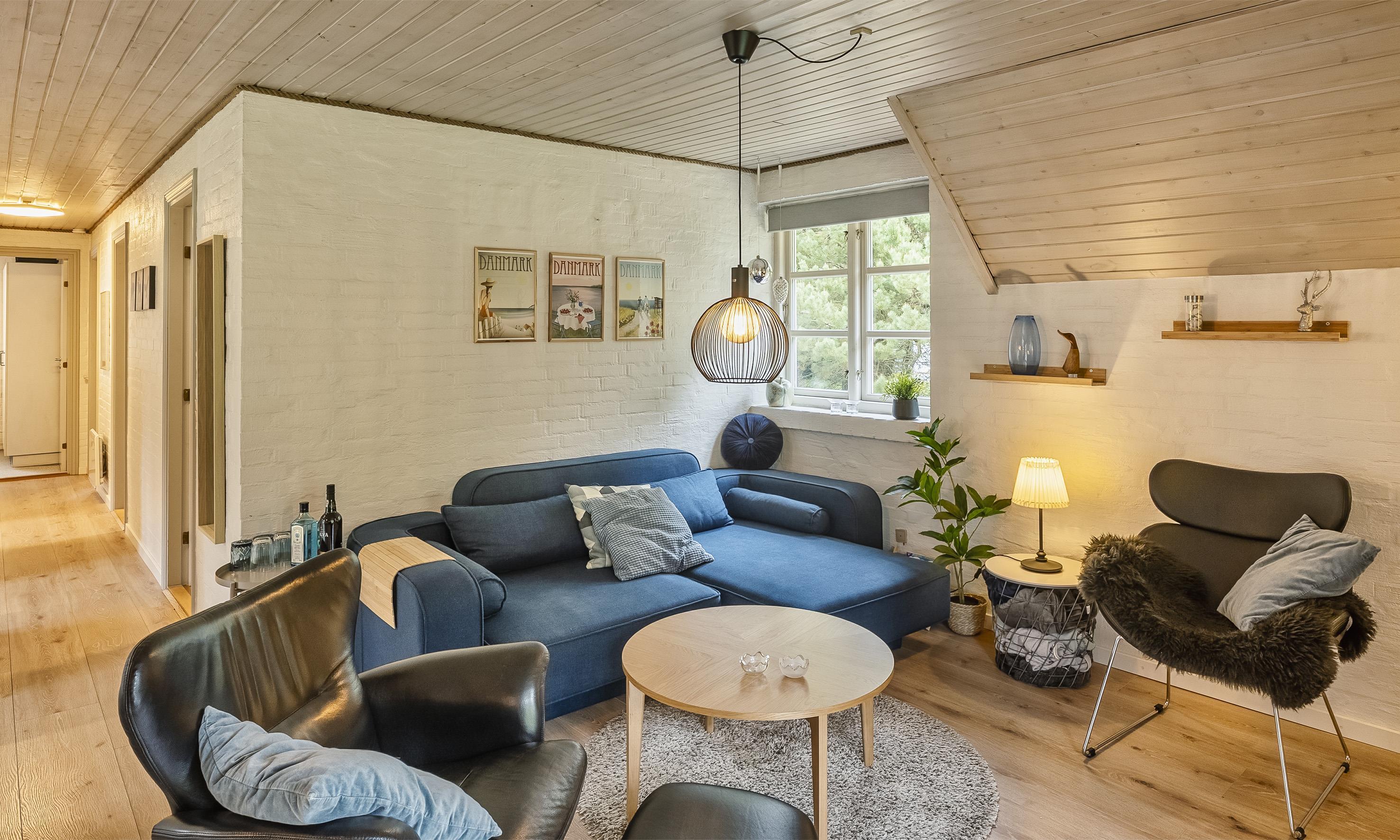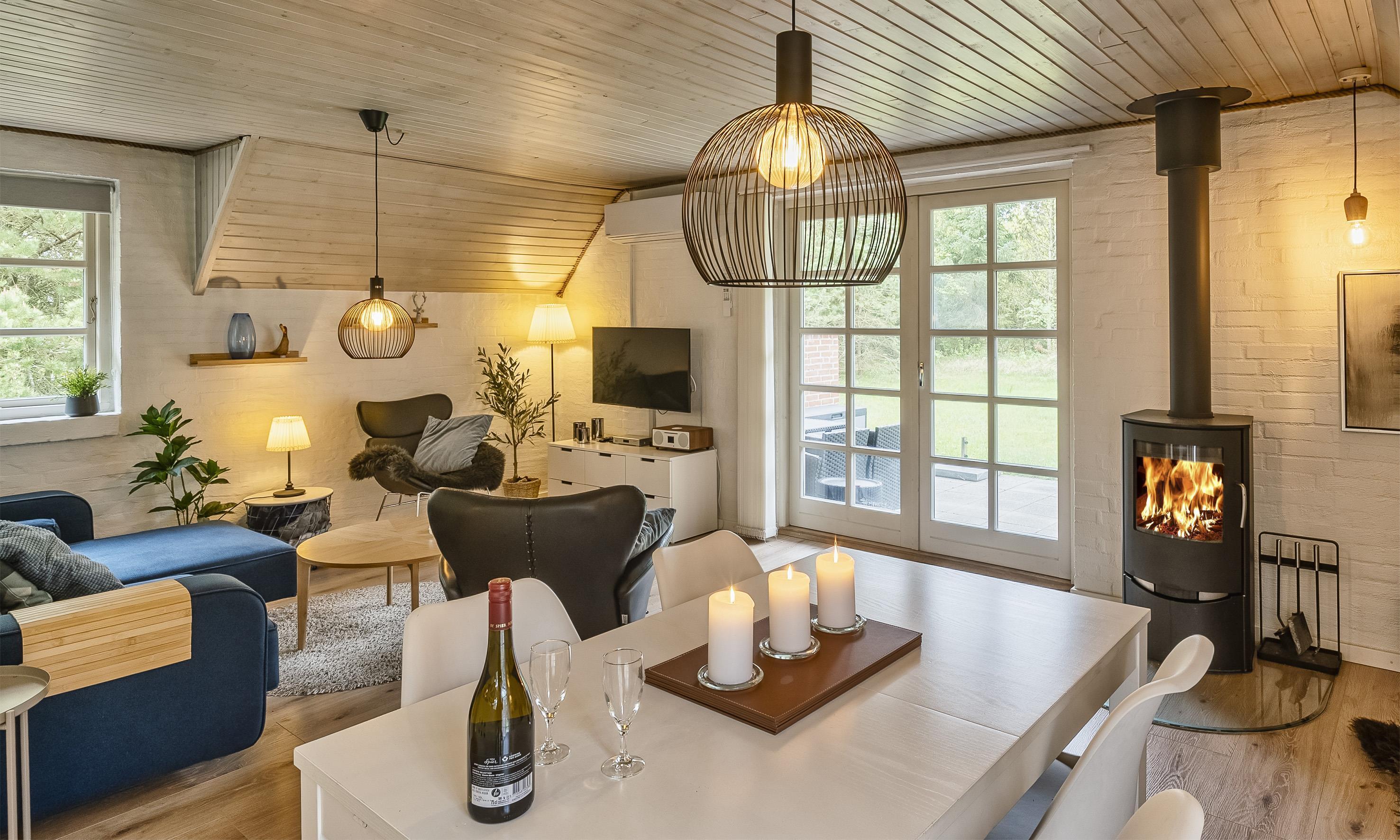 Charmerende og lyst sommerhus til 4-6 personer, beliggende på delvis lukket naturgrund, ca. 2.000 meter fra stranden. Huset indeholder: Entre med lille teknikrum. Foedelingsgang i åben forbindelse med opholdsrummet. Opholdsrummet er fordelt over et åbent køkken med opvaskemaksine.Hyggelig stue med brændeovn, fjernsyn med danske kanaler igennem stofa (sommerhuspakke). Trådløs Internetadgang. Varmepumpe. Badeværelse med bruser/wc og sauna. Kombineret vaskemaskine og tørretumbler. 3 soveværesler: DS + 2S + 2S. Husdyr er ikke tilladt - ved lillé hund kan der forespørges på udlejning ved henvendelse til bureauet. Rygning er ikke tilladt. Terrasse, sandkasse og gynge. Byggeår 1986. Renoveret 2021.