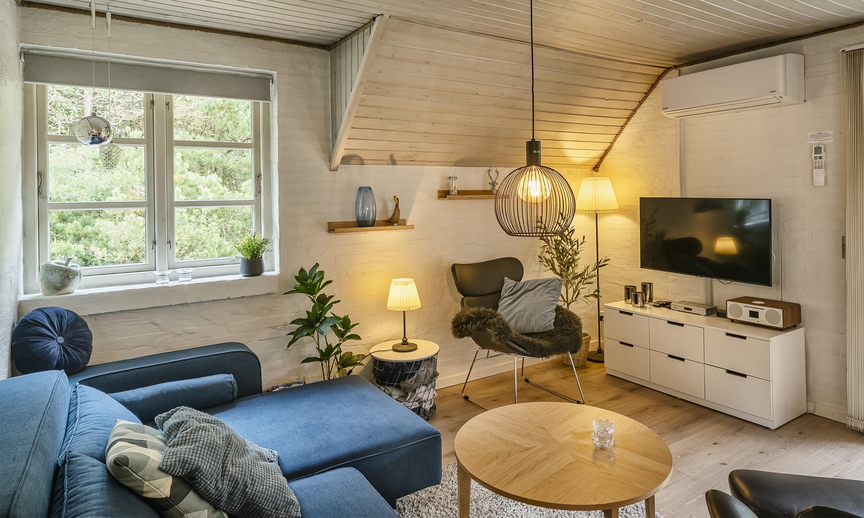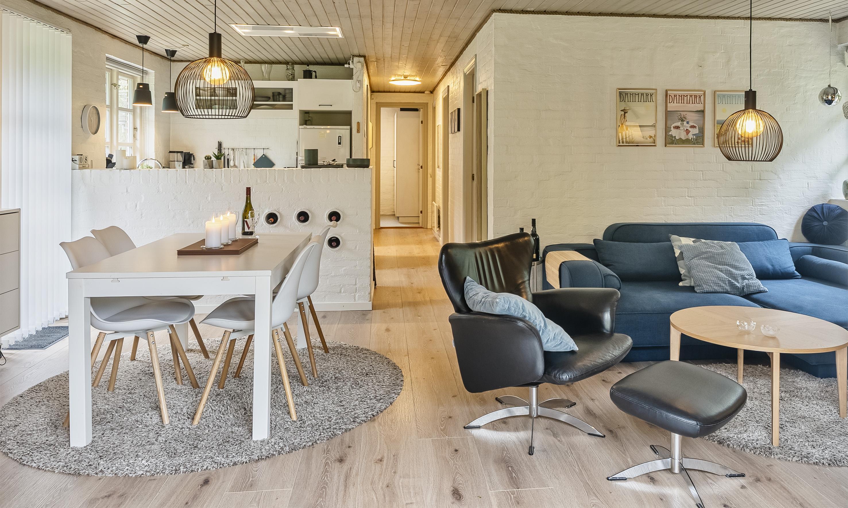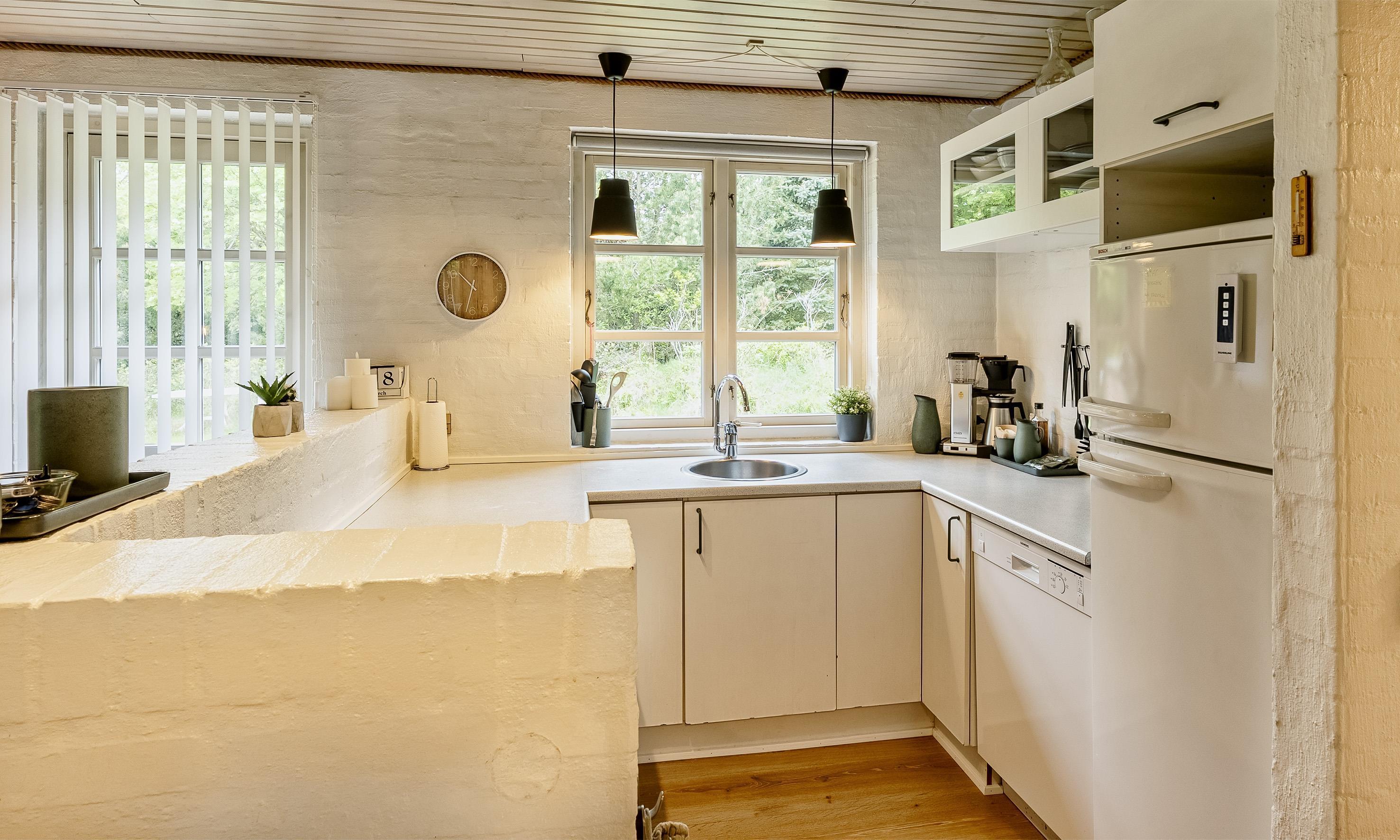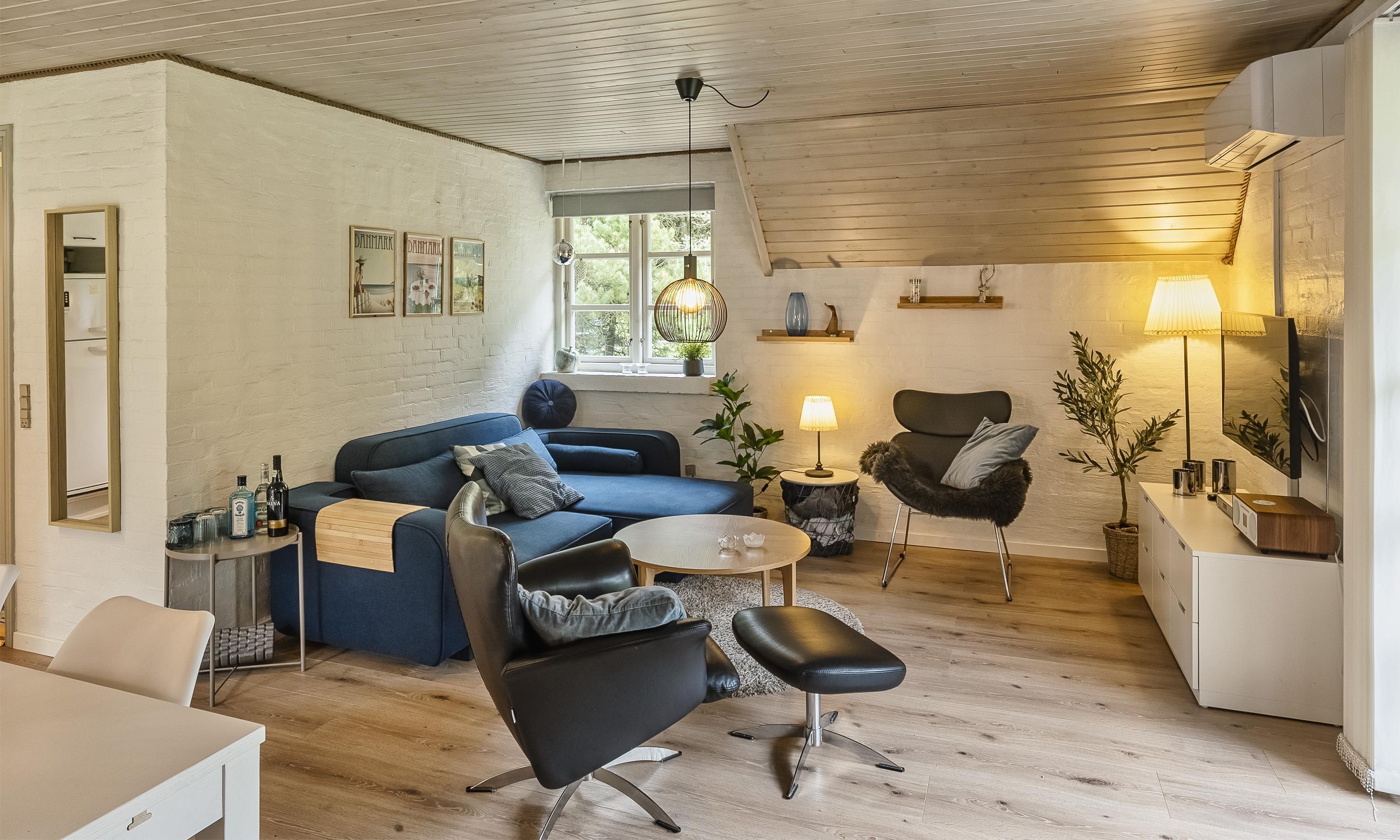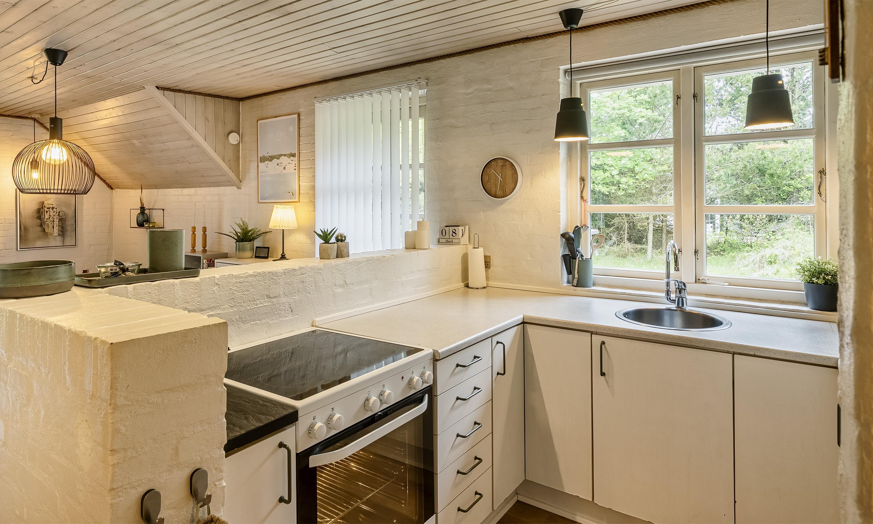 Charmerende og lyst sommerhus til 4-6 personer, beliggende på delvis lukket naturgrund, ca. 2.000 meter fra stranden. Huset indeholder: Entre med lille teknikrum. Foedelingsgang i åben forbindelse med opholdsrummet. Opholdsrummet er fordelt over et åbent køkken med opvaskemaksine.Hyggelig stue med brændeovn, fjernsyn med danske kanaler igennem stofa (sommerhuspakke). Trådløs Internetadgang. Varmepumpe. Badeværelse med bruser/wc og sauna. Kombineret vaskemaskine og tørretumbler. 3 soveværesler: DS + 2S + 2S. Husdyr er ikke tilladt - ved lillé hund kan der forespørges på udlejning ved henvendelse til bureauet. Rygning er ikke tilladt. Terrasse, sandkasse og gynge. Byggeår 1986. Renoveret 2021.