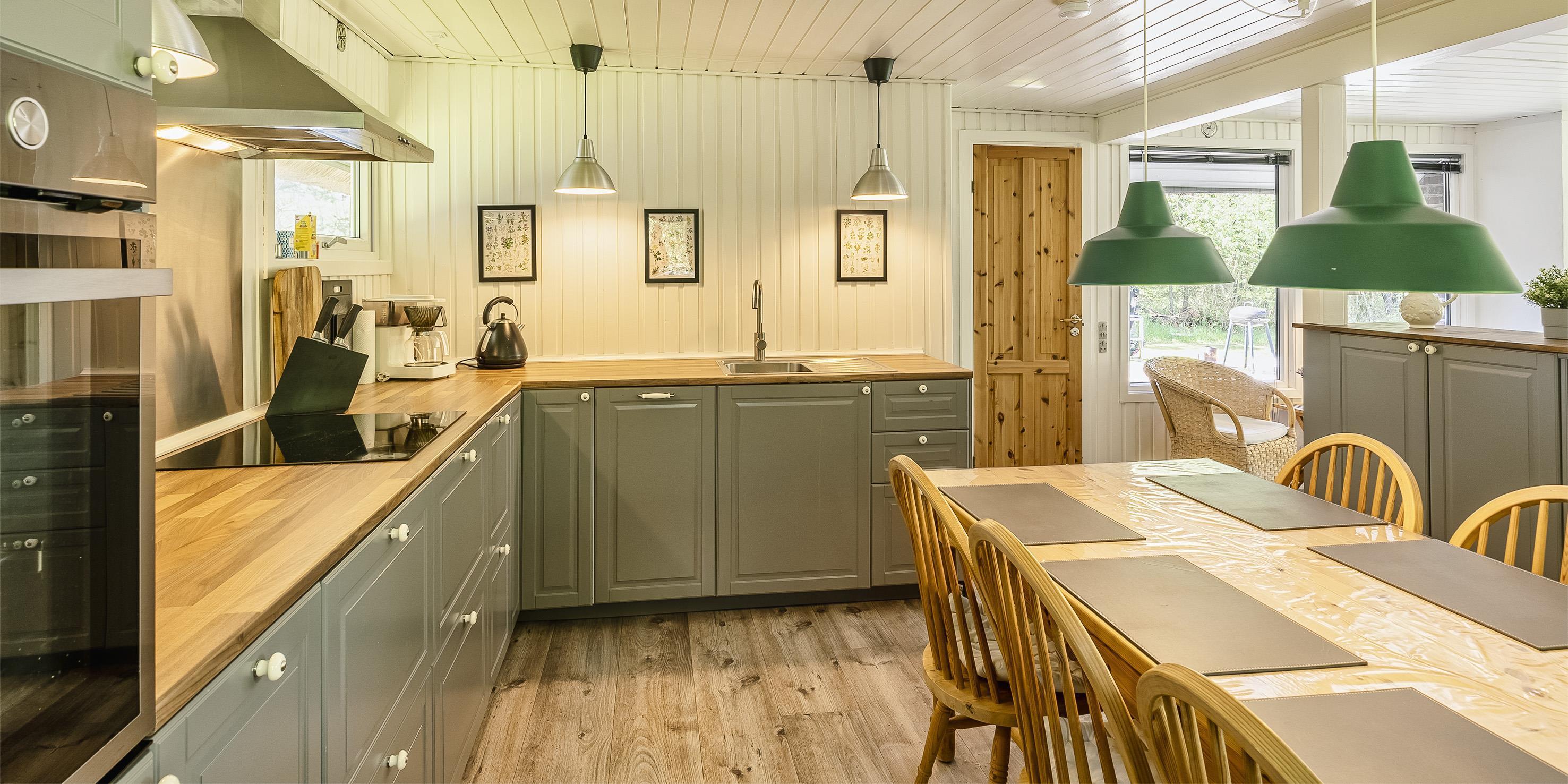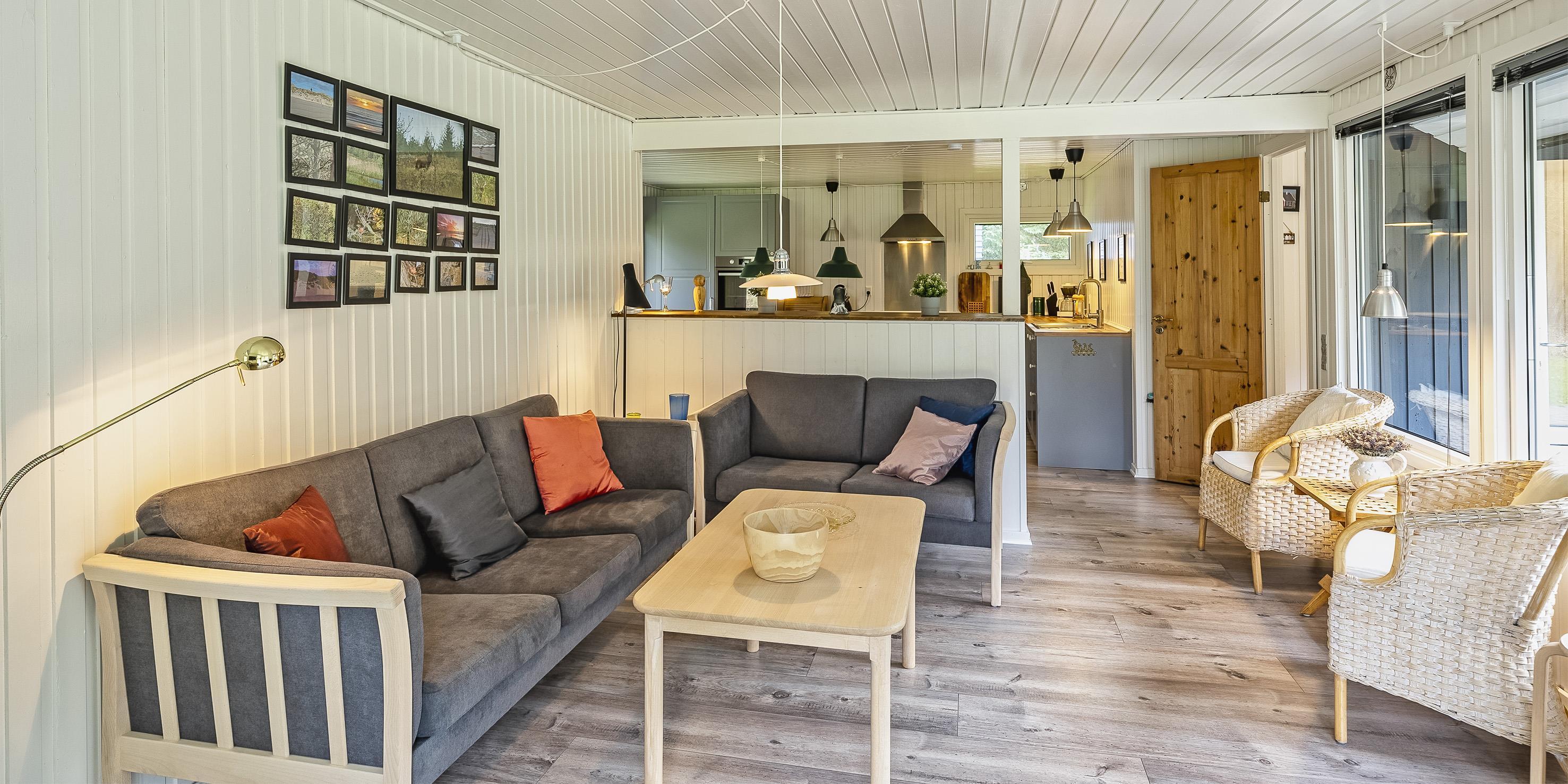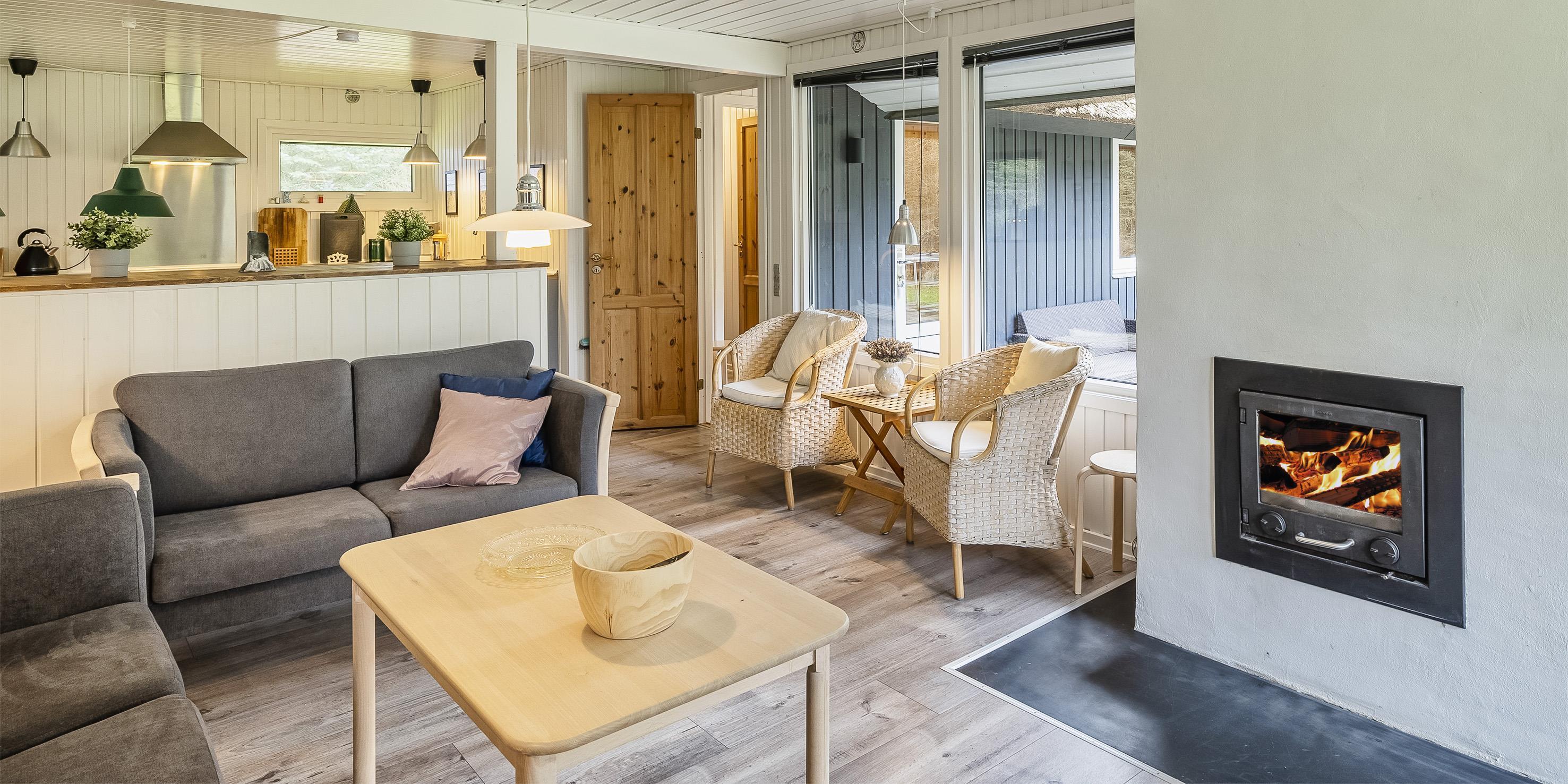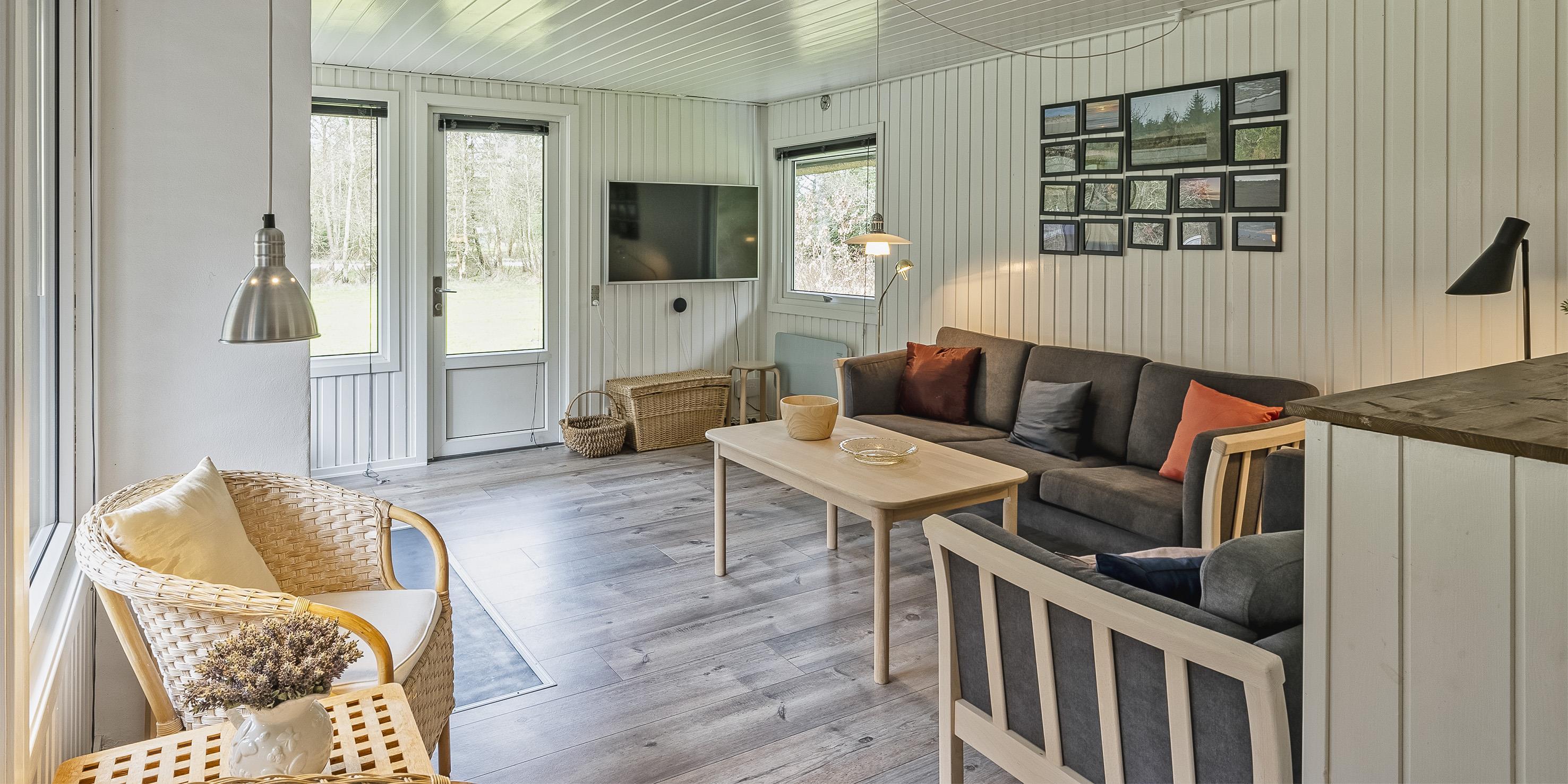 Huset indeholder: Entre/fordelingsgang der går over i huset køkken-alrum. Køkkenet er nyt fra 2021 fremstår som et landkøkken med træbordplade med opvaskemaskine, indbygget ovn, keramiskkogeplade, emhætte og et indbygnings køle-/fryseskab. Dejligt spiseplads med et langbord og god plads. Køkkenalrummet og stuen er opdelt af en halvvæg med ekstra skabe. Hyggelig og lys stue med sofahjørne med kig til Smart TV, Google mini nest og en indsatspejs som fungerer som brændeovn samt den hyggelige have. Der er udgang til haven fra en terrassedør i stuen. Huset har trådløst internet til rådighed. Fra fordelingsgangen er der adgang til 3 soveværelser: DS + 2S + 2S. Huset har en stor dejlig træterrasse mod syd, hvor solen kan nydes hele dagen, der er anlagt en grillplads og en sandkasse og legestativ for de små på terrassen. Der er en gas grill ved huset som husejer har stillet tilrådighed. Gas til grill skal medbringes. Huset råder også over en varmepumpe.