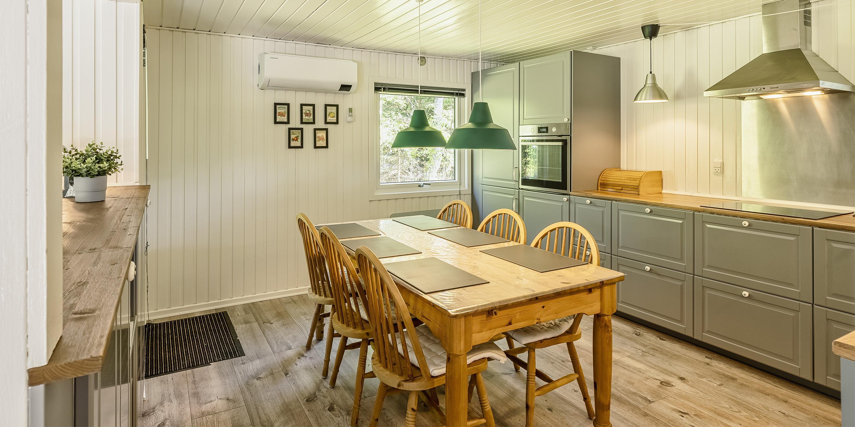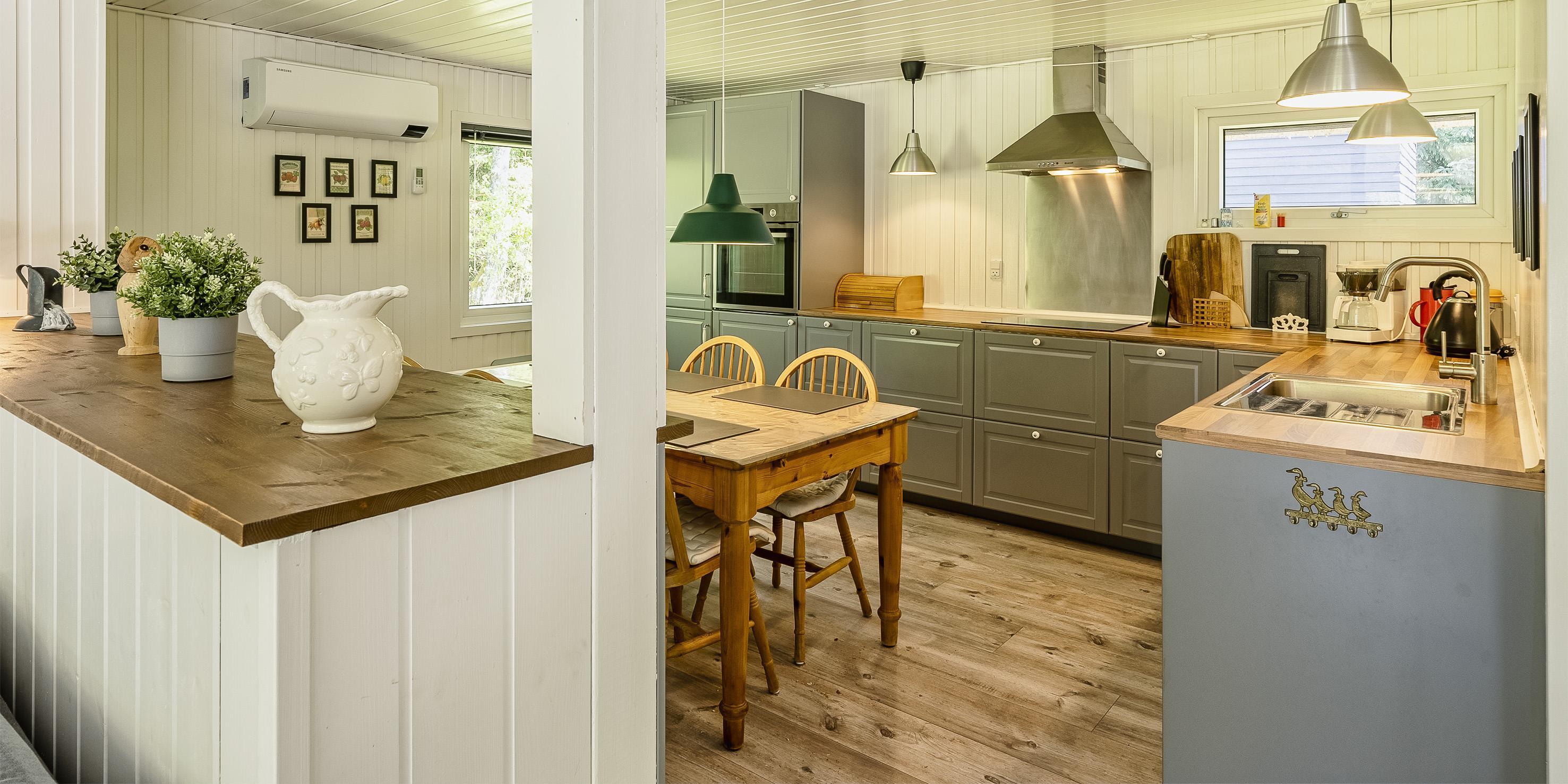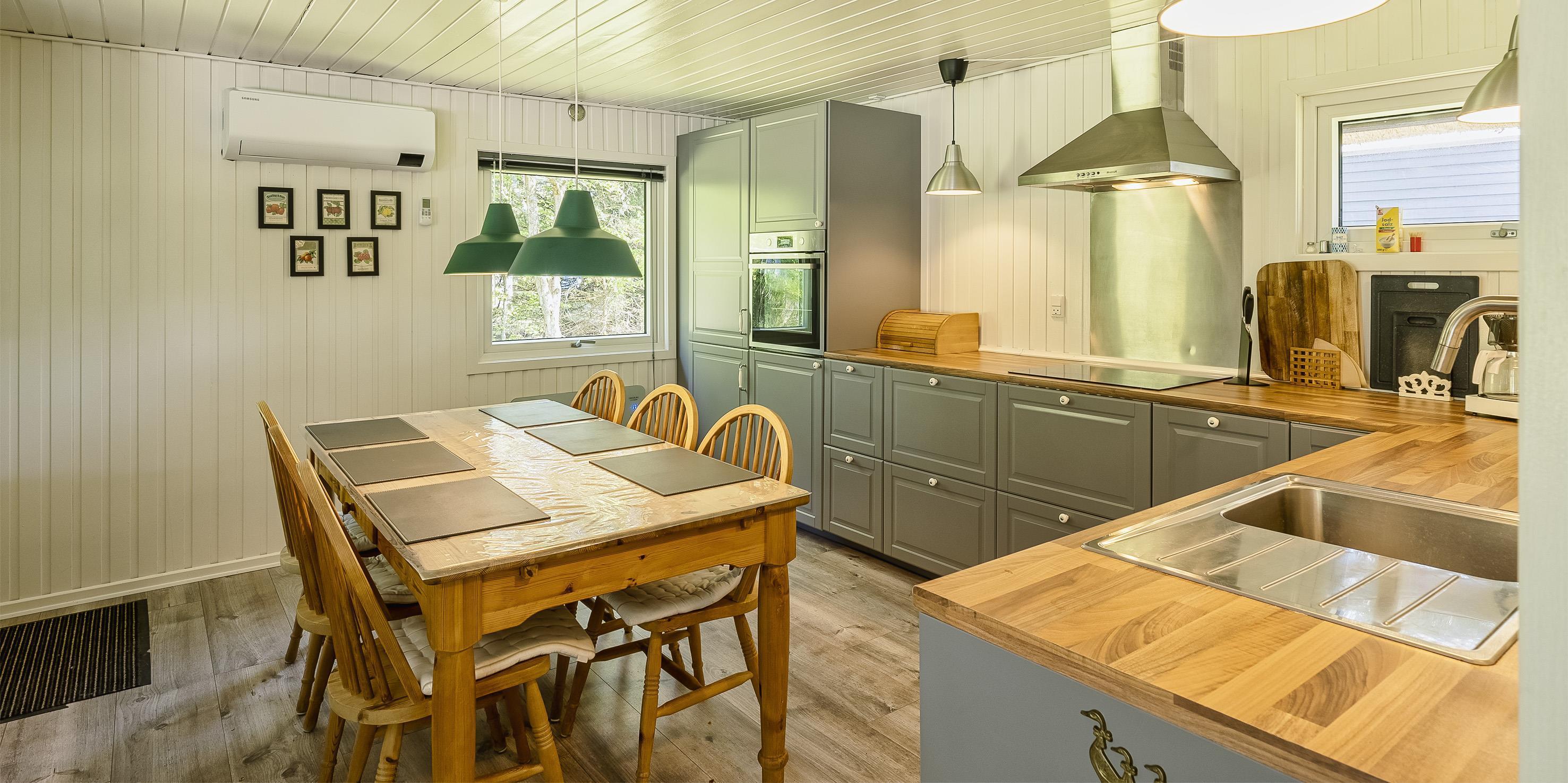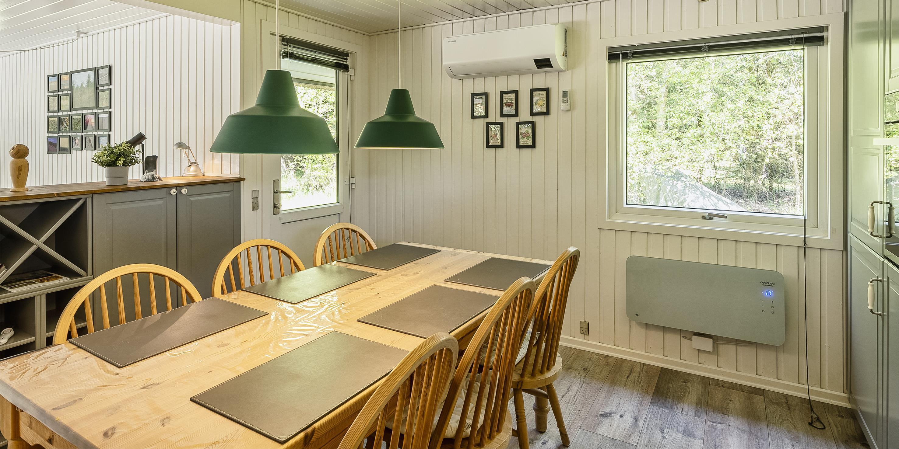 Huset indeholder: Entre/fordelingsgang der går over i huset køkken-alrum. Køkkenet er nyt fra 2021 fremstår som et landkøkken med træbordplade med opvaskemaskine, indbygget ovn, keramiskkogeplade, emhætte og et indbygnings køle-/fryseskab. Dejligt spiseplads med et langbord og god plads. Køkkenalrummet og stuen er opdelt af en halvvæg med ekstra skabe. Hyggelig og lys stue med sofahjørne med kig til Smart TV, Google mini nest og en indsatspejs som fungerer som brændeovn samt den hyggelige have. Der er udgang til haven fra en terrassedør i stuen. Huset har trådløst internet til rådighed. Fra fordelingsgangen er der adgang til 3 soveværelser: DS + 2S + 2S. Huset har en stor dejlig træterrasse mod syd, hvor solen kan nydes hele dagen, der er anlagt en grillplads og en sandkasse og legestativ for de små på terrassen. Der er en gas grill ved huset som husejer har stillet tilrådighed. Gas til grill skal medbringes. Huset råder også over en varmepumpe.