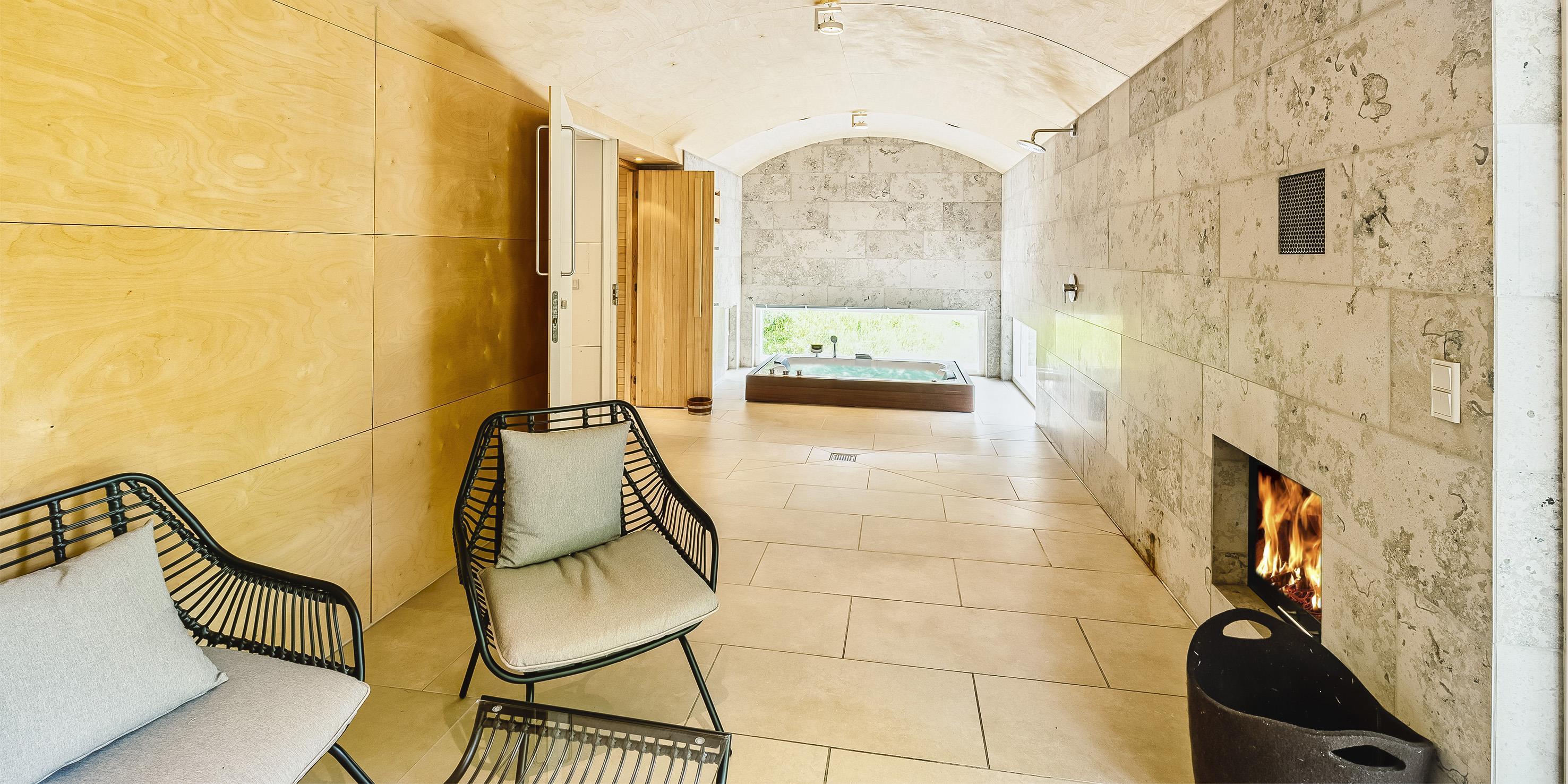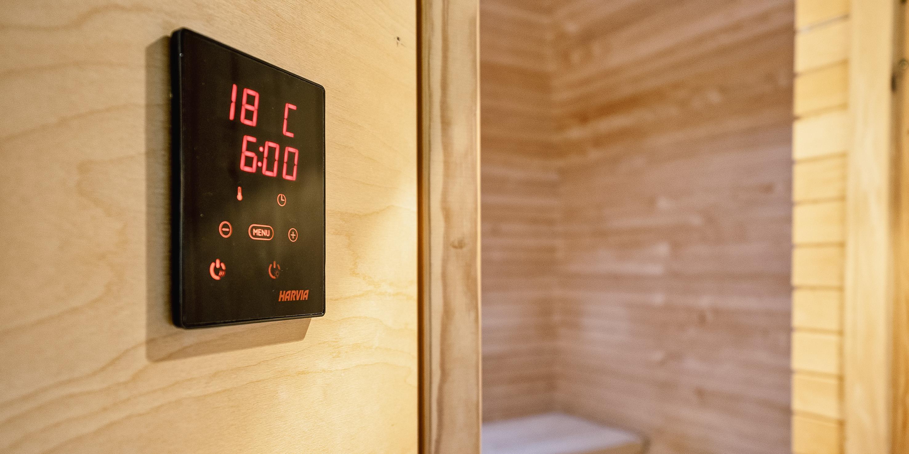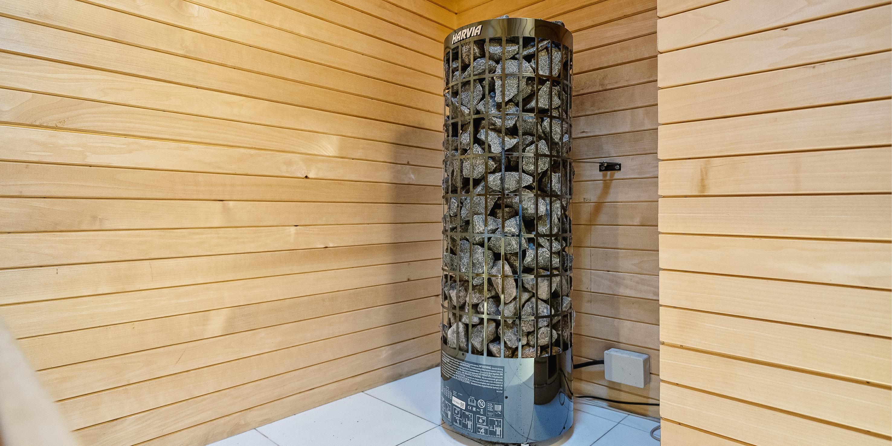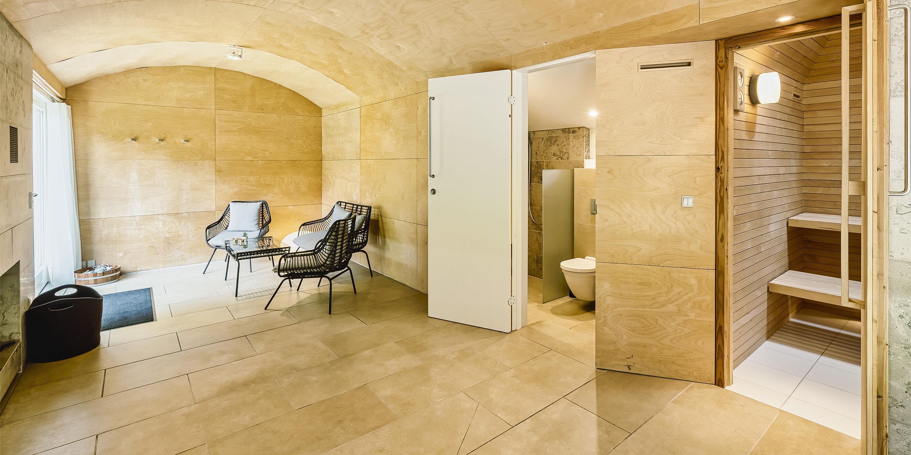 Badetempel med sauna, stor spa, bruser, toilet og brændeovn.