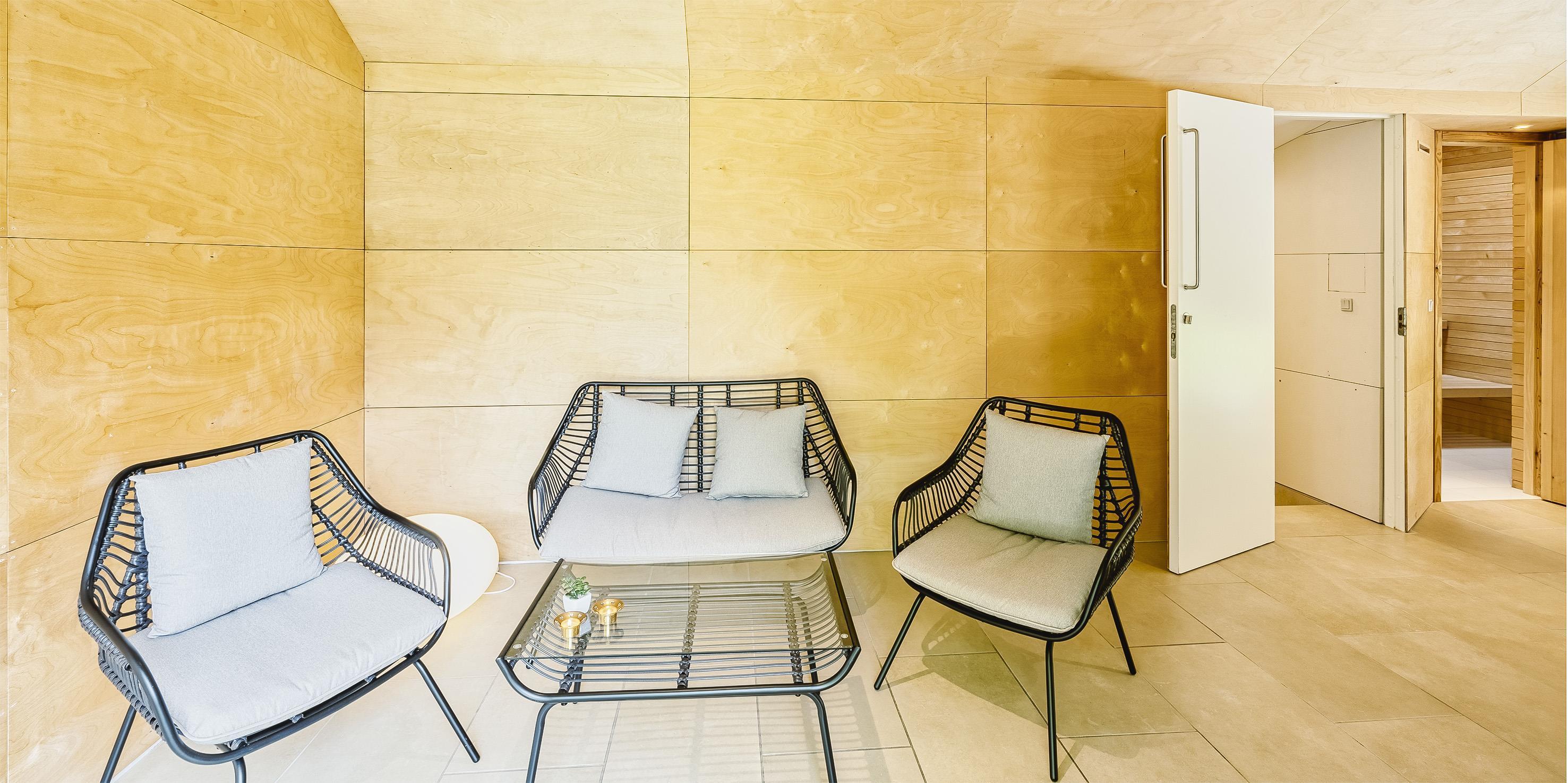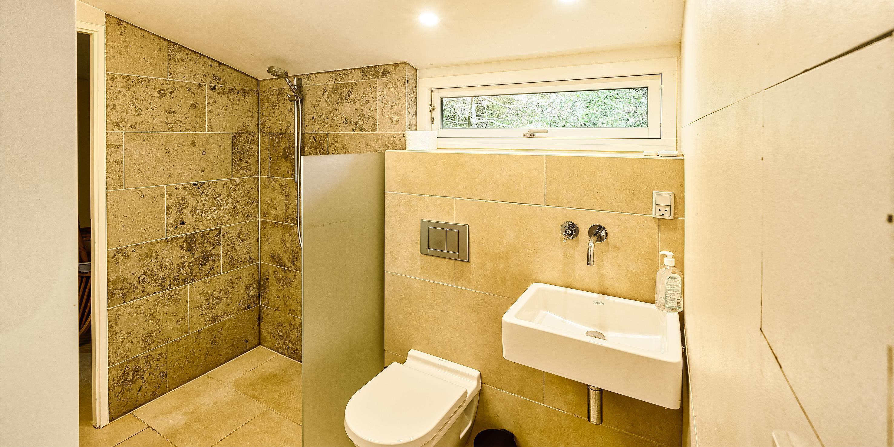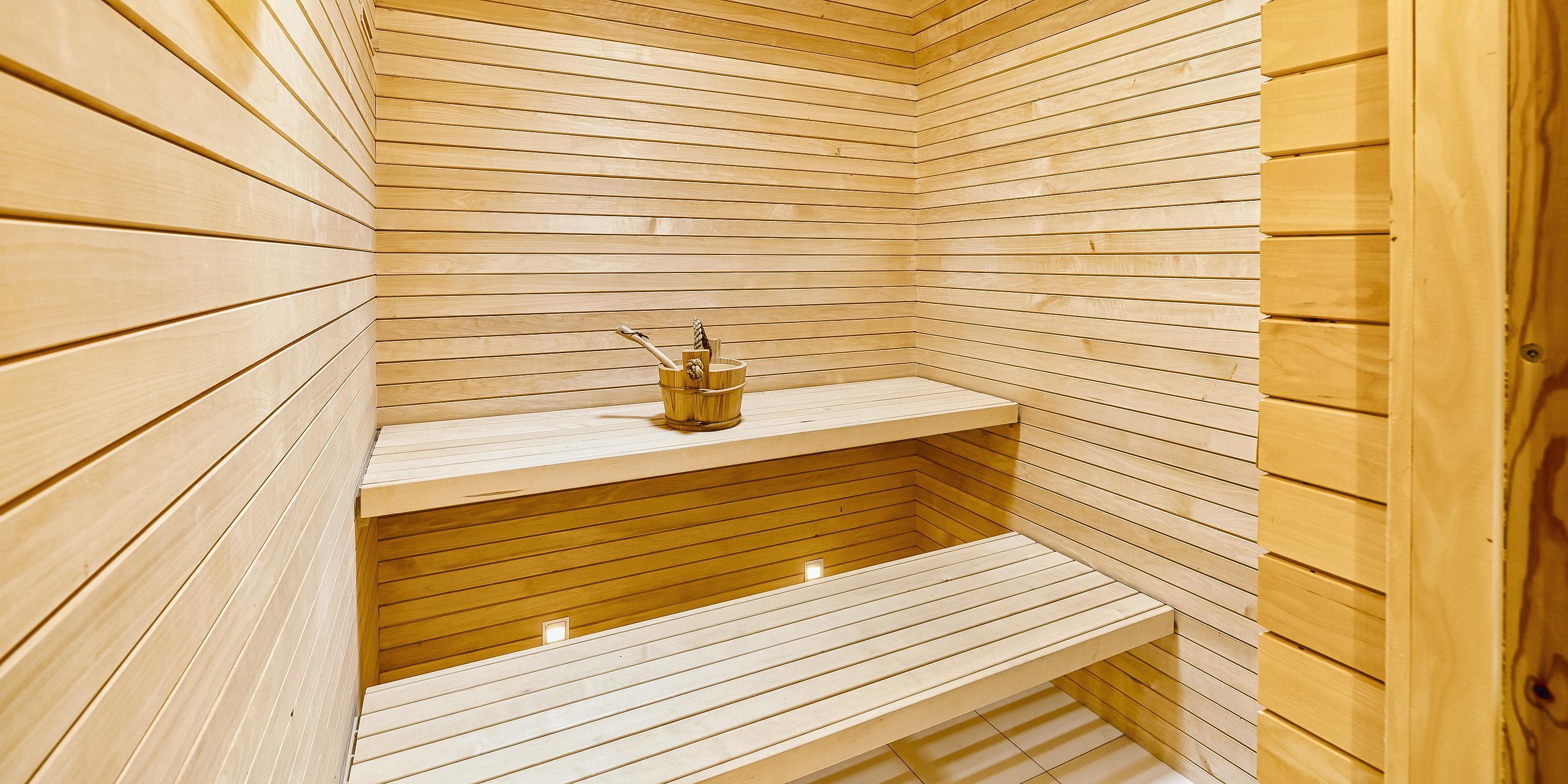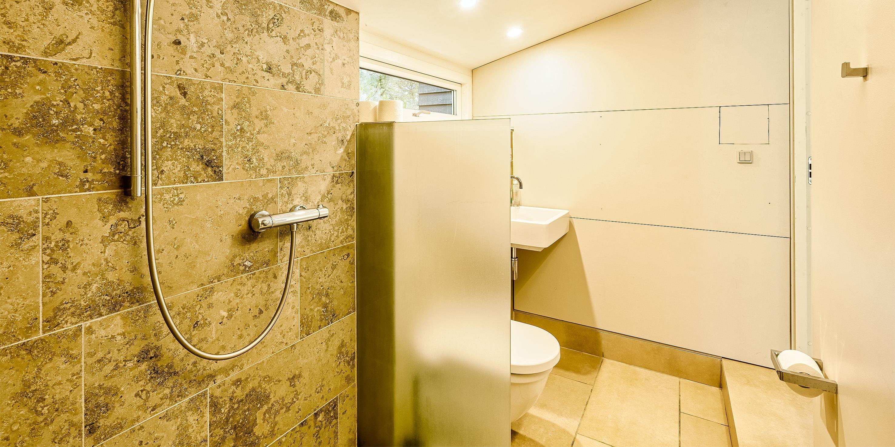 Badetempel med sauna, stor spa, bruser, toilet og brændeovn.