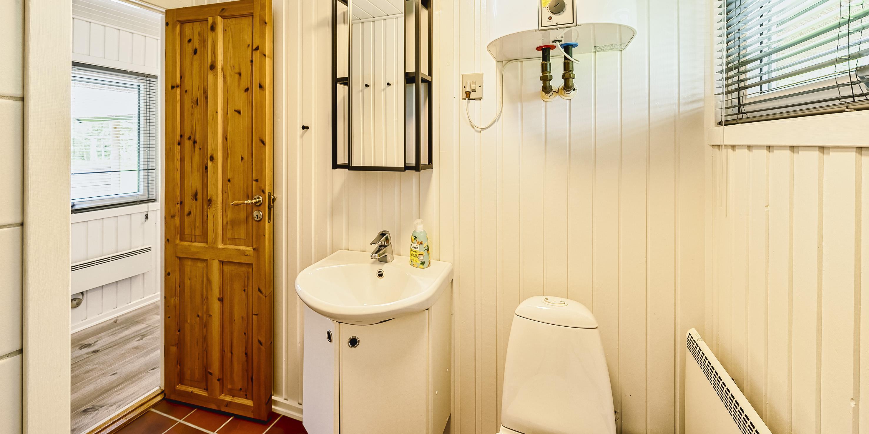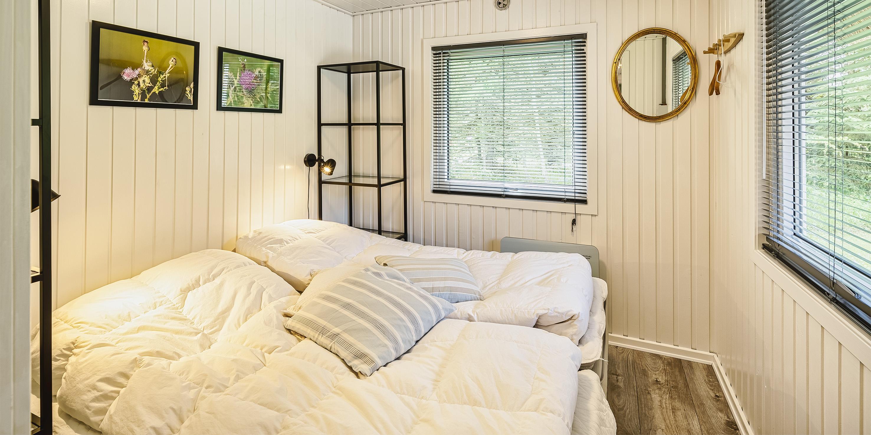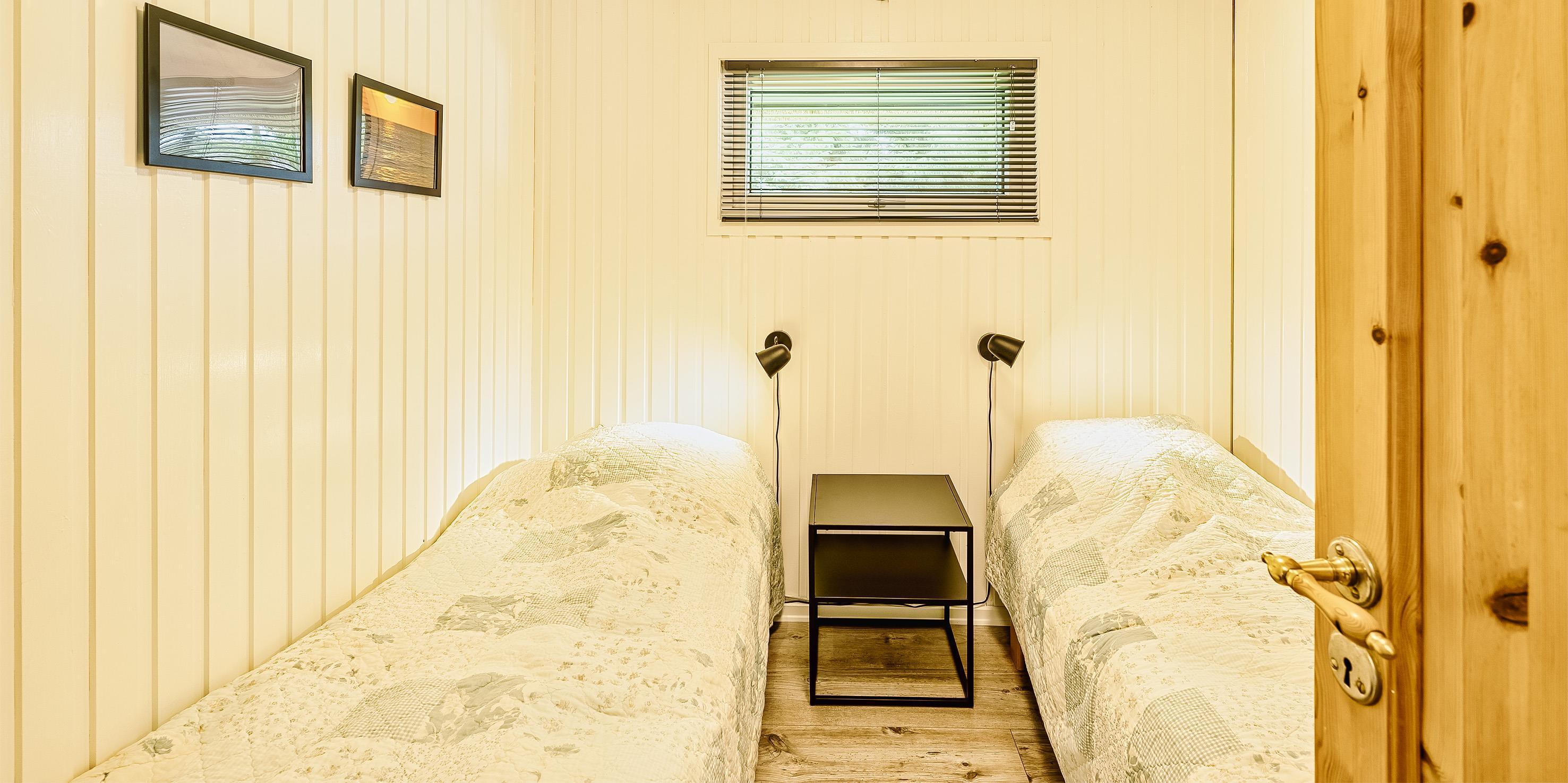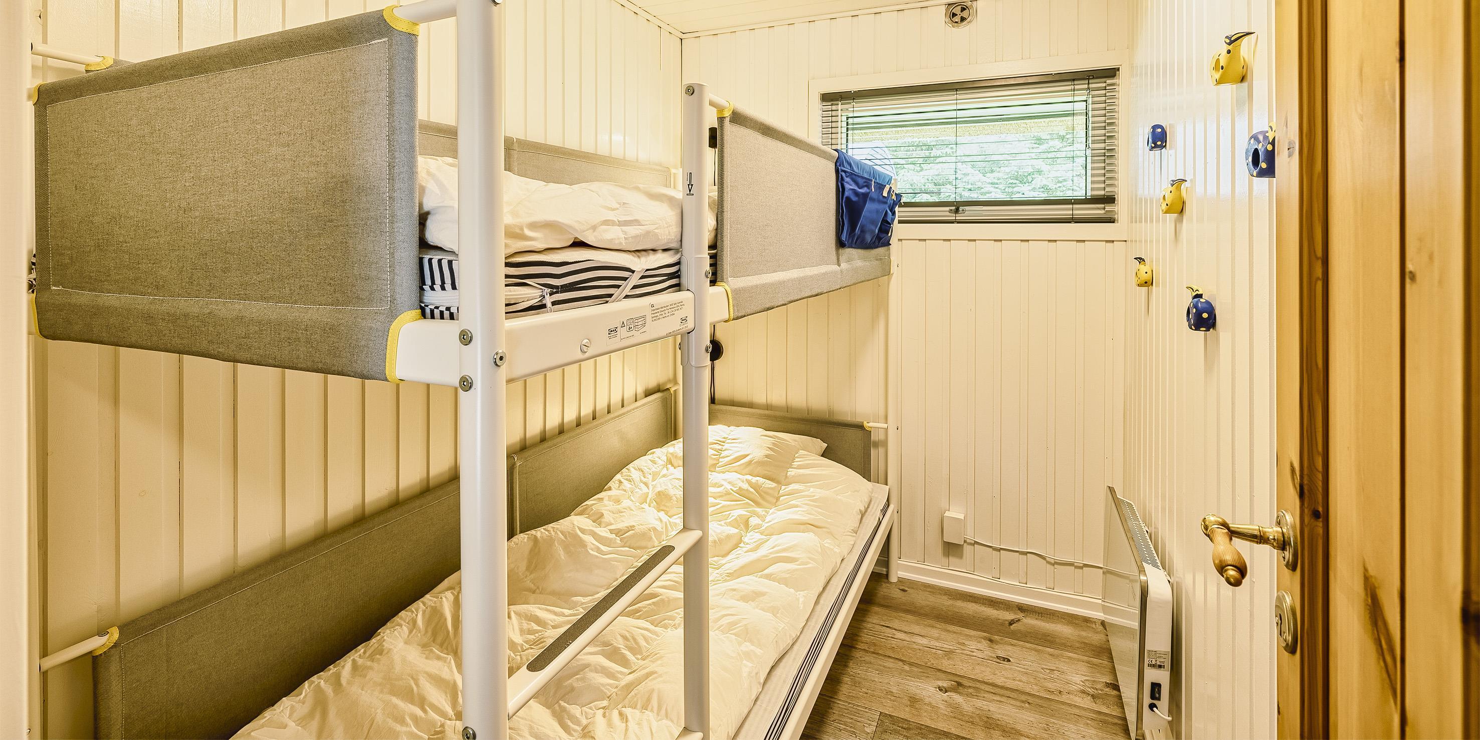 3 soveværelser. 1 med dobbeltseng 180x200 cm. 1 med 2 enkeltsenge (á 90x200 cm). 1 med 1 køjeseng.