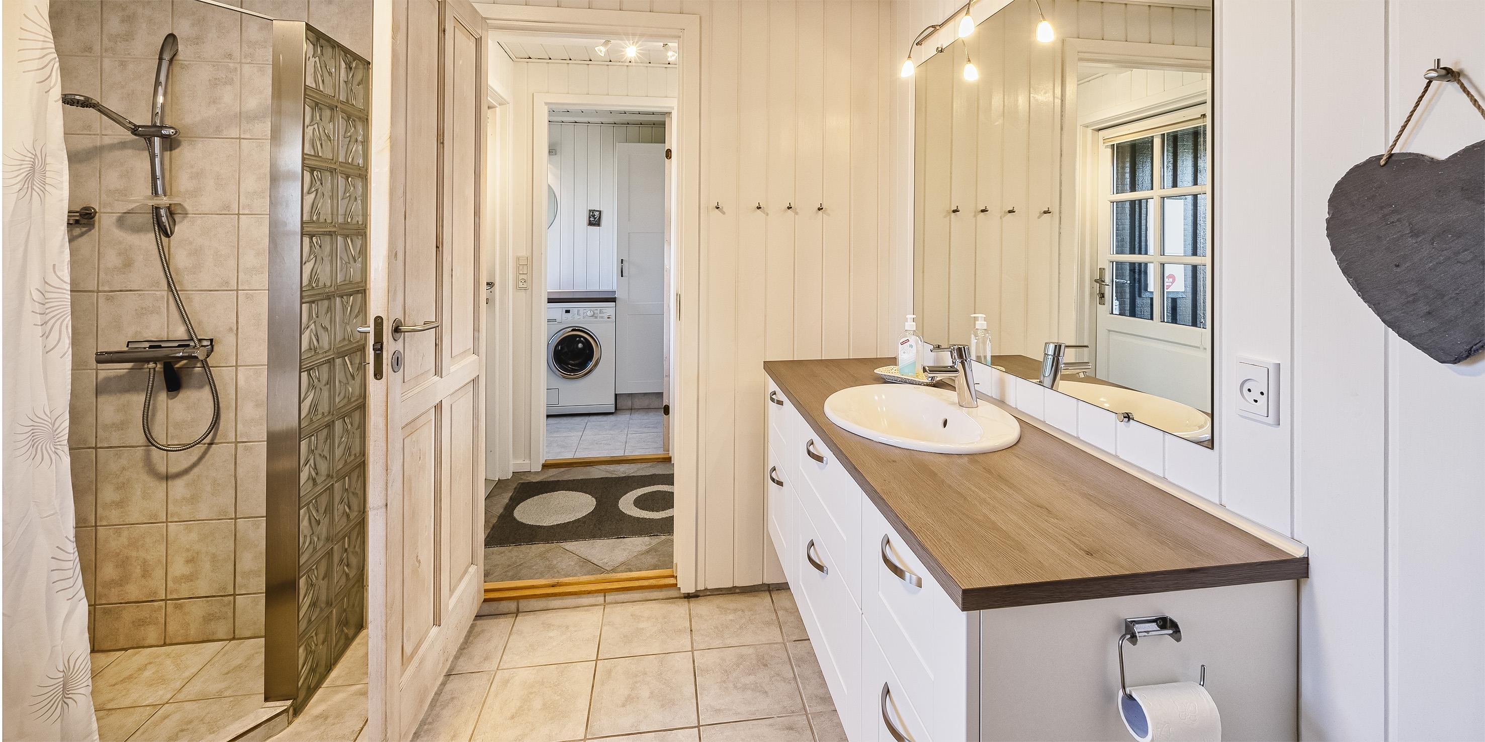 Bad med toilet, bruser og vask