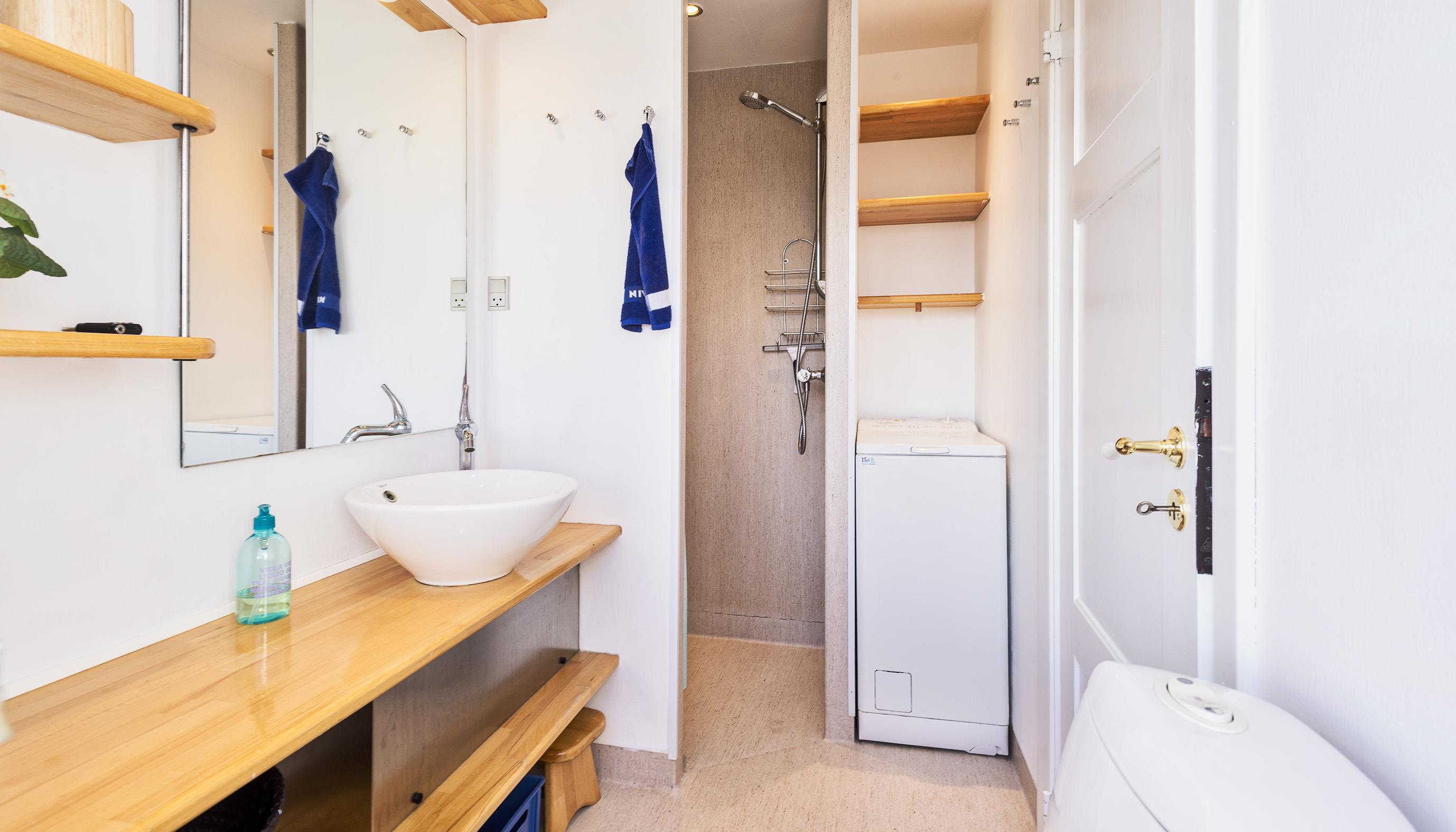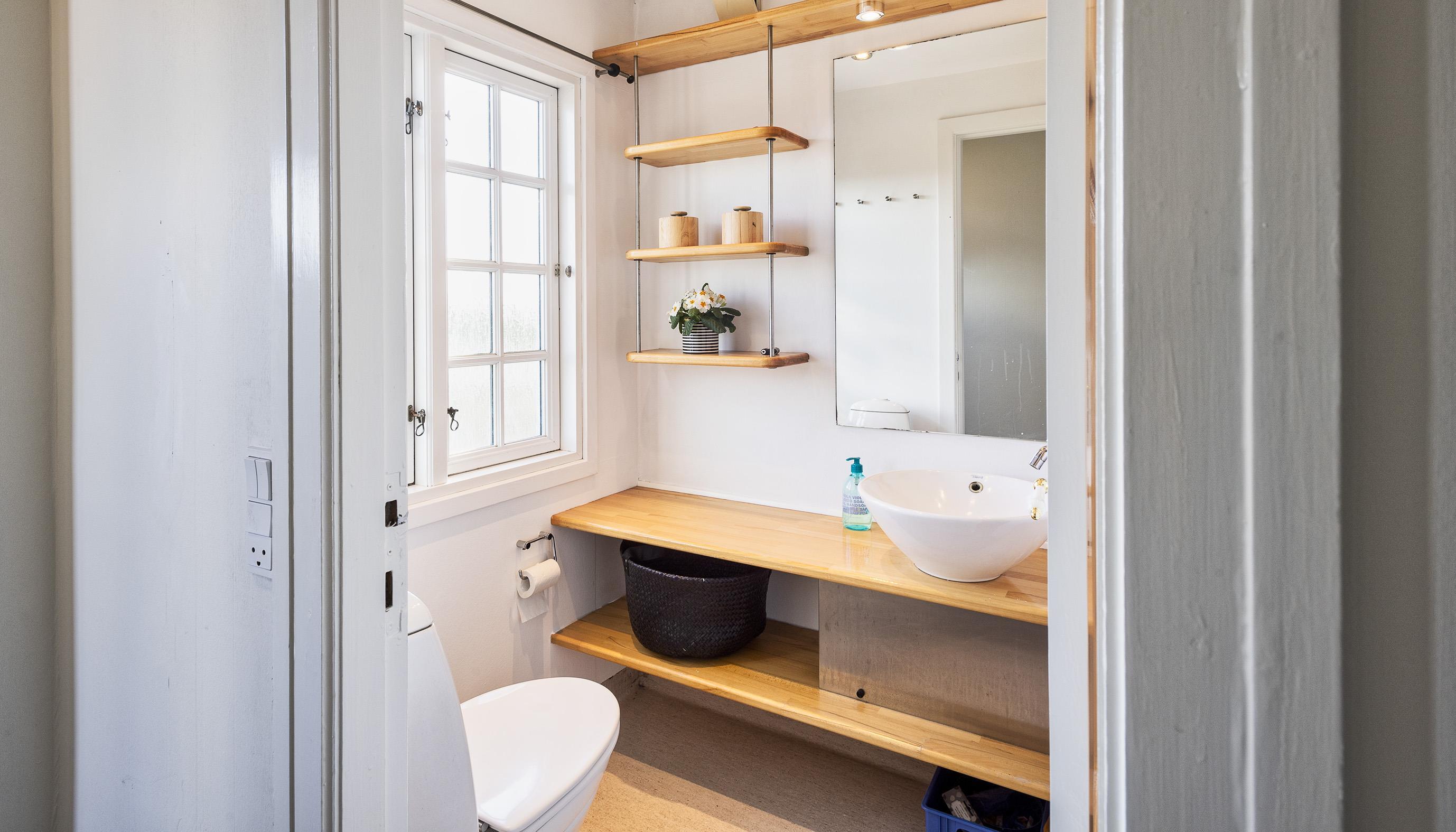 Bad med toilet, bruser og vask