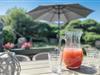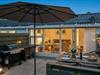 Læfuld sydvendt terrasse med havemøbler og grill.