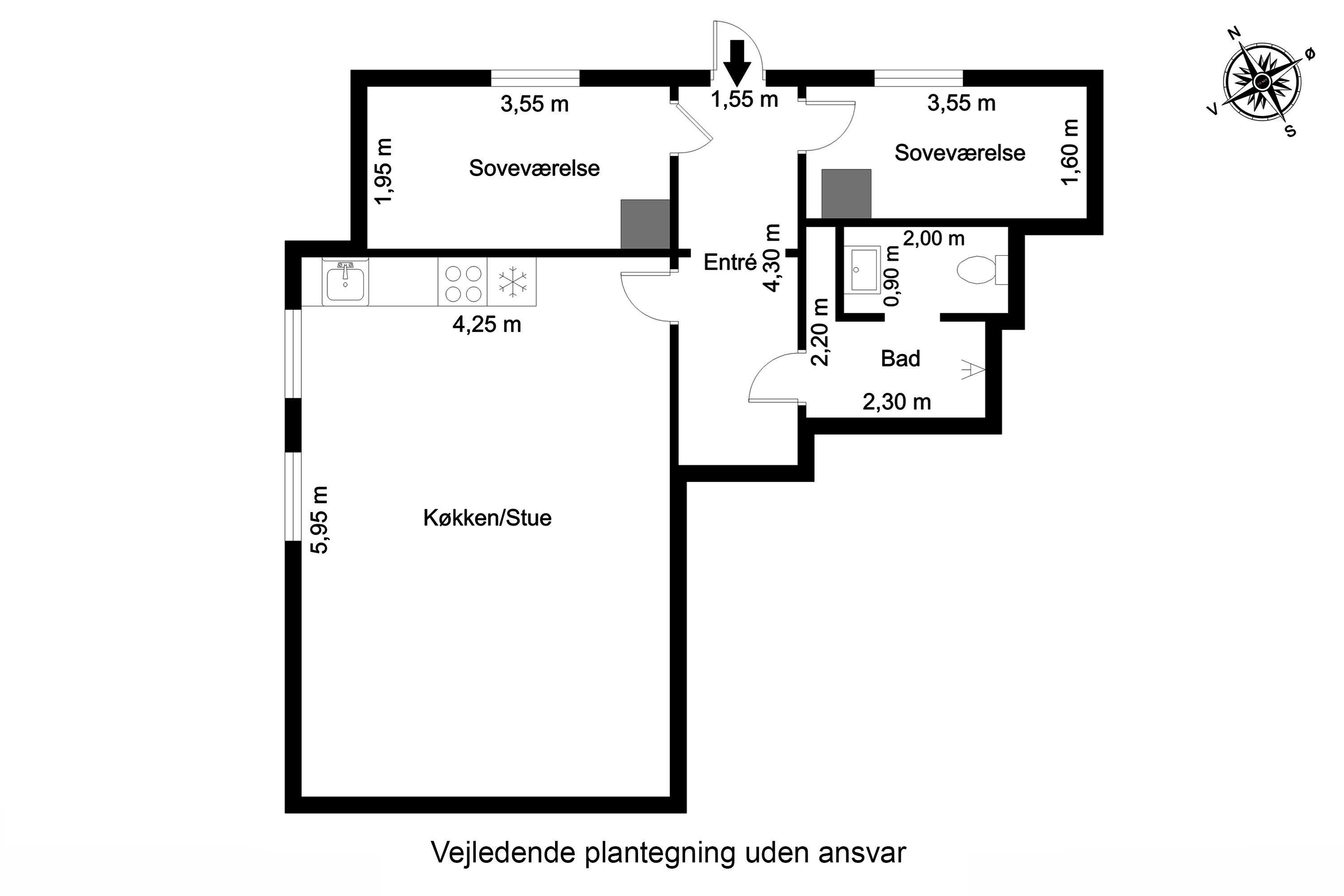 Lejligheden er indrettet med indgang/entre. Opholdsrum med køkken, spiseplads og stue samt energivenlig varmepumpe.2 Soverum, hvor der i det ene er 1 dobbeltseng og i det andet værelse er 2 enkeltsenge. Badeværelse med bruser, håndvask og toilet.