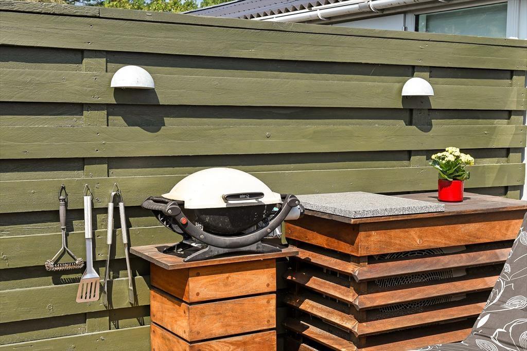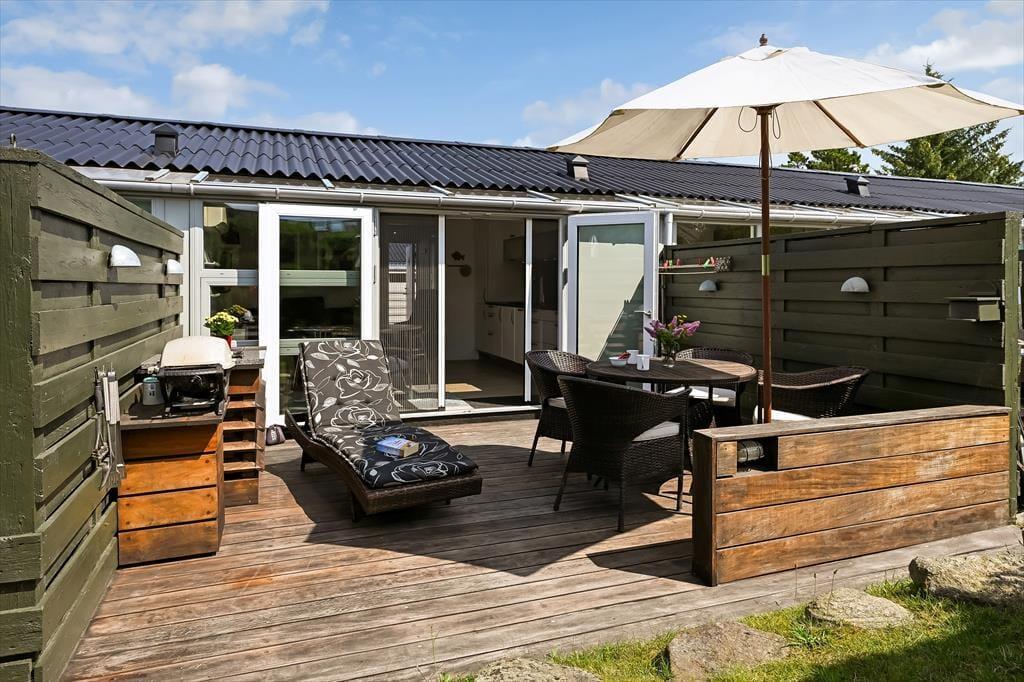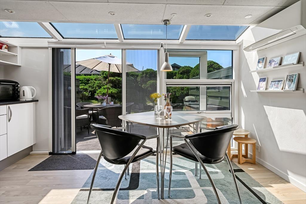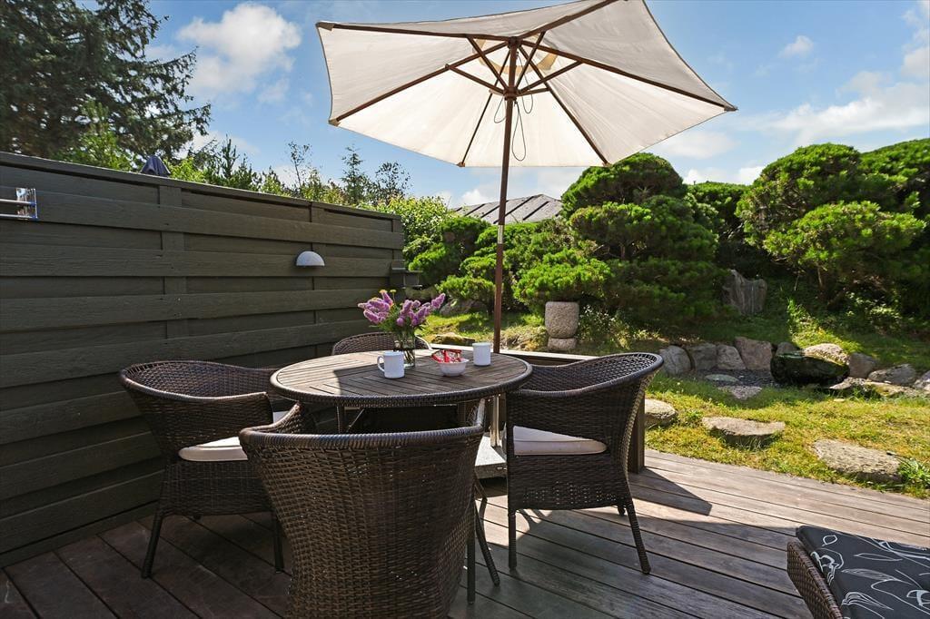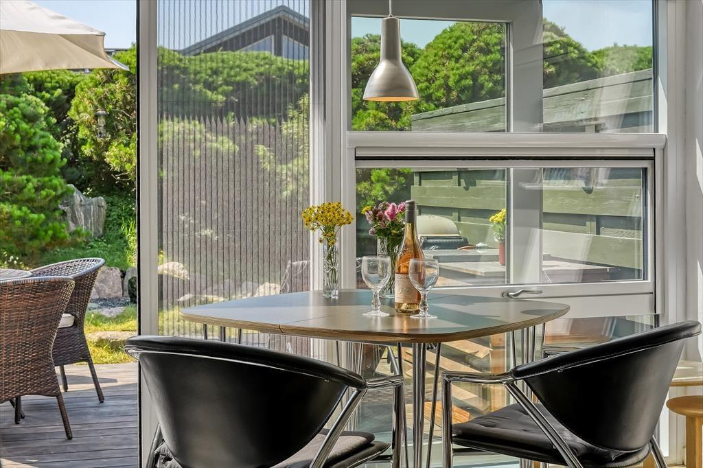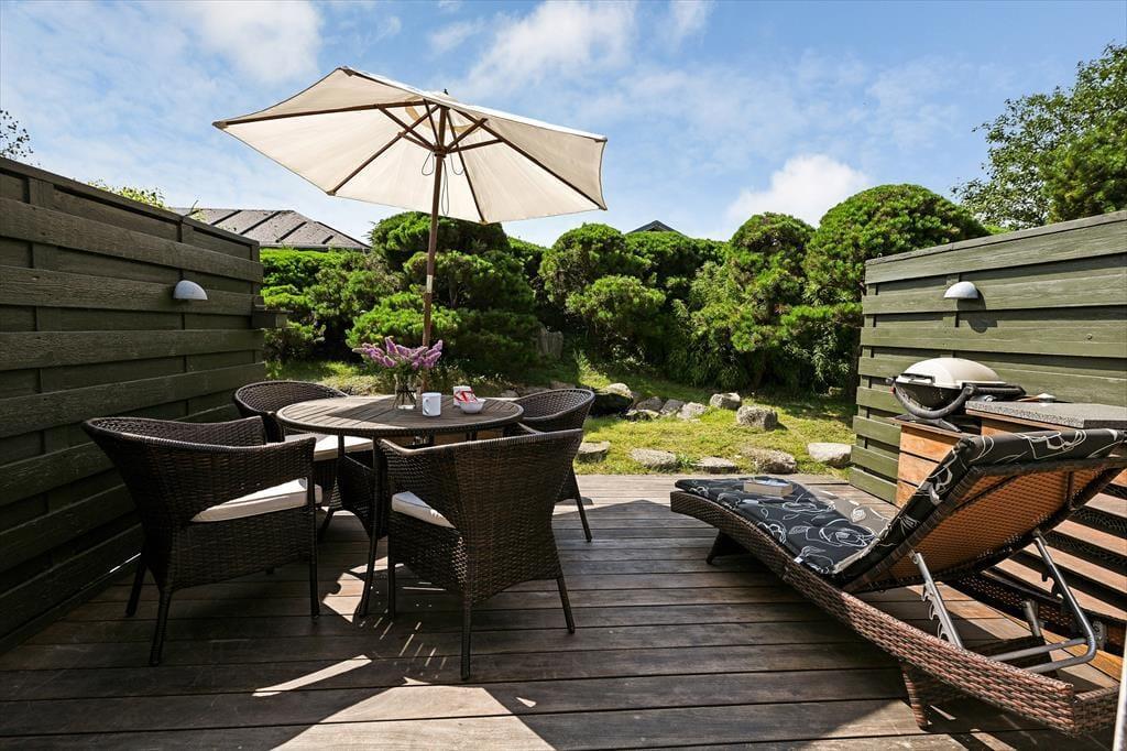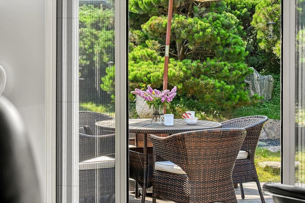 Rækkehusets sydvendte terrasse bliver hurtigt et naturligt samlingspunkt på ferien. Her kan du læne dig tilbage i havemøblerne med en god bog, mens solen varmer ansigtet, eller du kan dække op til en hyggelig frokost under åben himmel. Terrassen er et oplagt sted at starte dagen med morgenkaffen eller slutte den med et glas vin, når aftensolen falder blødt ind over området. Den lille, private uderamme skaber en følelse af fred og ro, og du kan nyde stilheden kun afbrudt af fuglenes kvidren eller bruset fra havet i baggrunden. Skulle vejret slå om, kan du trække indenfor og stadig have udsigt til terrassen gennem de store glasdøre – så naturen altid føles tæt på.