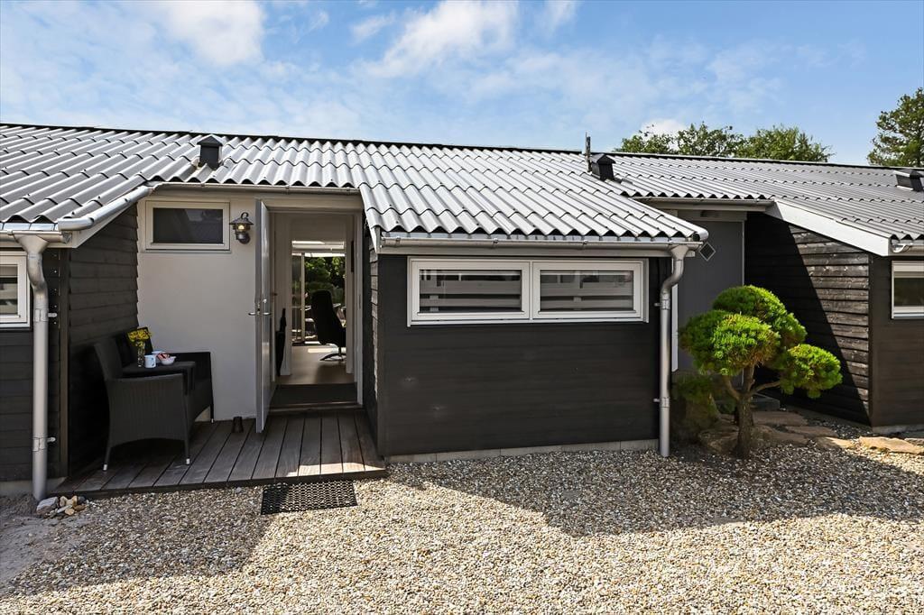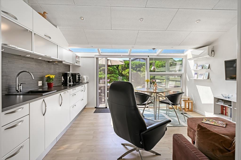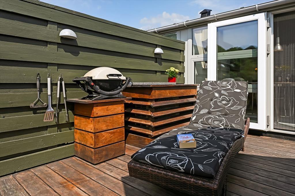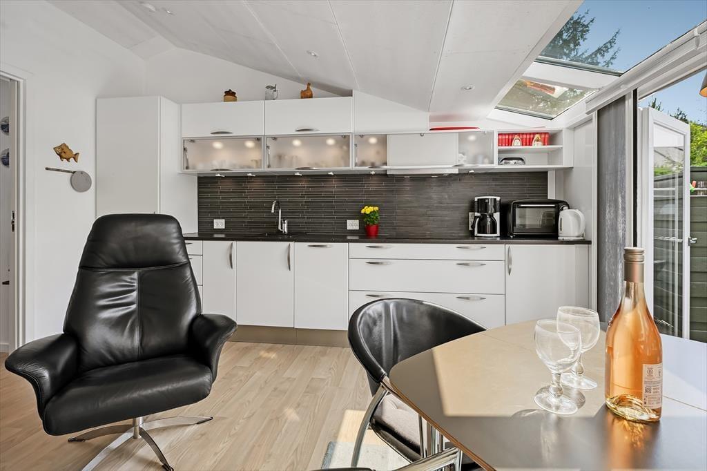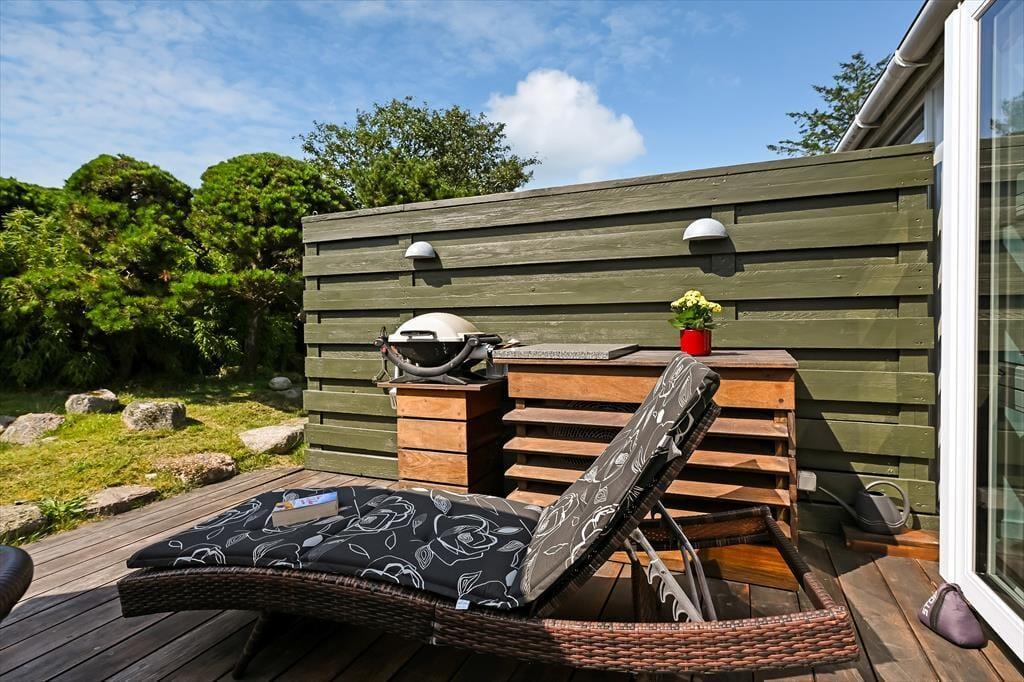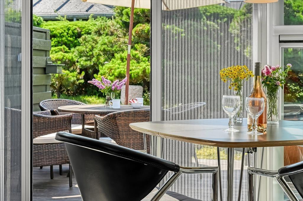 Rækkehusets sydvendte terrasse bliver hurtigt et naturligt samlingspunkt på ferien. Her kan du læne dig tilbage i havemøblerne med en god bog, mens solen varmer ansigtet, eller du kan dække op til en hyggelig frokost under åben himmel. Terrassen er et oplagt sted at starte dagen med morgenkaffen eller slutte den med et glas vin, når aftensolen falder blødt ind over området. Den lille, private uderamme skaber en følelse af fred og ro, og du kan nyde stilheden kun afbrudt af fuglenes kvidren eller bruset fra havet i baggrunden. Skulle vejret slå om, kan du trække indenfor og stadig have udsigt til terrassen gennem de store glasdøre – så naturen altid føles tæt på.
