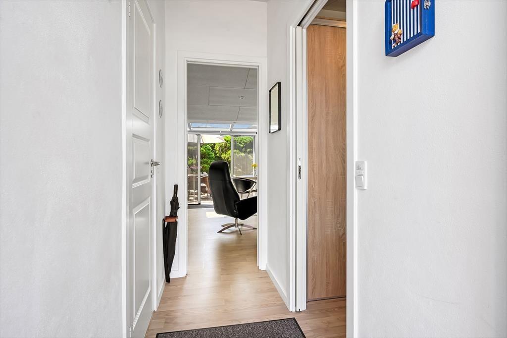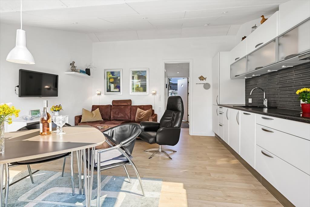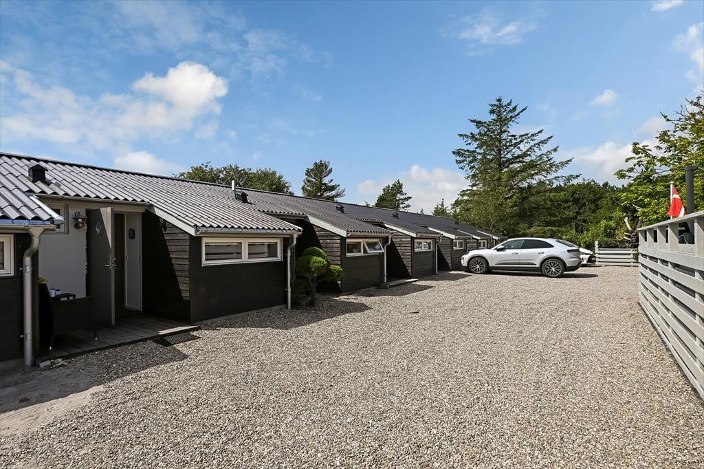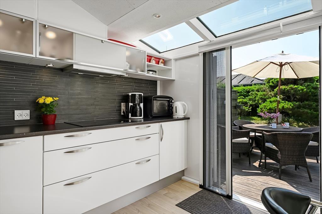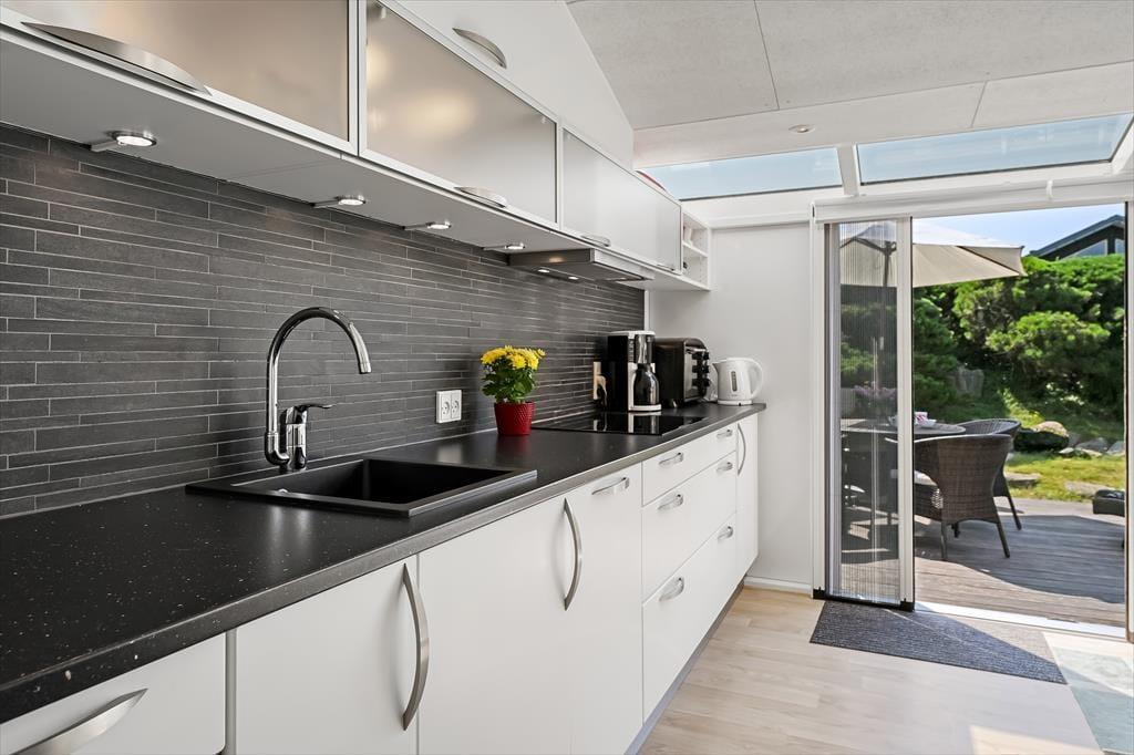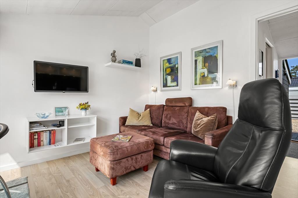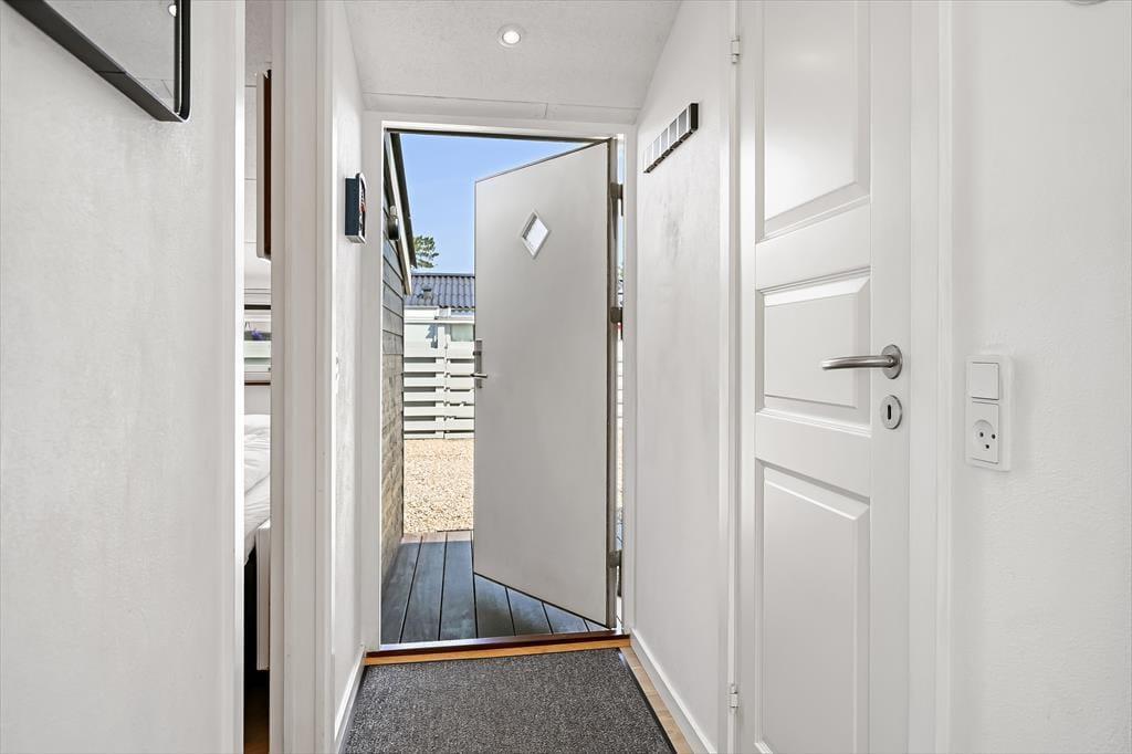 Rækkehusets sydvendte terrasse bliver hurtigt et naturligt samlingspunkt på ferien. Her kan du læne dig tilbage i havemøblerne med en god bog, mens solen varmer ansigtet, eller du kan dække op til en hyggelig frokost under åben himmel. Terrassen er et oplagt sted at starte dagen med morgenkaffen eller slutte den med et glas vin, når aftensolen falder blødt ind over området. Den lille, private uderamme skaber en følelse af fred og ro, og du kan nyde stilheden kun afbrudt af fuglenes kvidren eller bruset fra havet i baggrunden. Skulle vejret slå om, kan du trække indenfor og stadig have udsigt til terrassen gennem de store glasdøre – så naturen altid føles tæt på.