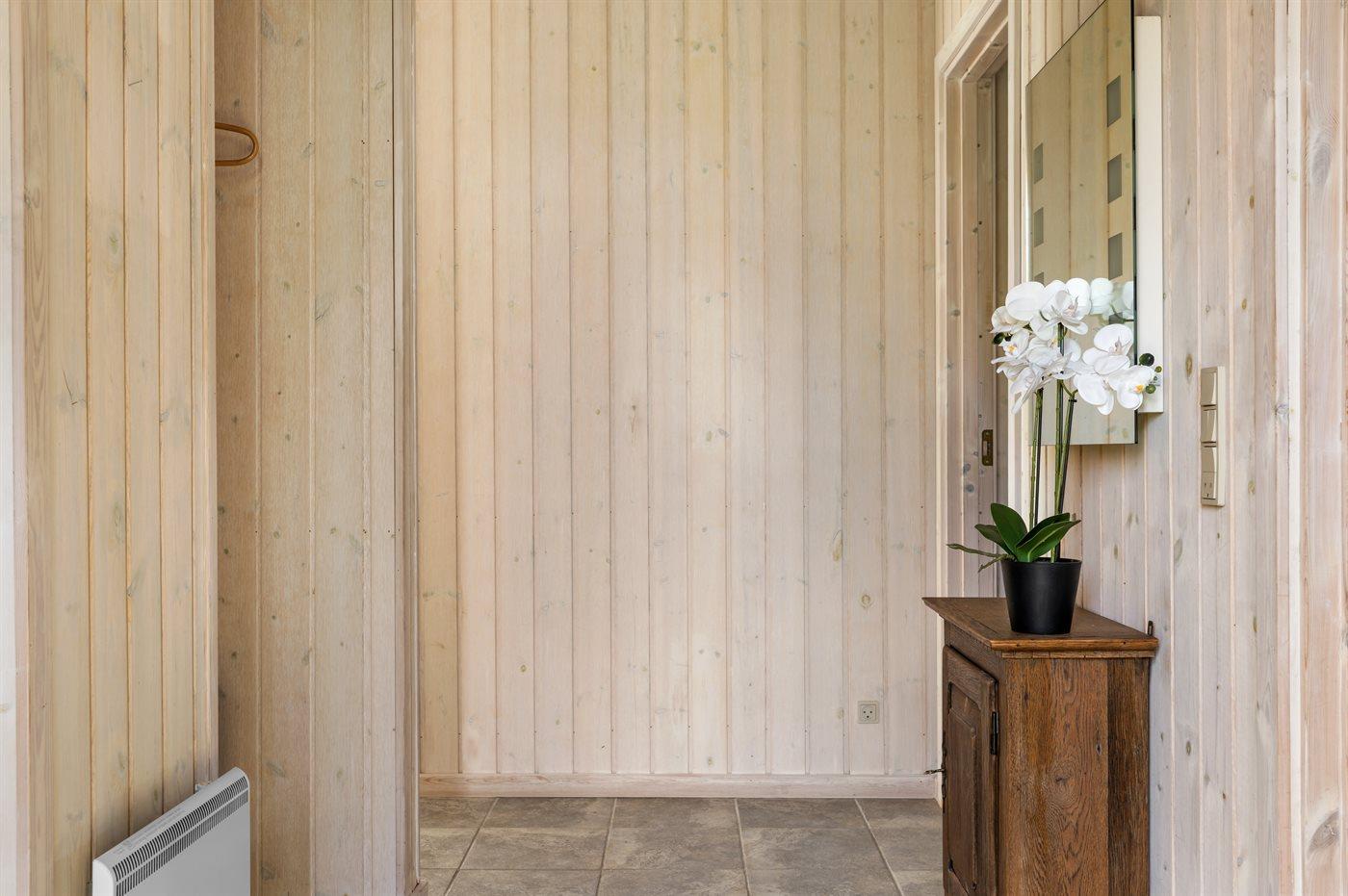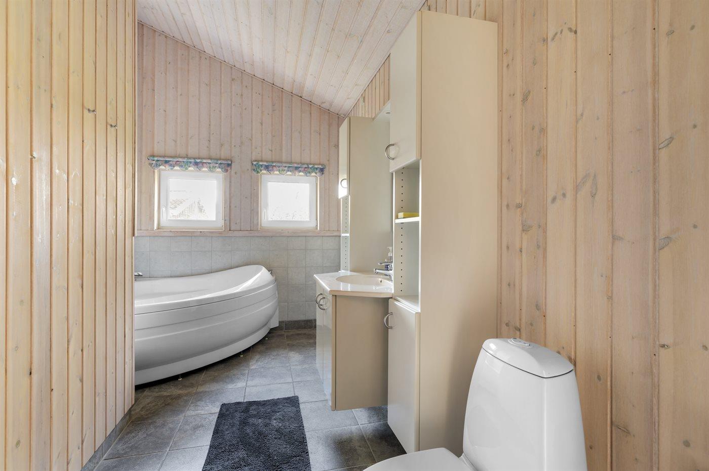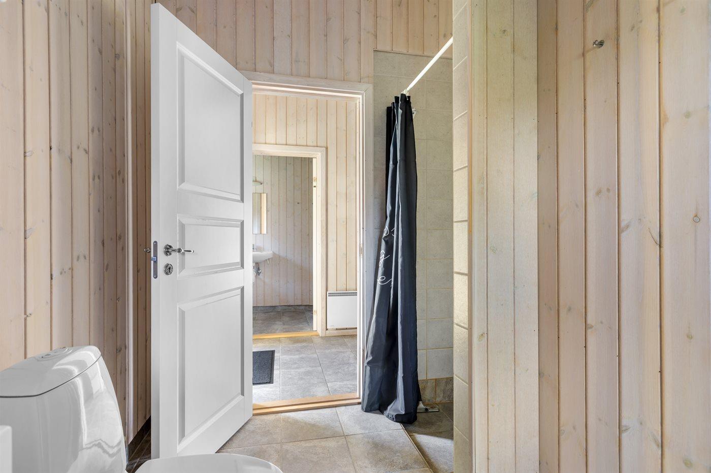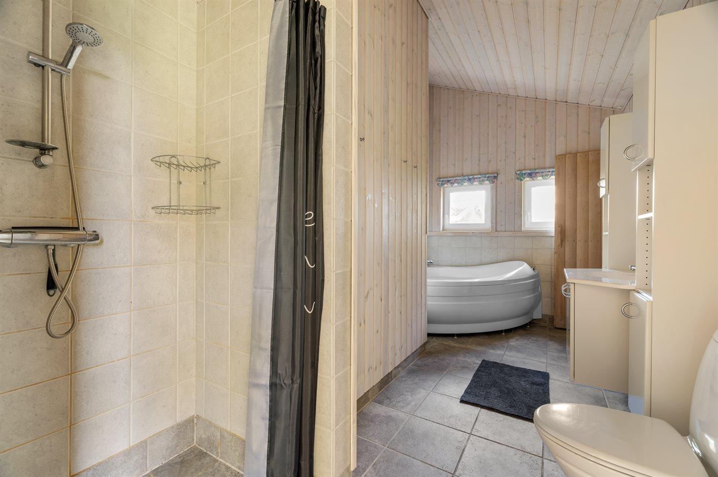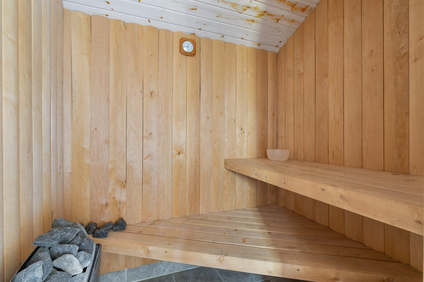 Der er 1 badeværelse med bruseniche og 2 toiletter, heraf 1 gæstetoilet. Der er gulvvarme på 1 badeværelse. Der er gulvvarme på gæstetoilettet. I saunaen er der mulighed for afslapning.
