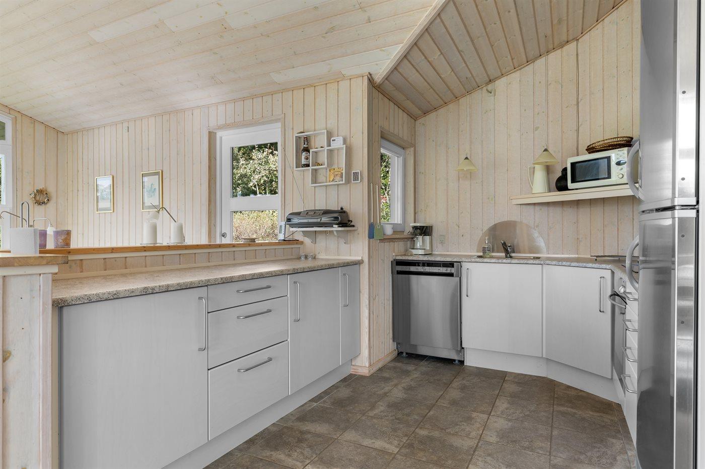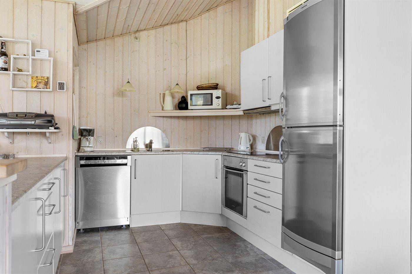 Køkkenet er udstyret med 1 køleskab. Der er 4 keramiske kogeplader, varmluftovn, mikrobølgeovn samt opvaskemaskine.