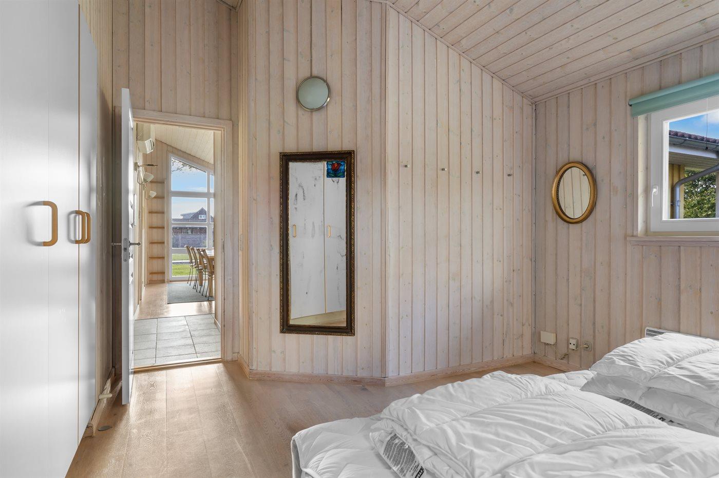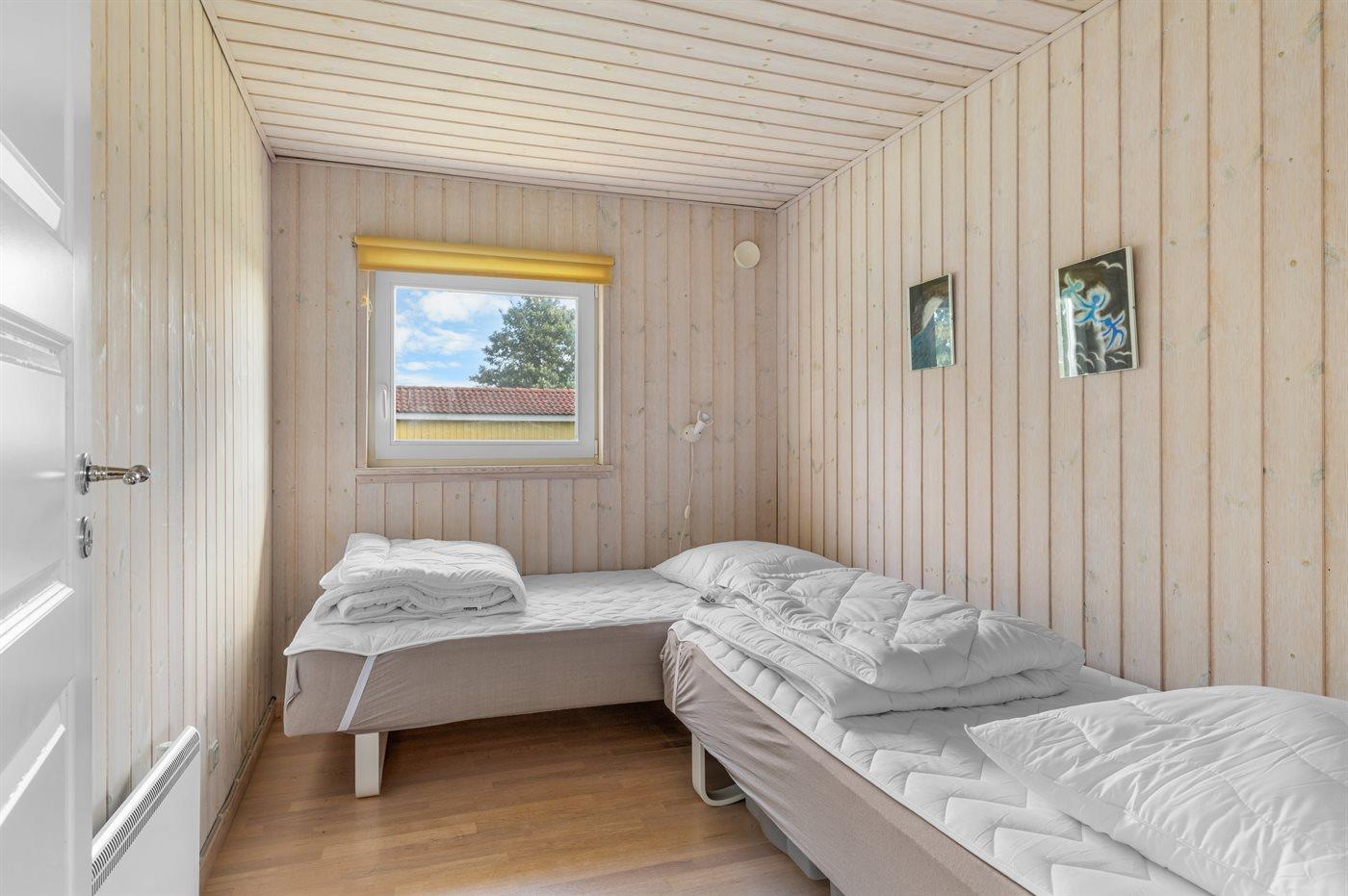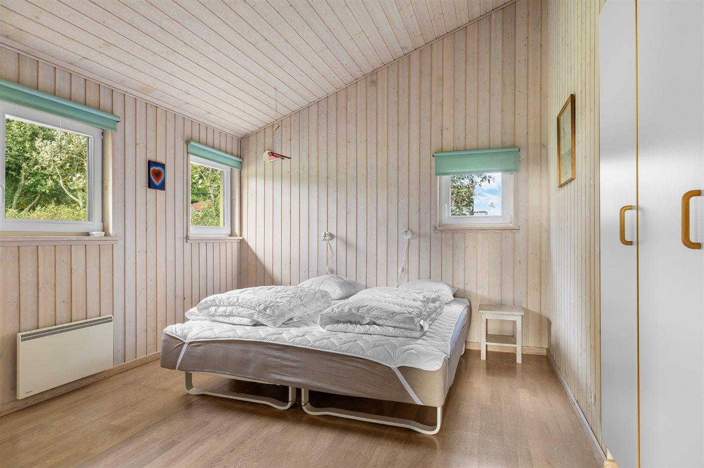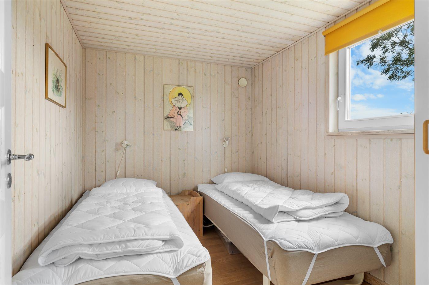 Der er i alt 3 soveværelser. Sovepladserne fordeler sig på: 2 sovepladser i dobbeltseng. 4 sovepladser i enkeltsenge. 2 sovepladser på madrasser. 2 af disse sovepladser befinder sig på husets hems. Derudover er der 1 stk. barneseng.