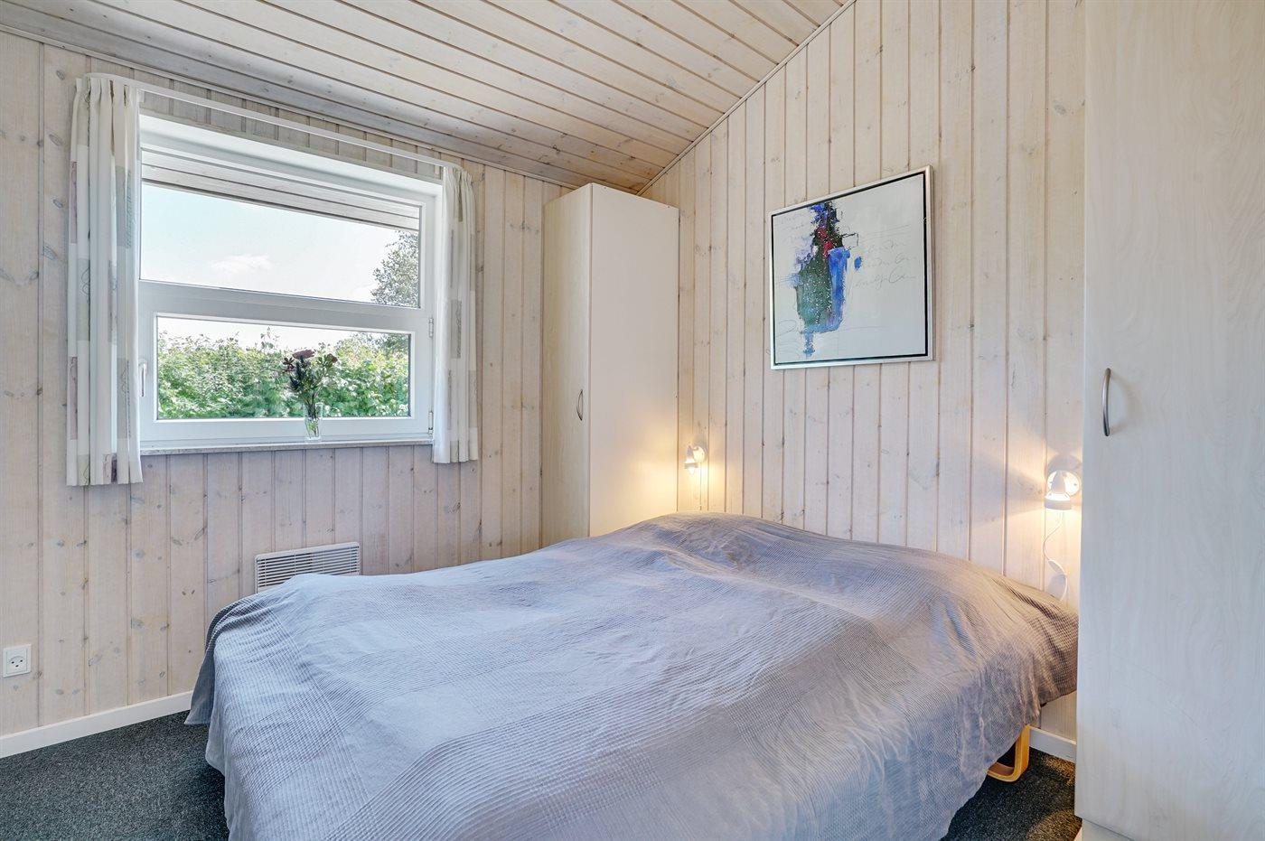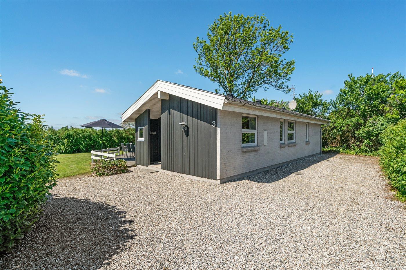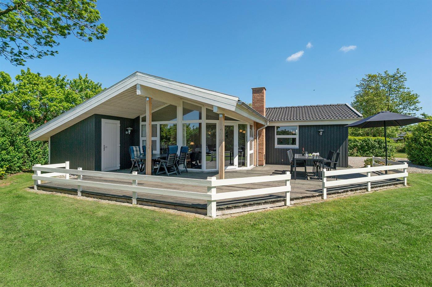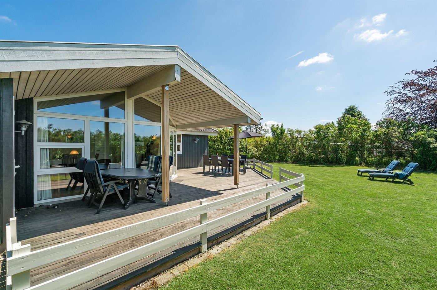 Et meget spændende og utraditionelt sommerhus i træ og sten, bygget 2004, beliggende på en ugeneret havegrund, kun 400 m fra dejlig sandstrand og rigtig godt fiskevand. Til huset hører såvel åbent som overdækket terrasseareal med havemøbler. Indvendigt er der træ og klinker på gulvene, trævægge og -lofter, som går til kip i stuen. 2 badeværelser med gulvvarme, det ene med bruseniche, vaskemaskine og tørretumbler, det andet med bruseniche, 2-pers. spa og direkte adgang til sauna. Åbent køkken/opholdsstue med pragtfuldt lysindfald. Køkkenet er bl. a. udstyret med komfur med keramiske kogeplader og varmluftovn, mikrobølgeovn og opvaskemaskine. Opholdsstuen er indrettet med brændeovn, TV, DVD-afspiller og stereoanlæg med CD-afspiller. Husets sovepladser fordeler sig på 4 værelser, 3 med dobbeltseng og 1 med køjeseng. Til de mindste feriegæster er der barneseng og høj barnestol. I et lille baghus er der kummefryser til rådighed.