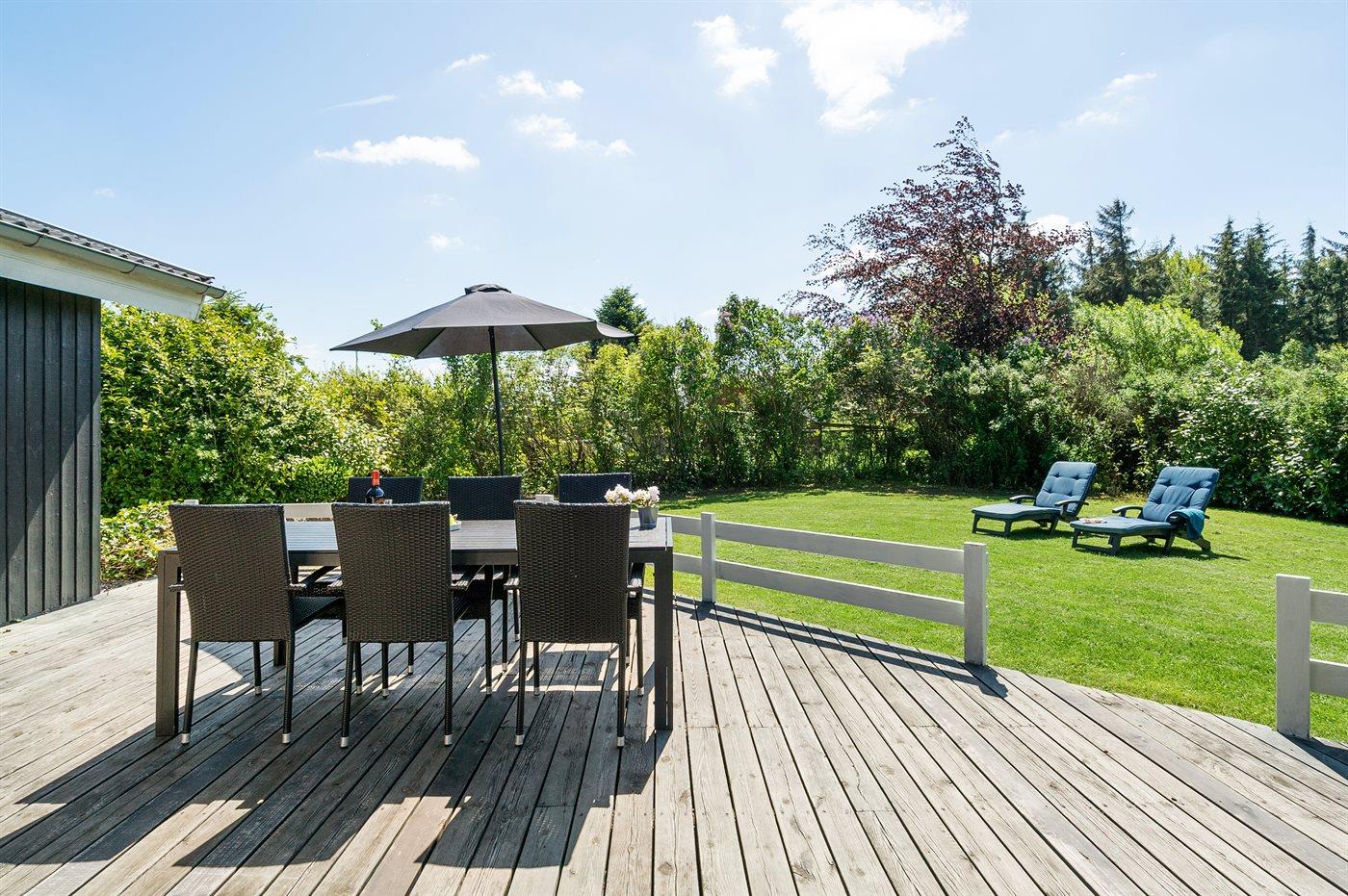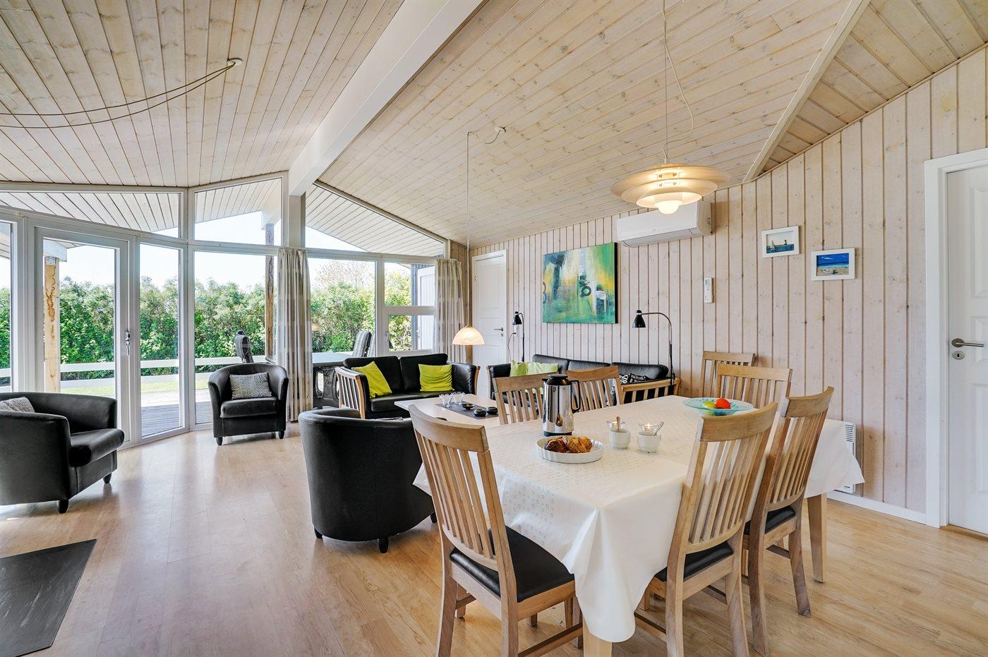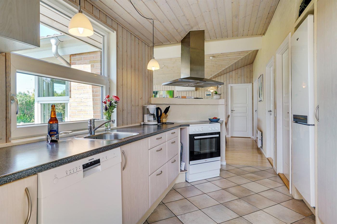 Et meget spændende og utraditionelt sommerhus i træ og sten, bygget 2004, beliggende på en ugeneret havegrund, kun 400 m fra dejlig sandstrand og rigtig godt fiskevand. Til huset hører såvel åbent som overdækket terrasseareal med havemøbler. Indvendigt er der træ og klinker på gulvene, trævægge og -lofter, som går til kip i stuen. 2 badeværelser med gulvvarme, det ene med bruseniche, vaskemaskine og tørretumbler, det andet med bruseniche, 2-pers. spa og direkte adgang til sauna. Åbent køkken/opholdsstue med pragtfuldt lysindfald. Køkkenet er bl. a. udstyret med komfur med keramiske kogeplader og varmluftovn, mikrobølgeovn og opvaskemaskine. Opholdsstuen er indrettet med brændeovn, TV, DVD-afspiller og stereoanlæg med CD-afspiller. Husets sovepladser fordeler sig på 4 værelser, 3 med dobbeltseng og 1 med køjeseng. Til de mindste feriegæster er der barneseng og høj barnestol. I et lille baghus er der kummefryser til rådighed.