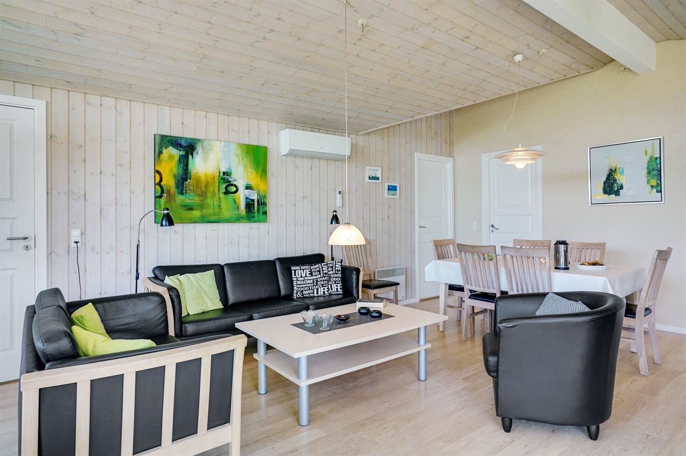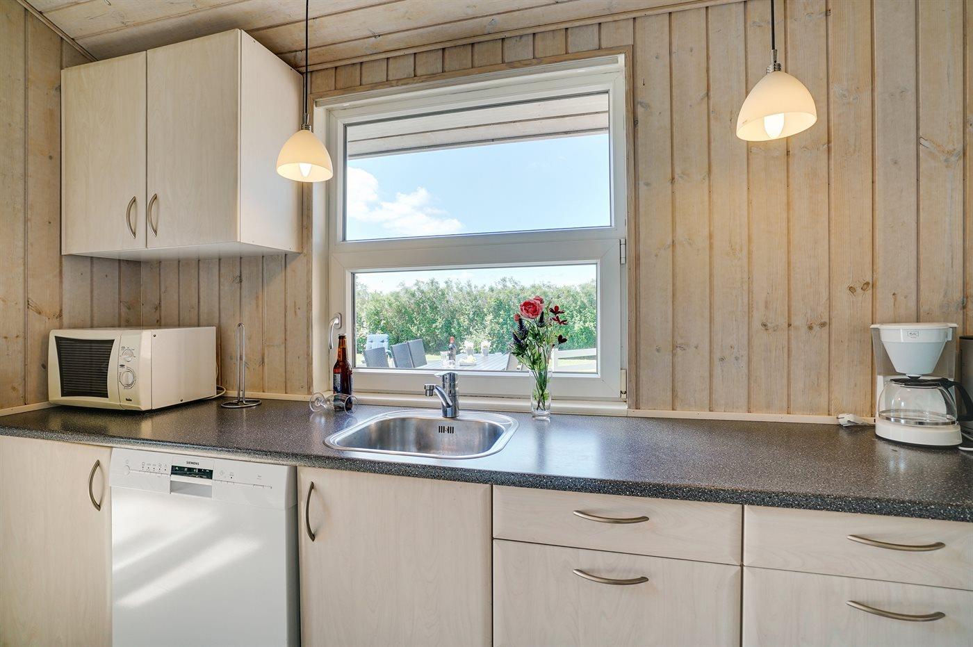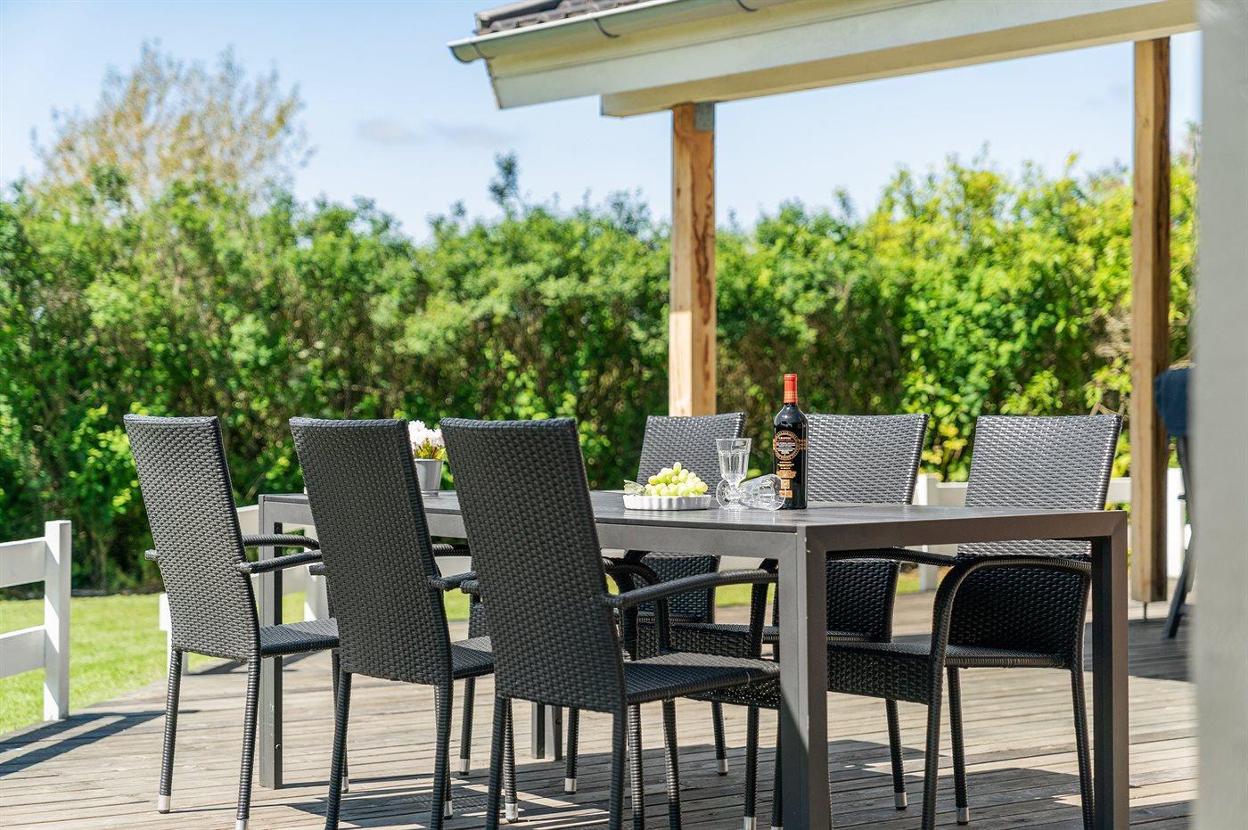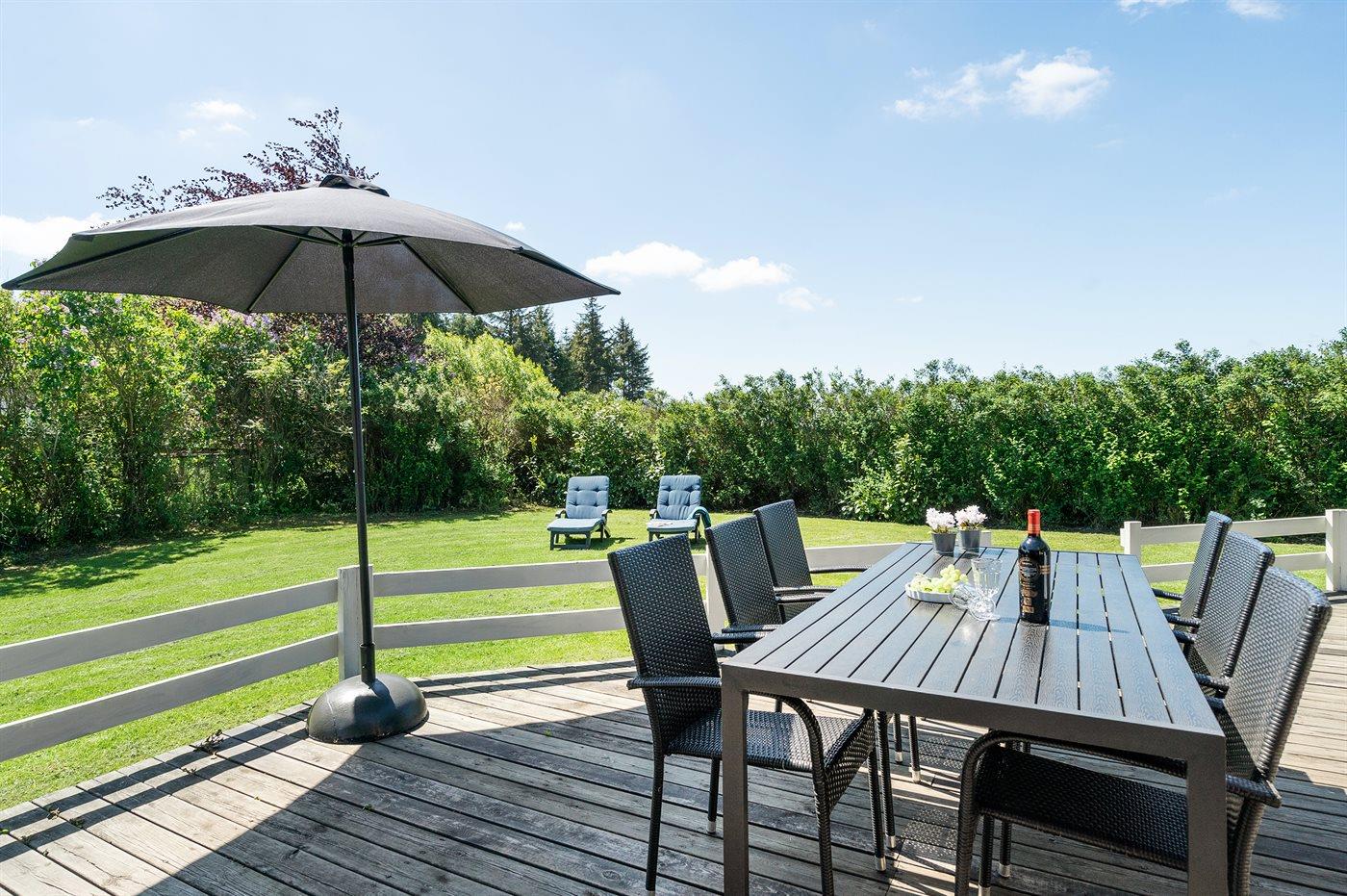 Et meget spændende og utraditionelt sommerhus i træ og sten, bygget 2004, beliggende på en ugeneret havegrund, kun 400 m fra dejlig sandstrand og rigtig godt fiskevand. Til huset hører såvel åbent som overdækket terrasseareal med havemøbler. Indvendigt er der træ og klinker på gulvene, trævægge og -lofter, som går til kip i stuen. 2 badeværelser med gulvvarme, det ene med bruseniche, vaskemaskine og tørretumbler, det andet med bruseniche, 2-pers. spa og direkte adgang til sauna. Åbent køkken/opholdsstue med pragtfuldt lysindfald. Køkkenet er bl. a. udstyret med komfur med keramiske kogeplader og varmluftovn, mikrobølgeovn og opvaskemaskine. Opholdsstuen er indrettet med brændeovn, TV, DVD-afspiller og stereoanlæg med CD-afspiller. Husets sovepladser fordeler sig på 4 værelser, 3 med dobbeltseng og 1 med køjeseng. Til de mindste feriegæster er der barneseng og høj barnestol. I et lille baghus er der kummefryser til rådighed.