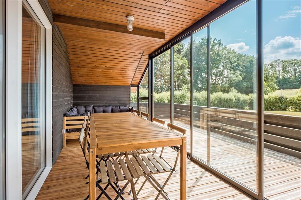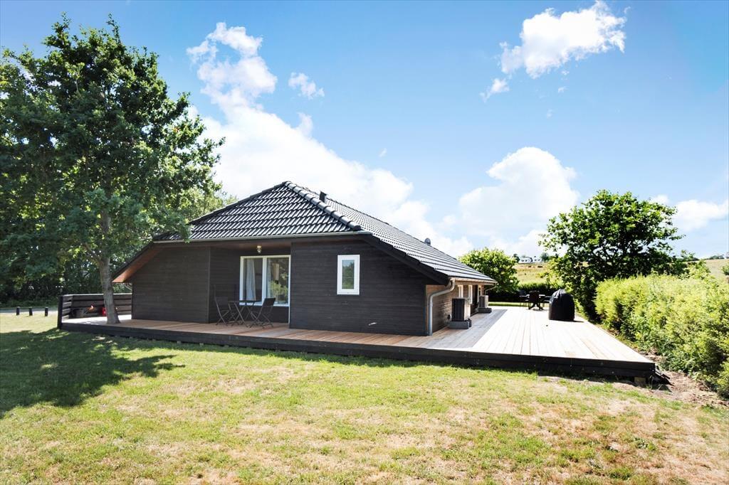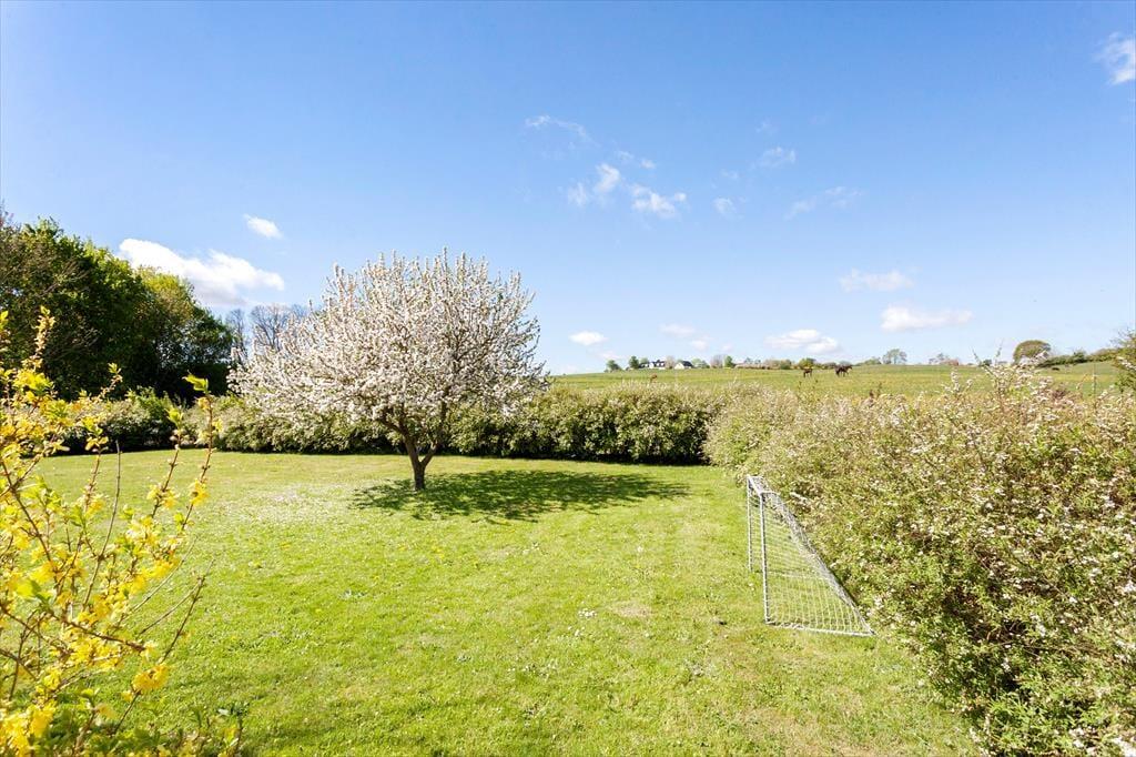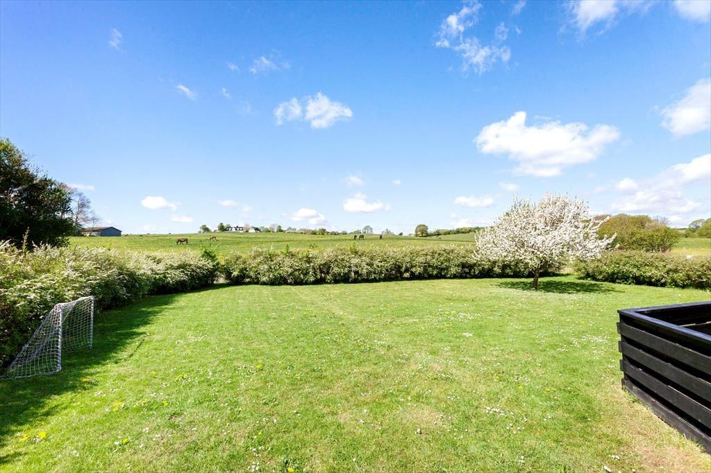 Udendørs kan du glæde dig over en stor terrasse på 130 m², som omkranser huset og tilbyder flere skønne opholdssteder med havemøbler og grill. Her kan du starte dagen med en kop kaffe, mens du nyder udsigten over de omkringliggende marker og enge, eller afslutte aftenen med en grillaften i solnedgangen. Terrassen er det ideelle sted at samles og nyde ferielivet under åben himmel, og den rummelige have giver også mulighed for leg og afslapning for både store og små.