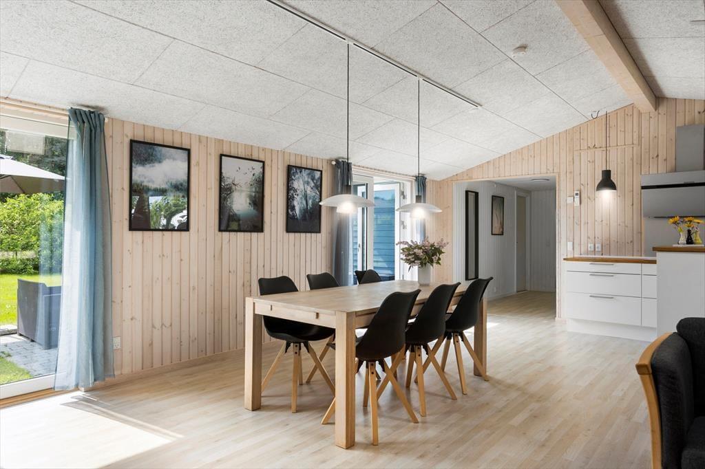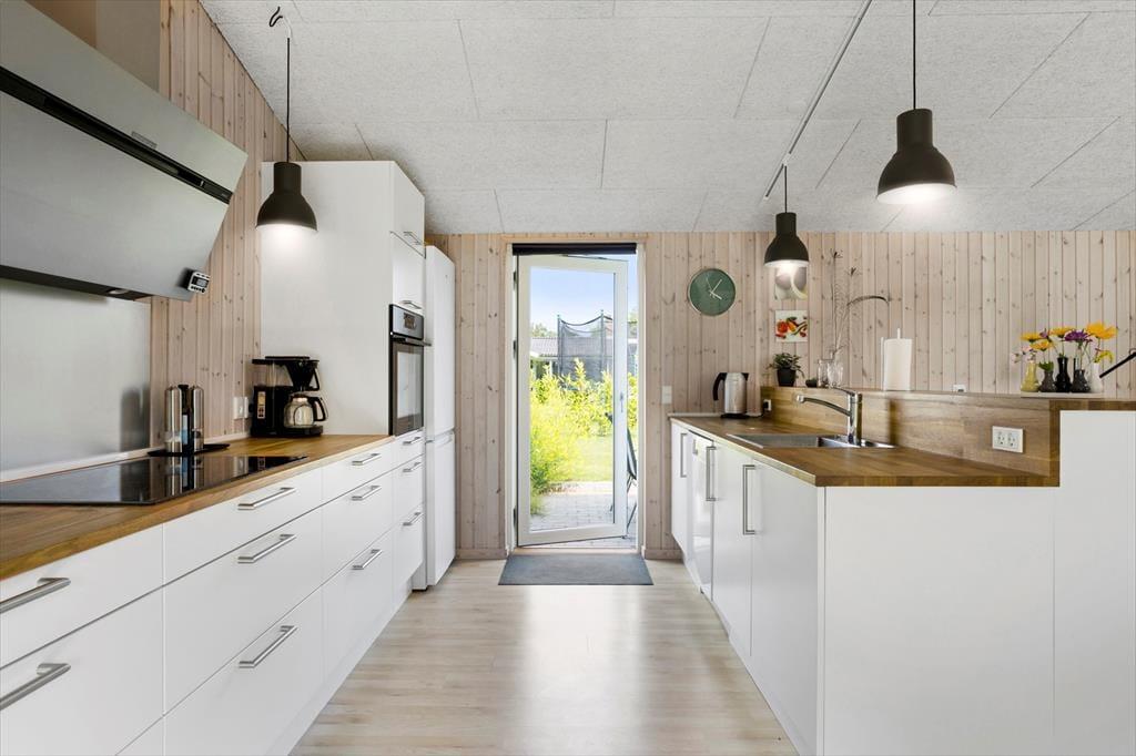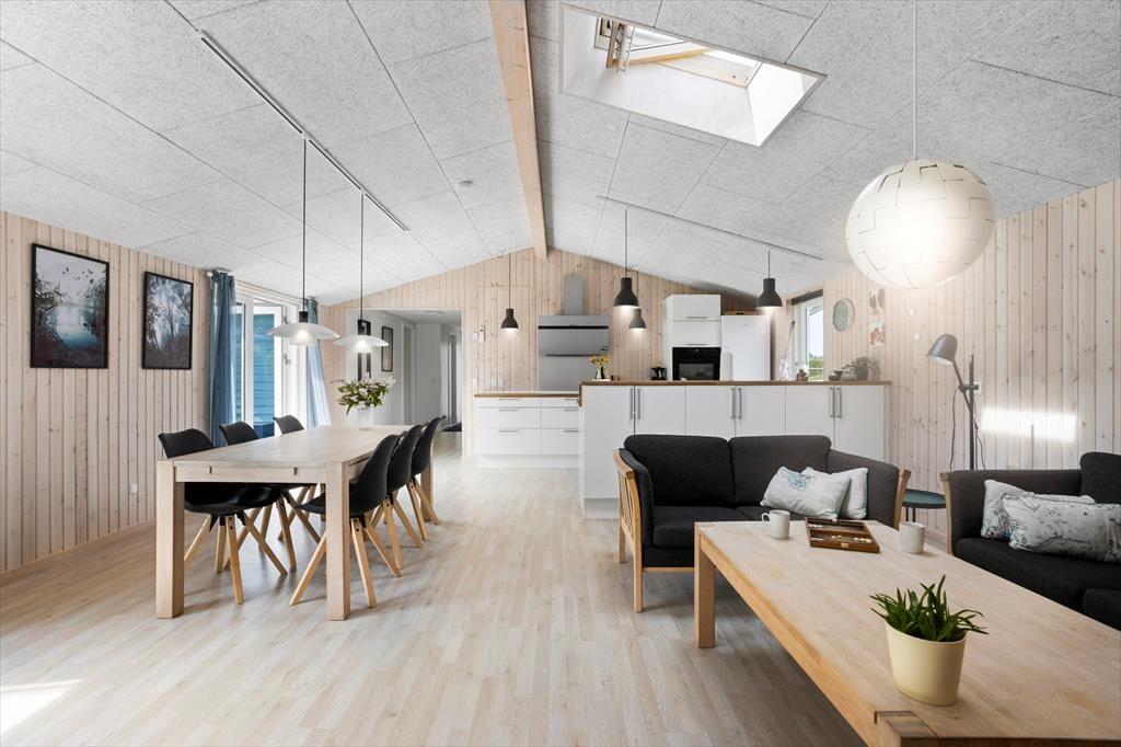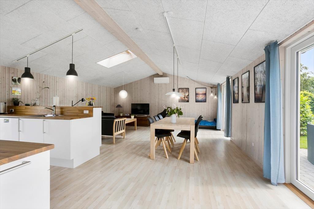 Når du træder indenfor i dette skønne sommerhus, mødes du af et stort og lyst køkkenalrum, der straks inviterer til hyggelige stunder med madlavning og samvær. Køkkenet er moderne og veludstyret, og der er god plads til at tilberede dagens måltider, som I kan nyde ved spisebordet i alrummet. Et ovenlysvindue kaster et dejligt lys ind i rummet, og den rummelige stue indbyder til afslapning foran tv’et eller hyggelige samtaler med en kop kaffe. På de køligere dage kan varmepumpen sørge for, at I stadig kan nyde komforten i sommerhuset.