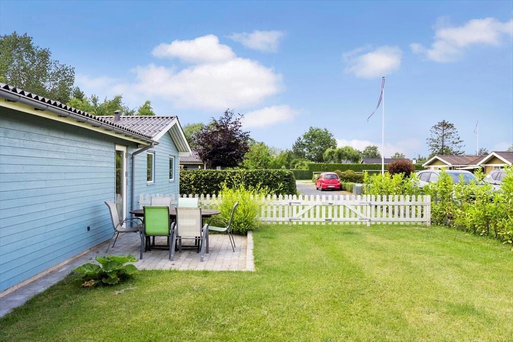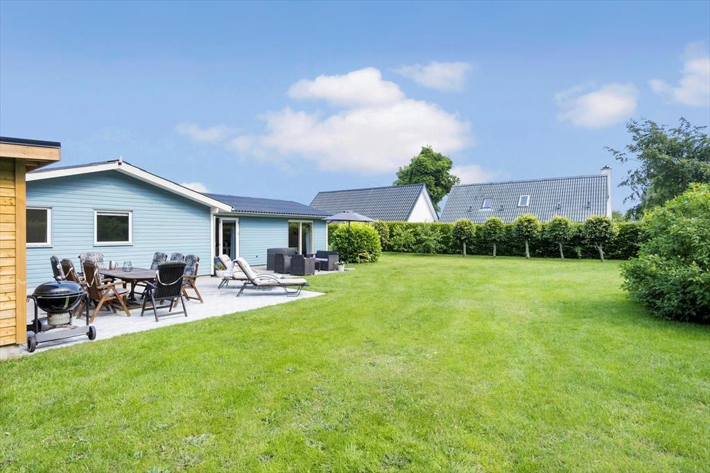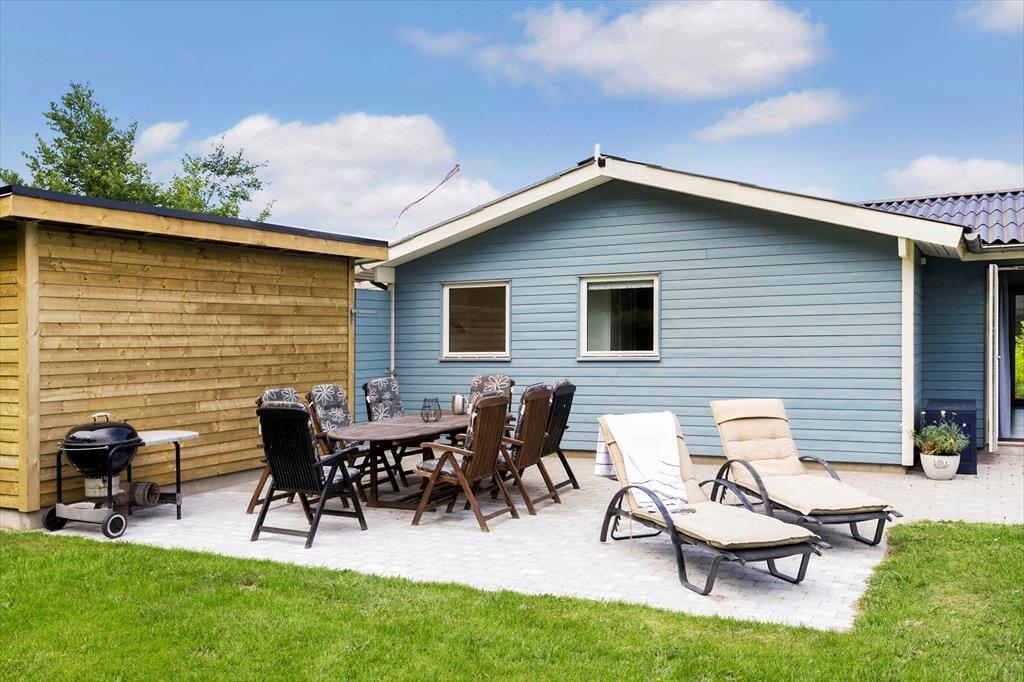 Sommerhusets udendørsarealer er lige så indbydende som indendørs. Fra køkkenet og stuen har du direkte adgang til en fliseterrasse, hvor du kan tænde op i grillen og nyde maden under åben himmel. Terrassen er rummelig og perfekt til lange, afslappede feriemiddage eller bare en stille stund med en god bog. Haven er stor og grøn, med en velplejet græsplæne, hvor børnene kan lege frit, og de mindste kan glæde sig over både gyngestativ og sandkasse. Her er der masser af plads til at nyde de solrige dage og skabe gode ferieminder med familie og venner.