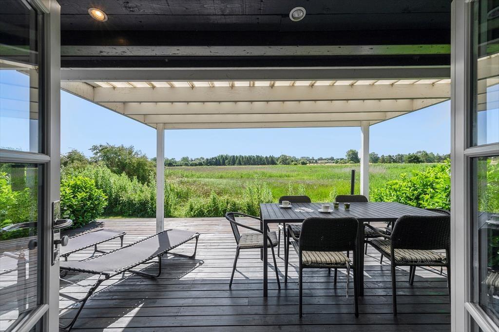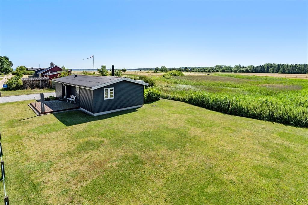 Udenfor venter der masser af plads til at nyde det gode vejr. Sommerhuset er udstyret med to træterrasser – én på hver side af huset, så du altid kan finde en solrig eller skyggefuld plads at sidde. På den ene terrasse er der endda en teltpavillon, hvor du kan søge ly, hvis vejret viser sig fra sin lunefulde side. Den store græsplæne på den ene side af huset indbyder til boldspil og leg, mens du ved baghaven kan nyde synet af den naturskønne grund, der strækker sig helt ned til Avlby Mølleå. Her er det nemt at finde ro, når du blandt andet lytter til fuglenes kvidren.