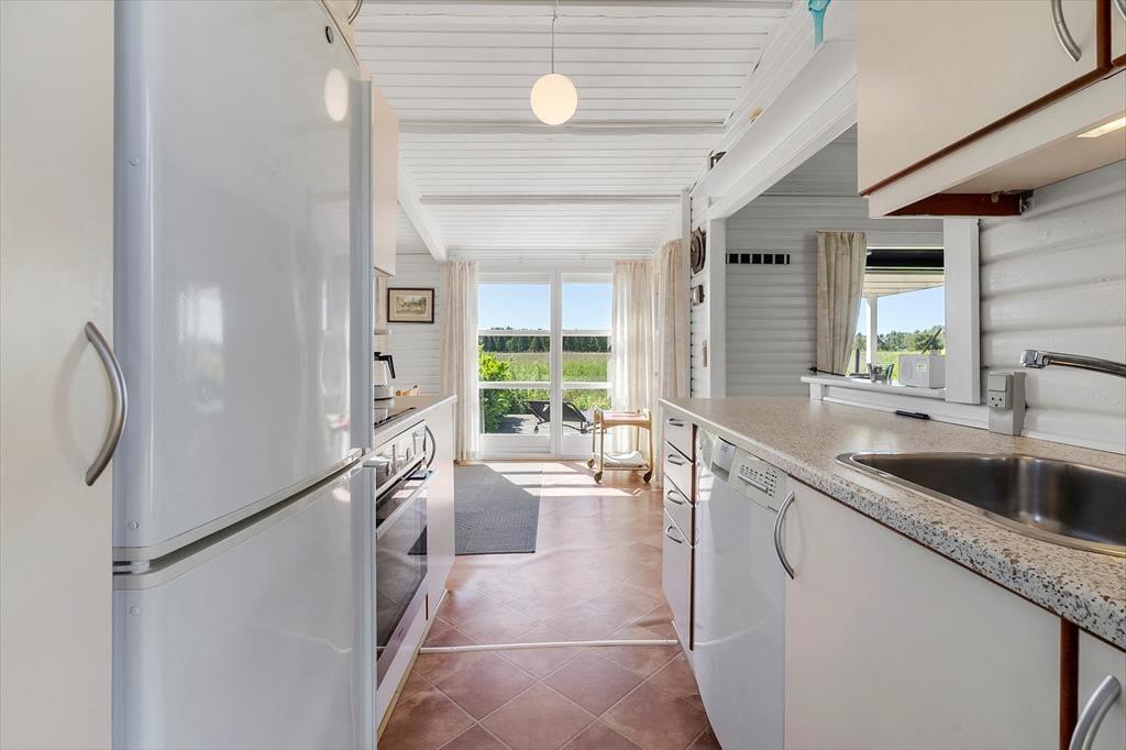 Når du træder ind i det renoverede sommerhus, bliver du straks mødt af en indbydende atmosfære. Stuen er husets hjerte med brændeovn og en hyggelig spiseplads, hvor familien kan samles om brætspil eller en lækker middag. Her er der plads til afslapning foran ilden, når aftenen falder på, og man mærker, hvordan feriestemningen hurtigt indfinder sig. Huset har et godt køkken, der er perfekt til at tilberede dagens måltider, mens vinduet lader lyset strømme ind og giver udsigt til de omkringliggende marker. De to soveværelser sikrer en god nats søvn, så du er frisk til næste dags eventyr.