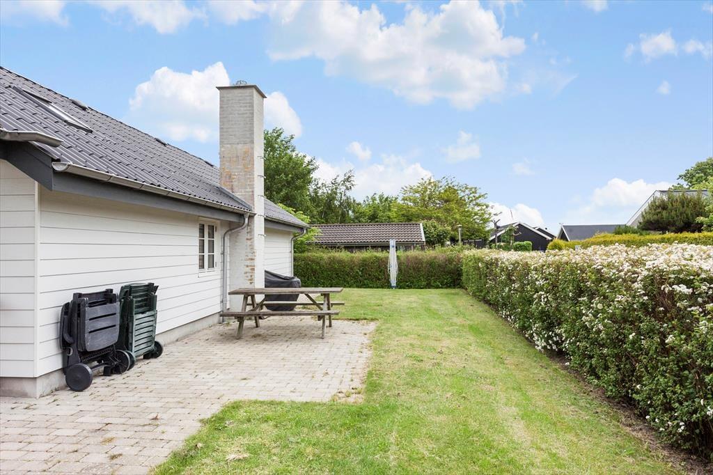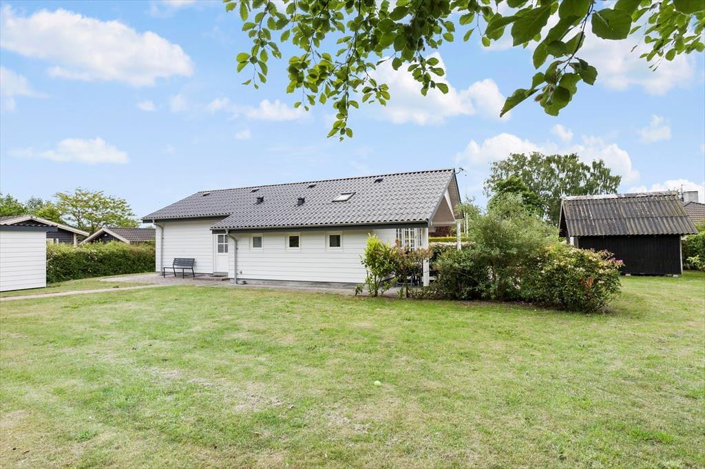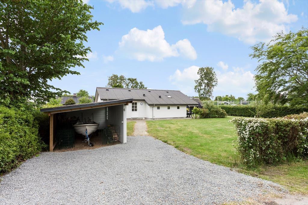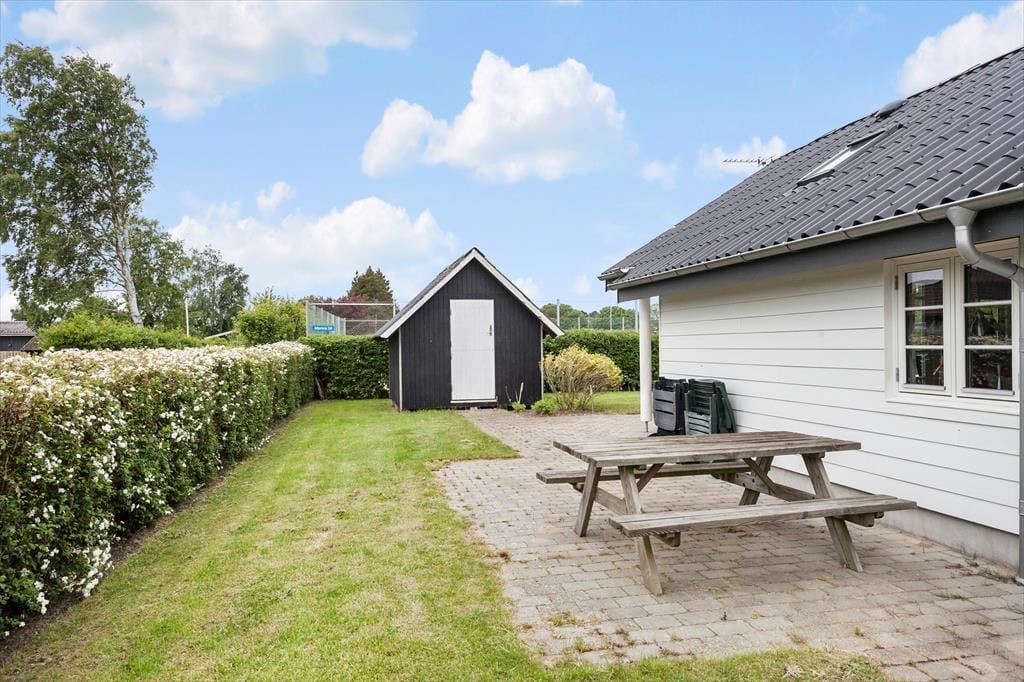 Haven omkring sommerhuset er en grøn oase, der indbyder til leg, afslapning og hyggelige stunder. Græsplænen omkranser huset og giver masser af plads til spil og aktiviteter for både børn og voksne. Bagerst på grunden står et anneks, der kan fungere som ekstra soveplads eller hyggeligt fristed for de mindste. Den delvist overdækkede terrasse er det perfekte sted at nyde sommeren, uanset om du vil grille, sole dig eller sidde i skyggen og nyde en kølig drink. Her kan du høre lyden af havet og føle sandet mellem tæerne, når du går de få skridt ned til stranden for en forfriskende dukkert.