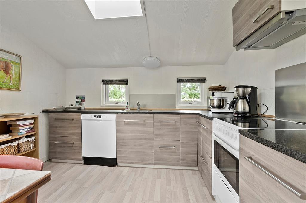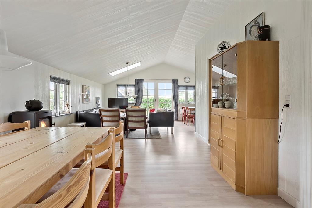 Sommerhuset er indrettet med sans for både hygge og komfort. Det åbne køkken er i direkte forbindelse med stuen, så du kan nyde selskabet, mens du kokkererer. I stuen kan du slå dig ned ved brændeovnen, der spreder varme og en stemning af ægte sommerhushygge på kølige aftener. Spisepladsen er rummelig og indbyder til lange middage og sjove brætspilsaftener. Fra stuen er der udgang til en delvist overdækket fliseterrasse, som vinker sig om på siden af huset. Her kan du nyde udsigten til haven og mærke brisen fra havet, mens du drikker din morgenkaffe eller læser en god bog.