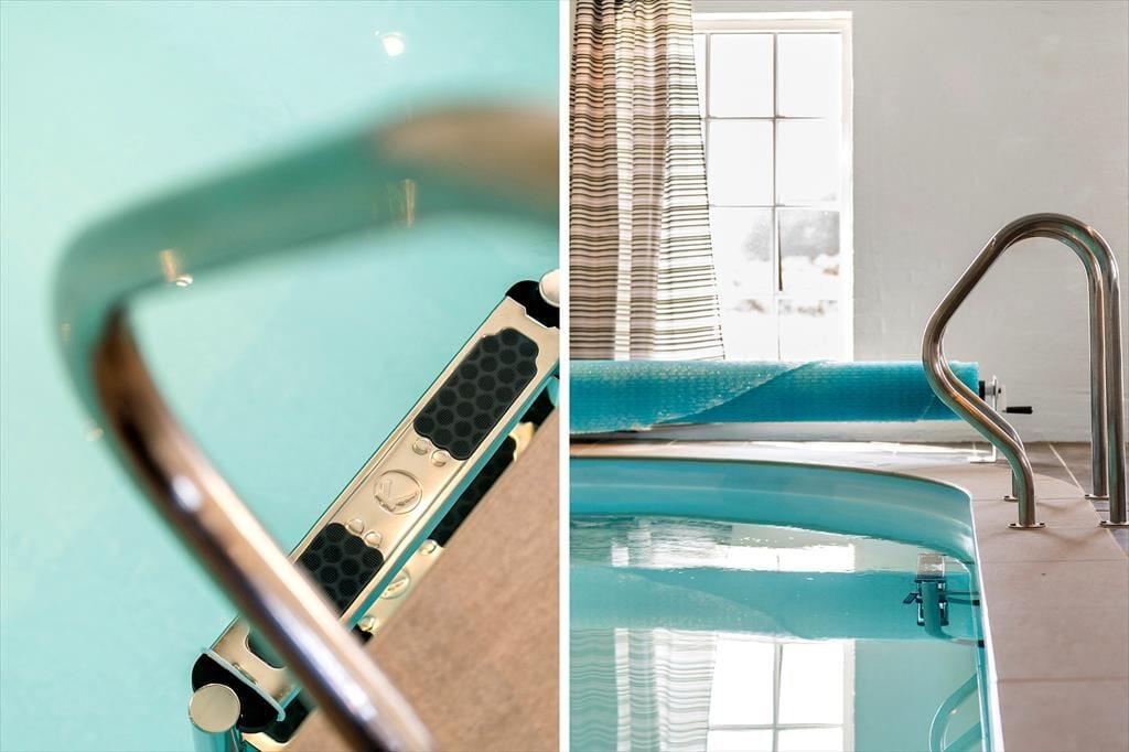 Trappen fra køkkenet er 70 cm bred og trappen fra gang ved poolrum op i stuen måler 88 cm.