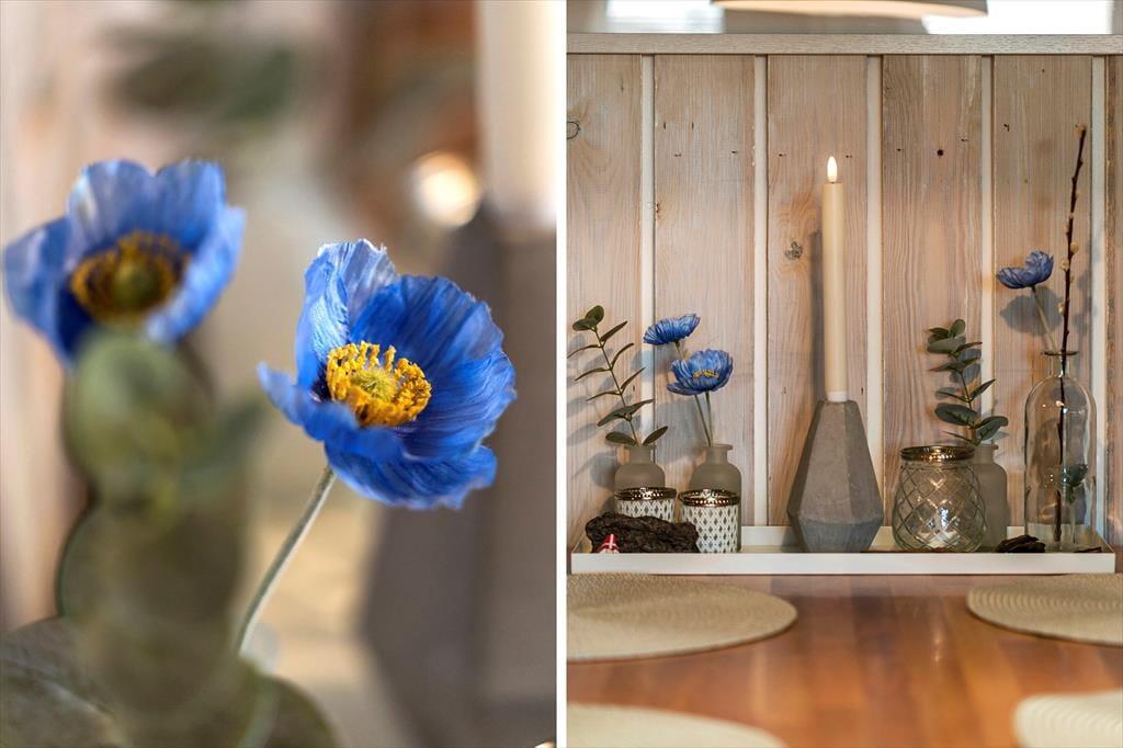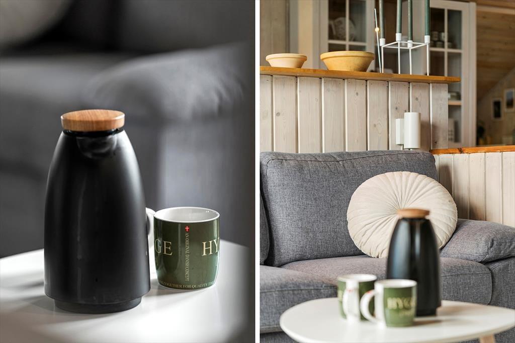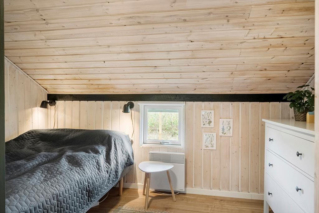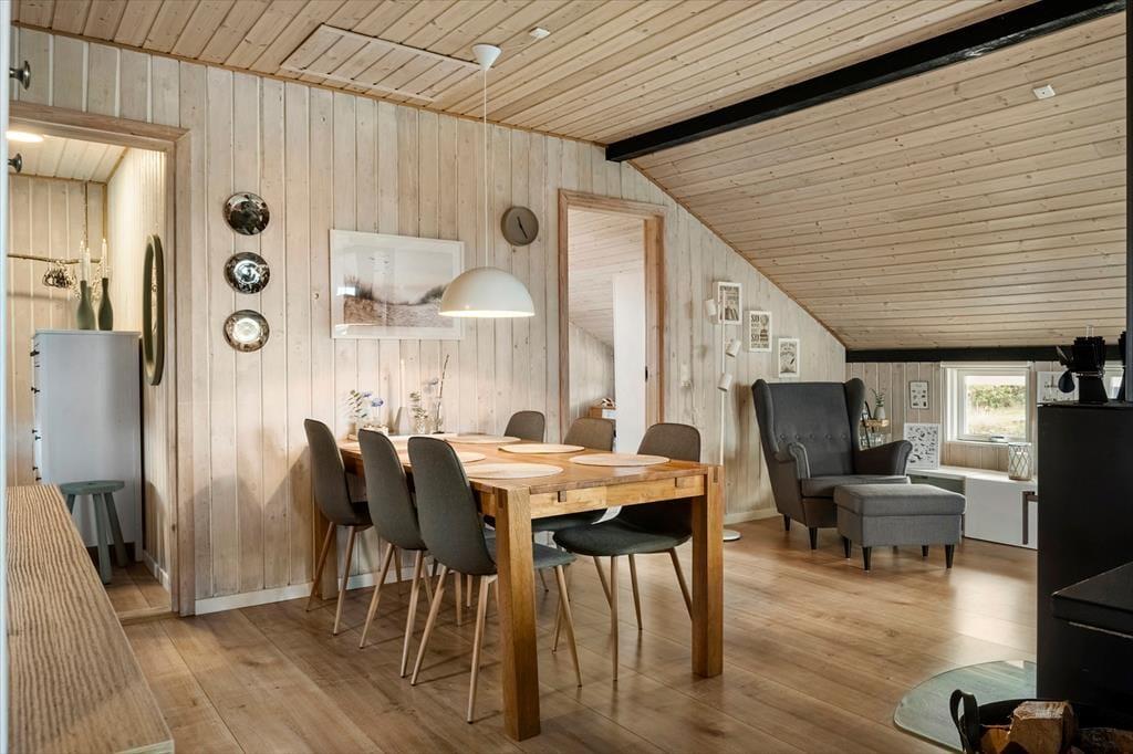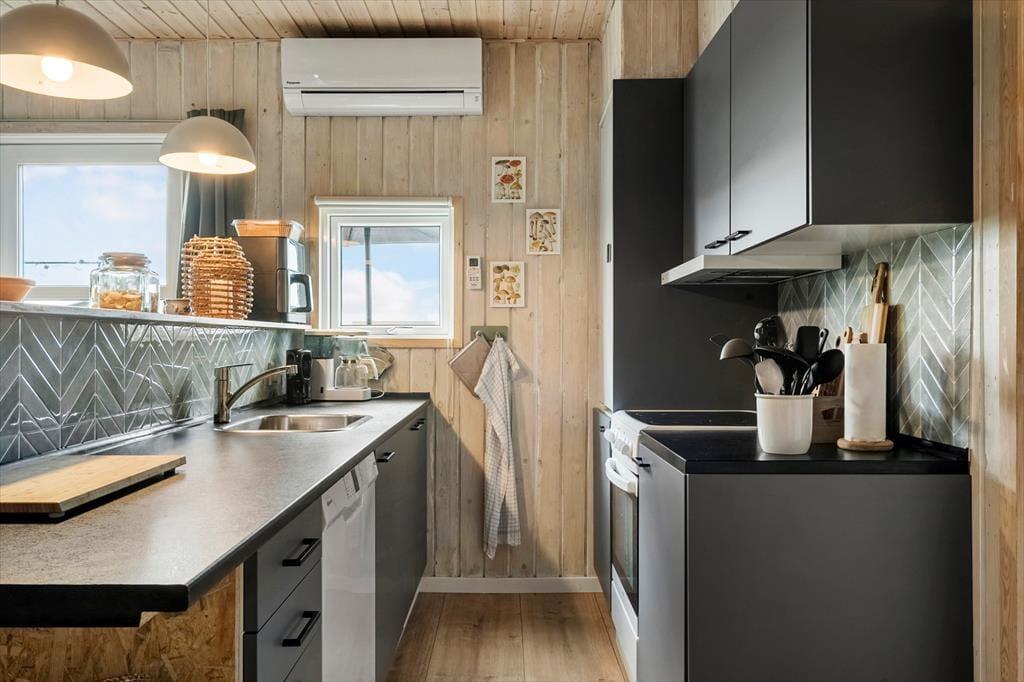 Sommerhuset er moderne indrettet med lyse og rummelige værelser, der skaber en indbydende atmosfære. Det veludstyrede køkken ligger i åben forbindelse med stuen, hvilket gør det nemt at samles til fælles måltider og hyggelige stunder. Brændeovnen i stuen sørger for varme og hygge på kølige dage, mens store vinduer lukker masser af naturligt lys ind og giver udsigt til de naturskønne omgivelser.