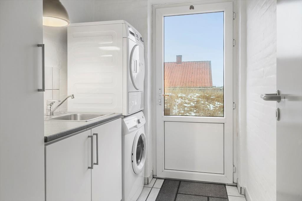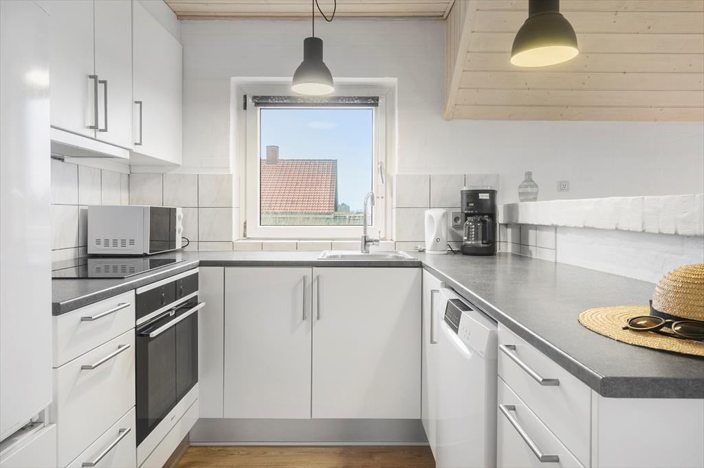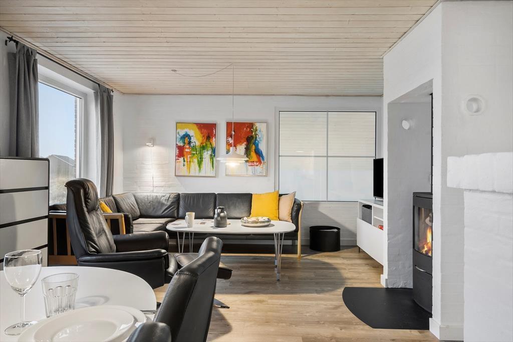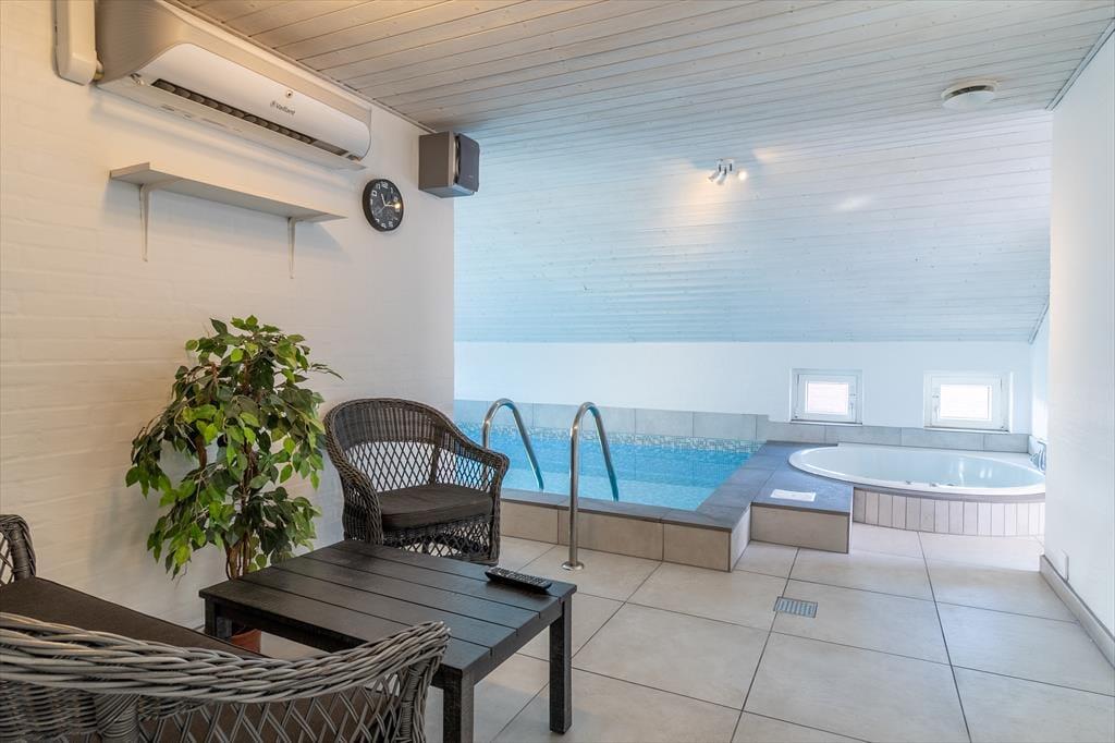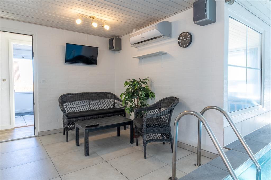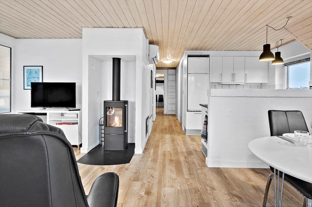 Indendørs venter der jer noget ganske særligt: en privat pool afdeling med swimmingpool, spa og hyggekrog, hvor både store og små kan tilbringe mange timers leg og afslapning – uanset vejret. Poolens dybde er 1,25 meter, hvilket gør den ideel til hele familien. Når I har fået nok af vandpjaskeri, kan I slappe af i stuen, hvor brændeovnen spreder varme og stemning, eller nyde et måltid i det åbne opholdsrum, hvor køkken og stue er forenet i ét. Indretningen er lys og imødekommende, og hele huset emmer af ferie og frihed. Det er nemt at finde sig til rette her – uanset om I er to, fire eller flere, der nyder hinandens selskab.